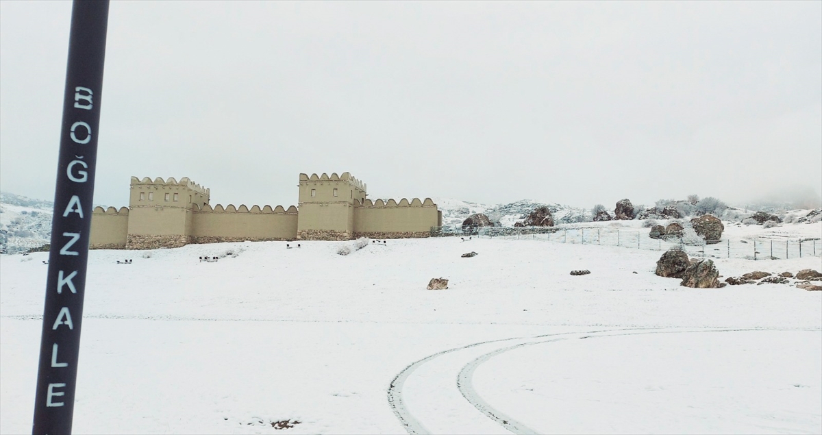 Kar yağışı nedeniyle ilçedeki binlerce yıllık geçmişe sahip Hattuşa Ören Yeri de beyaza büründü.
