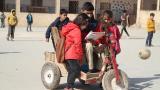 Küçük Cesim, babasının tahtadan yaptığı tekerlekli sandalyeyle okula gidiyor
