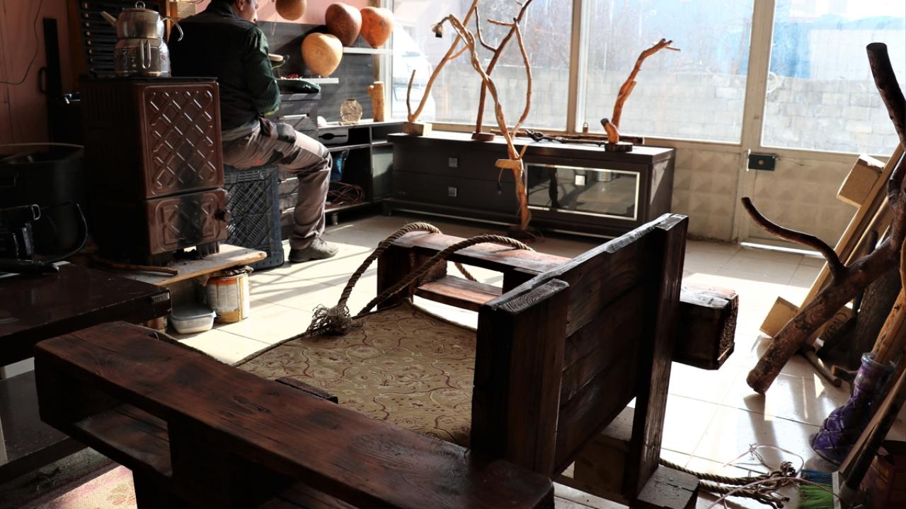 Atık malzemelerden avize, oturma gurubu, kitaplık, tespih, abajur gibi eşyalar tasarlayan Kahraman, bu ürünleri satarak ailesini geçindiriyor.