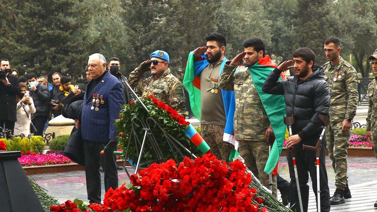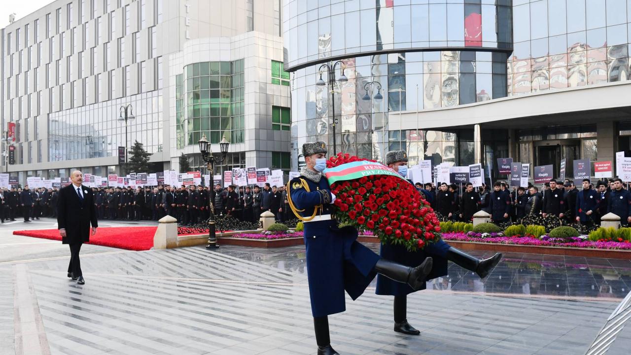 Ana Feryadı Anıtı`nda sona eren yürüyüşün ardından düzenlenen törende Cumhurbaşkanı Aliyev, anıta çelenk bıraktı.