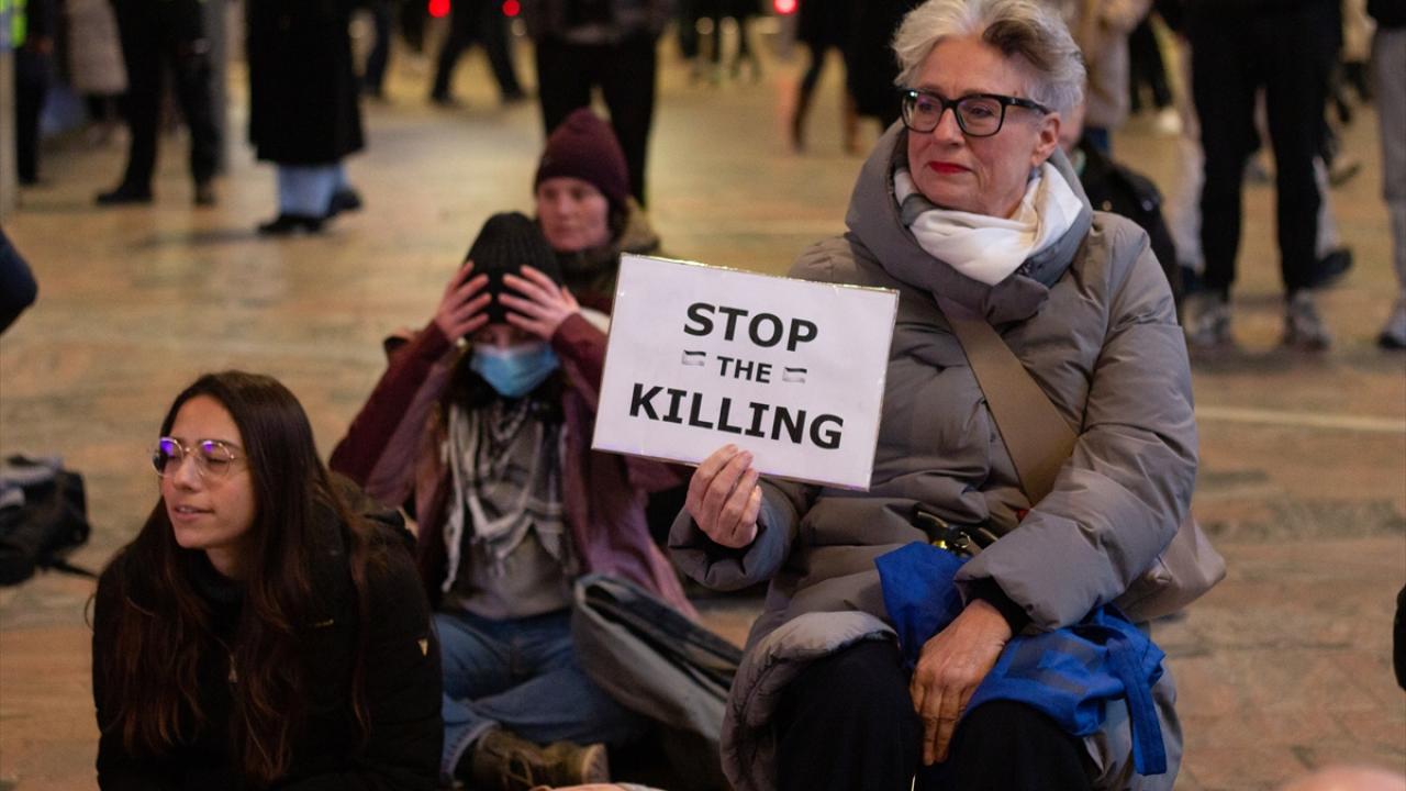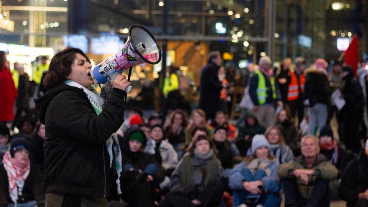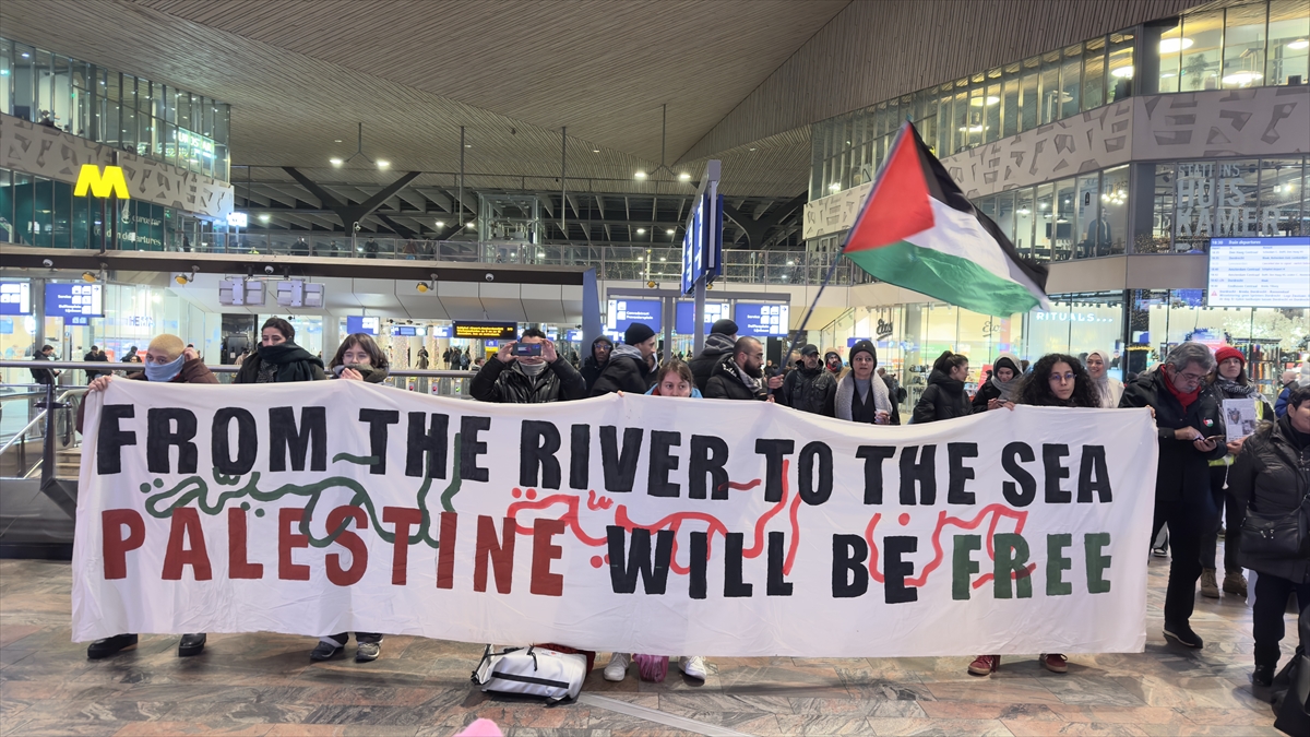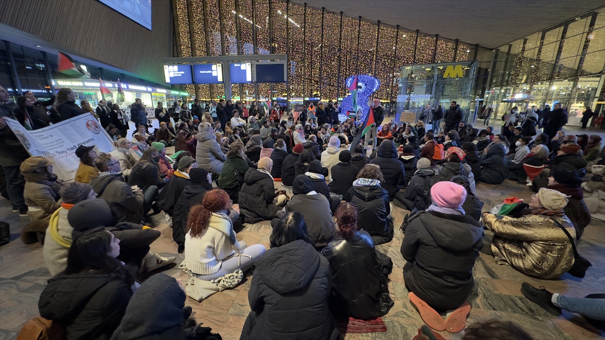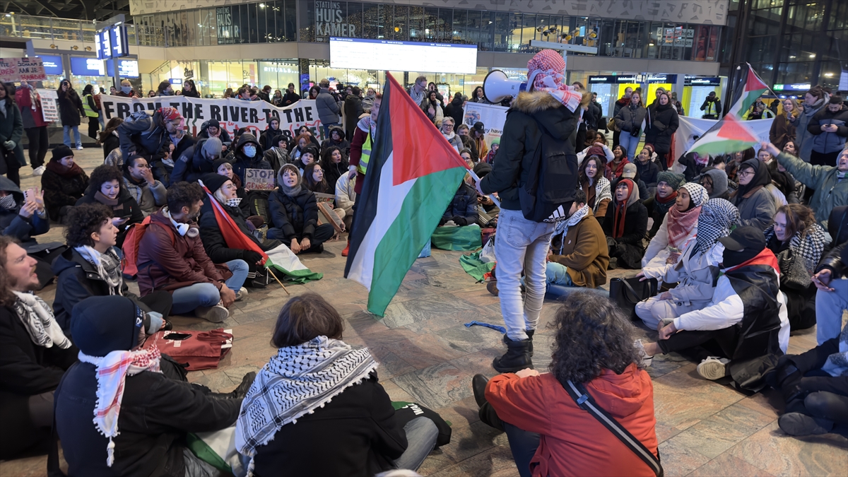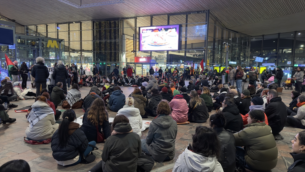 Ülkenin en büyük kentlerinden Rotterdam`daki merkez tren istasyonunda toplanan göstericiler, Filistin bayrakları taşıyarak "ateşkes" çağrısı yaptı.