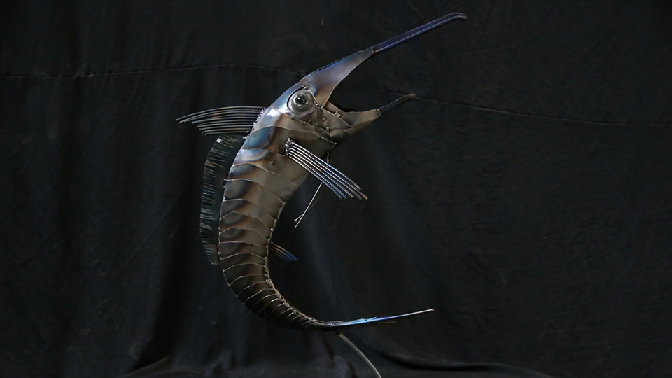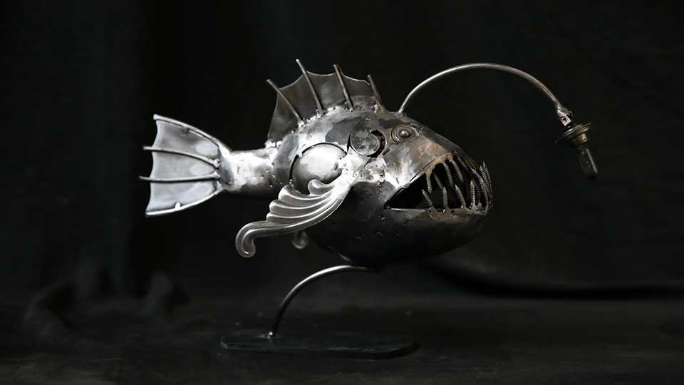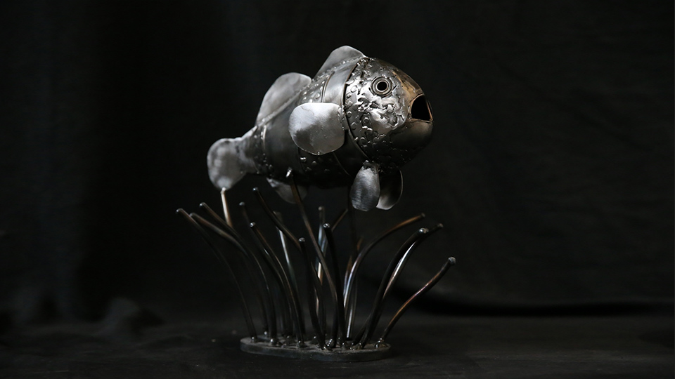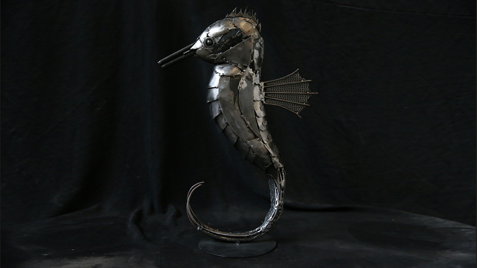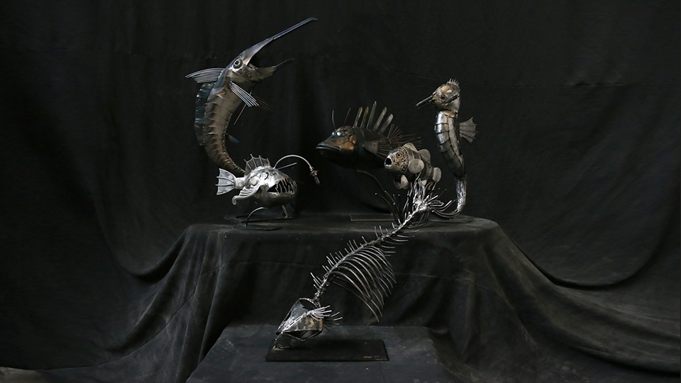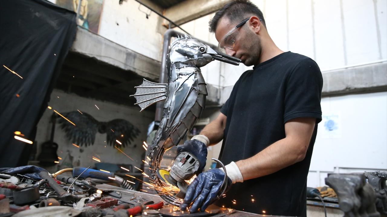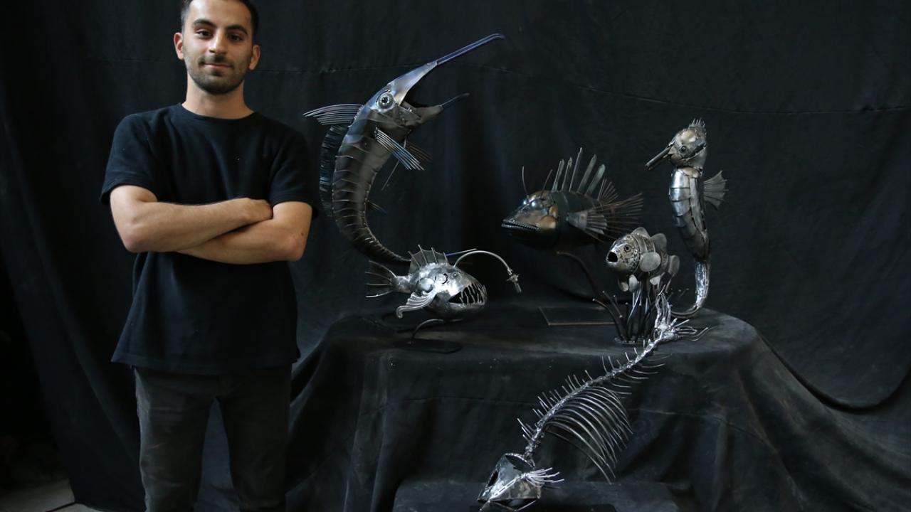 Eskişehir'de yaşayan metal heykel sanatçısı 22 yaşındaki Mücahit Diyar Arız, baba mesleği olan balıkçılıktan ilham alarak hurda metalleri kullanarak deniz canlılarının heykellerini oluşturdu.