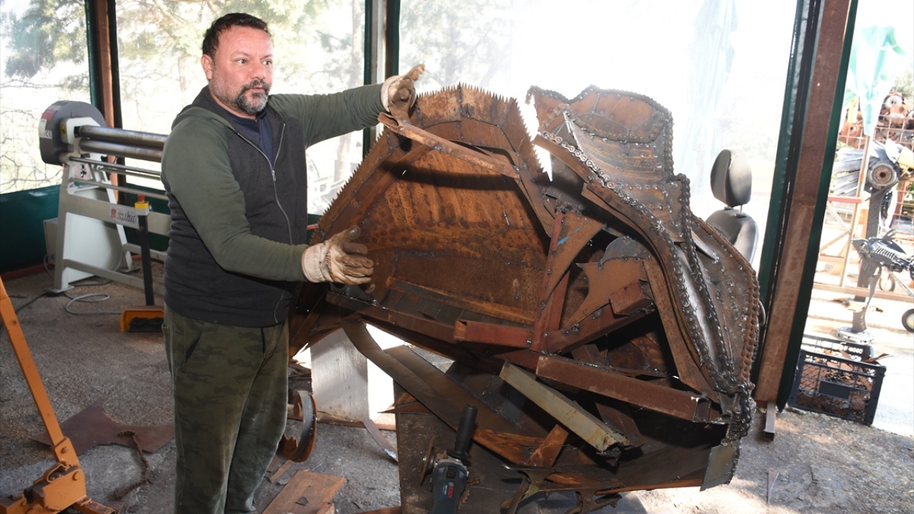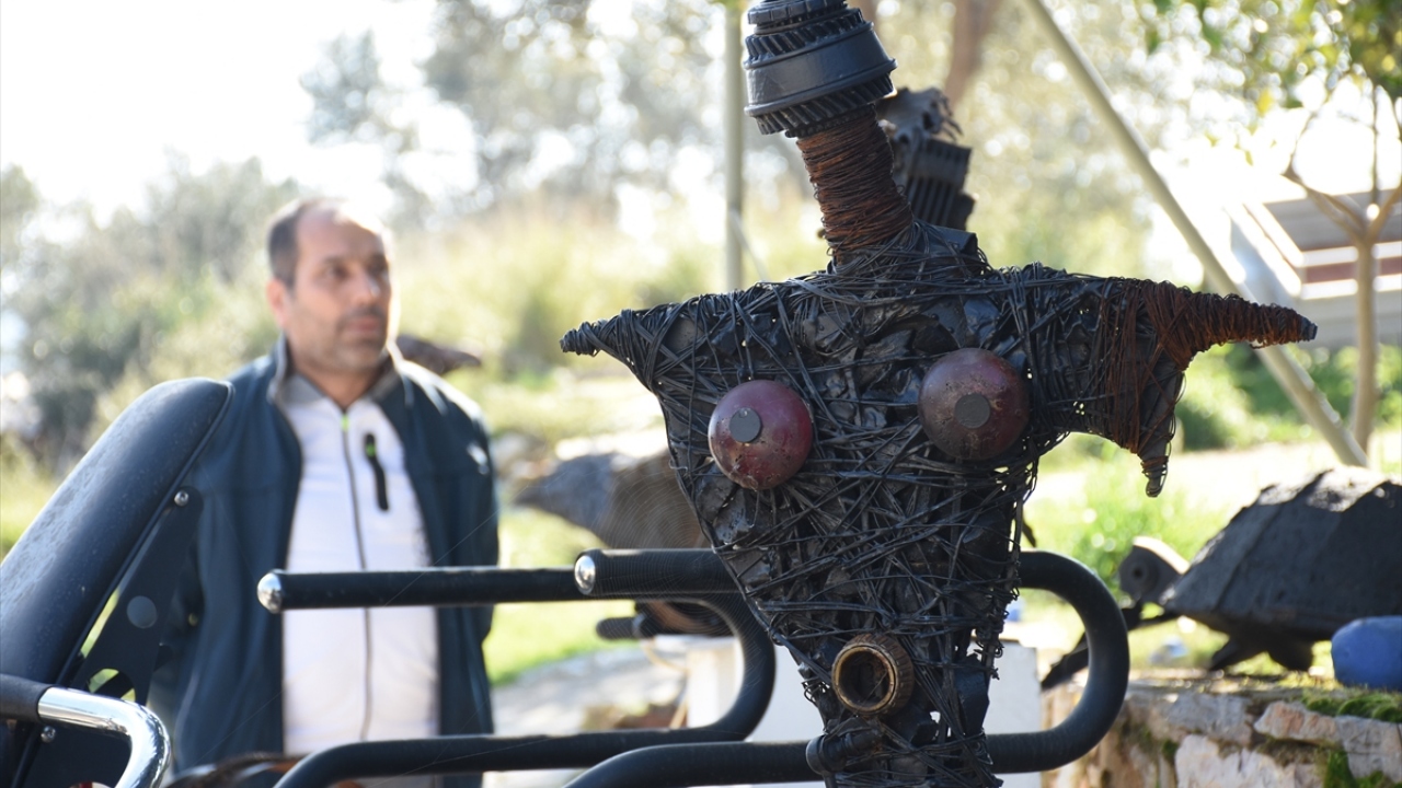 Muğla'nın Bodrum ilçesinde, ressam ve heykeltıraş Rıfat Koçak, 25 yıldır hurdaya ayrılmış otomobil, motosiklet ve bisiklet parçalarından heykeller yapıyor.