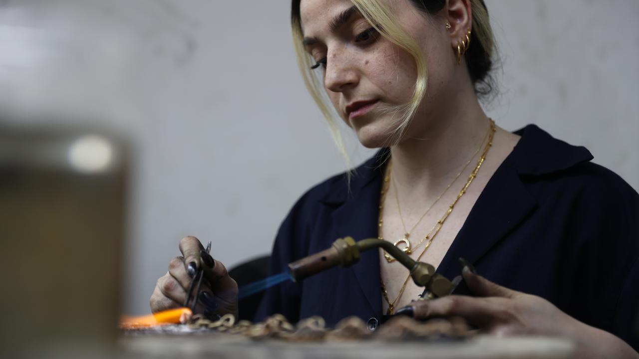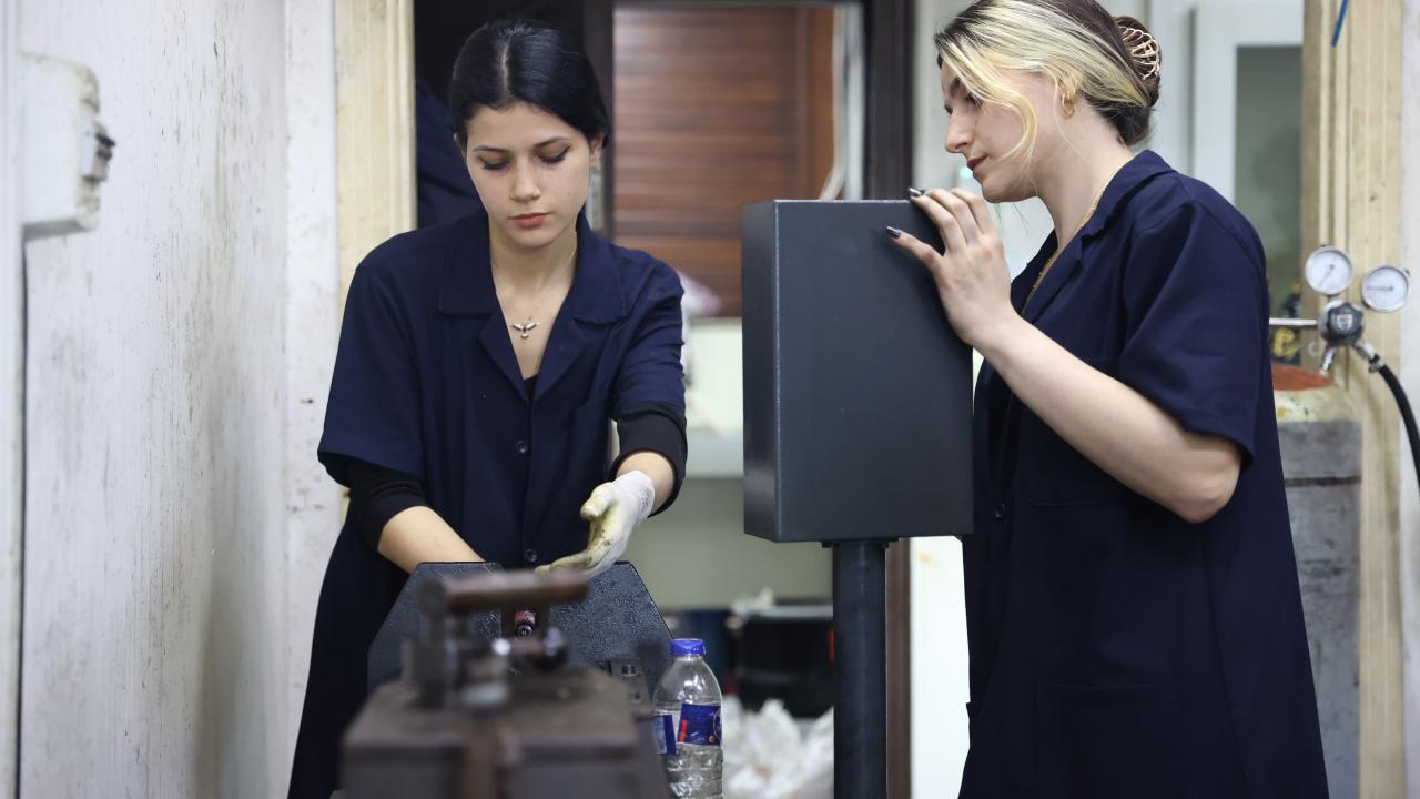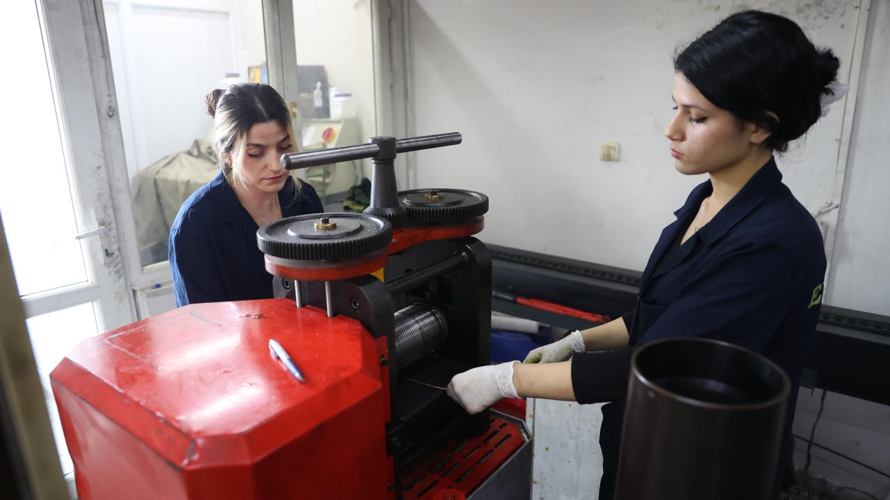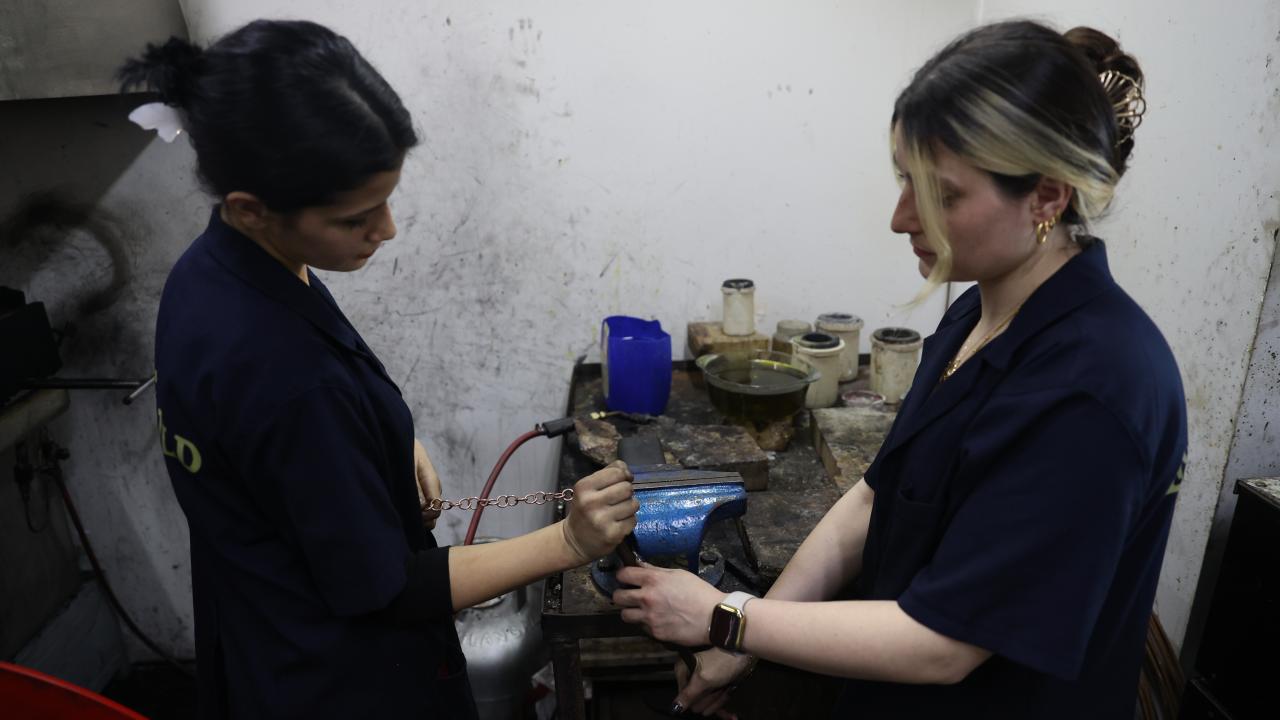 Mersin'de çırak olarak başladıkları atölyede kuyumculuğu öğrenen iki genç kadın, yüksek sıcaklıkta erittikleri hurda ve külçe altınlardan özgün tasarımlar yapıyor.