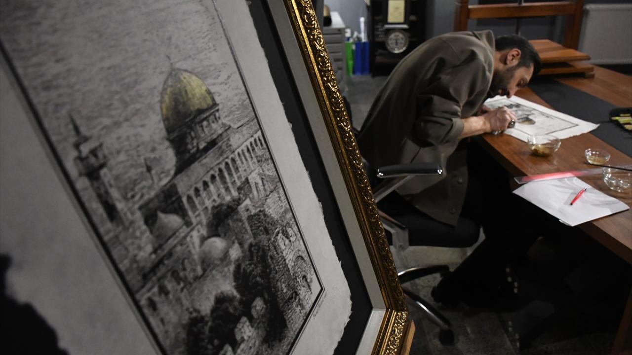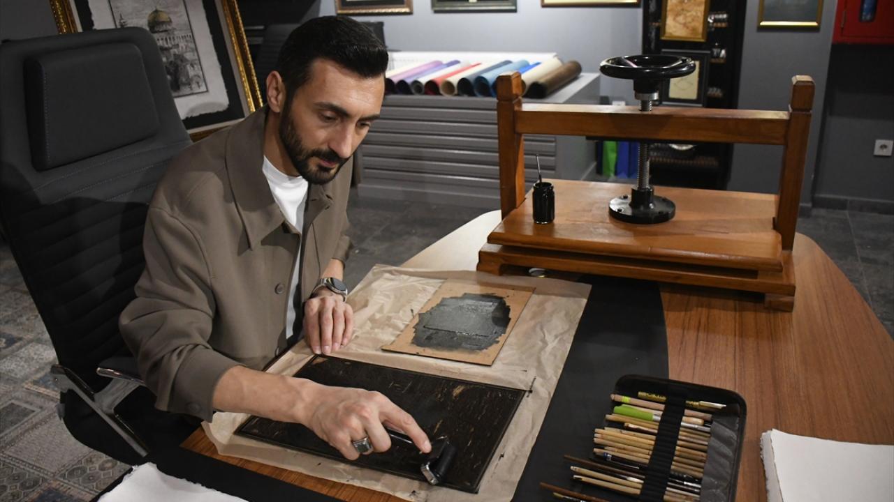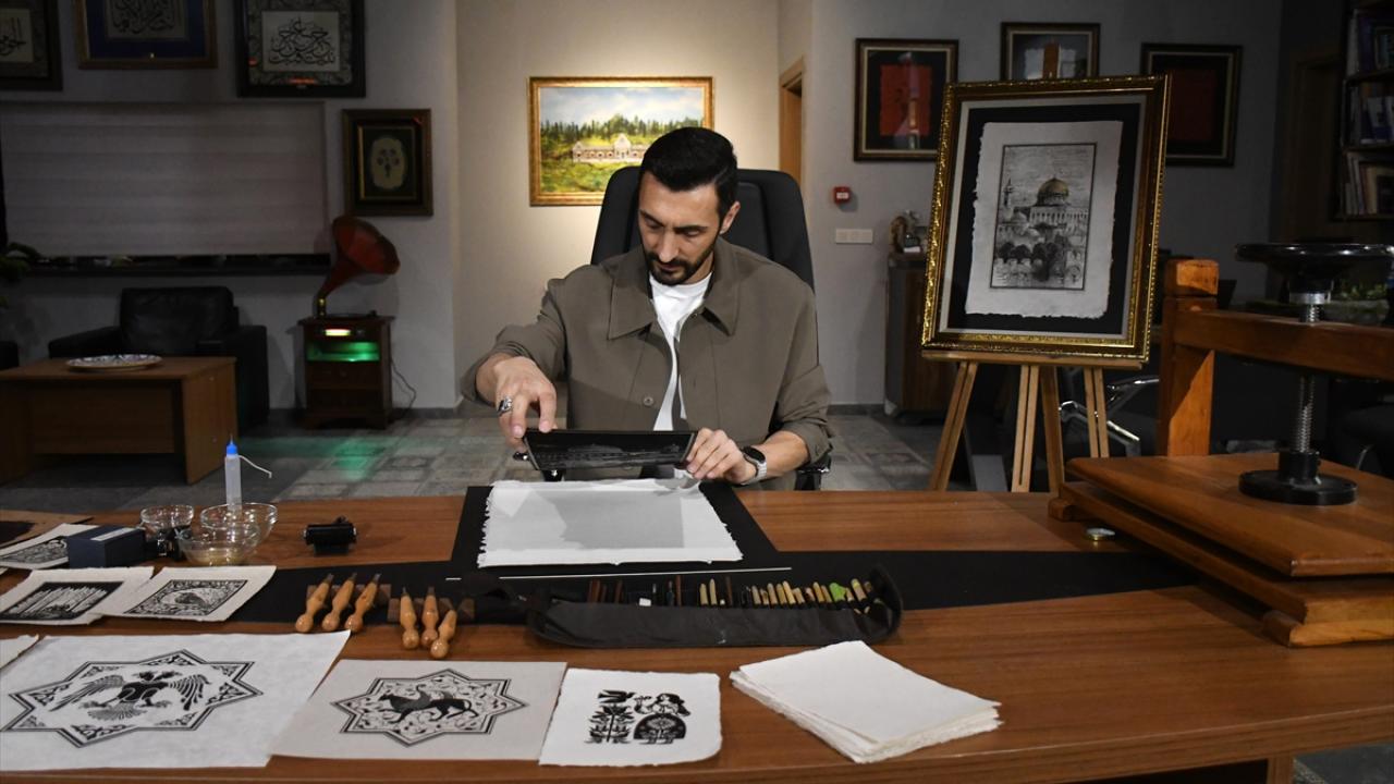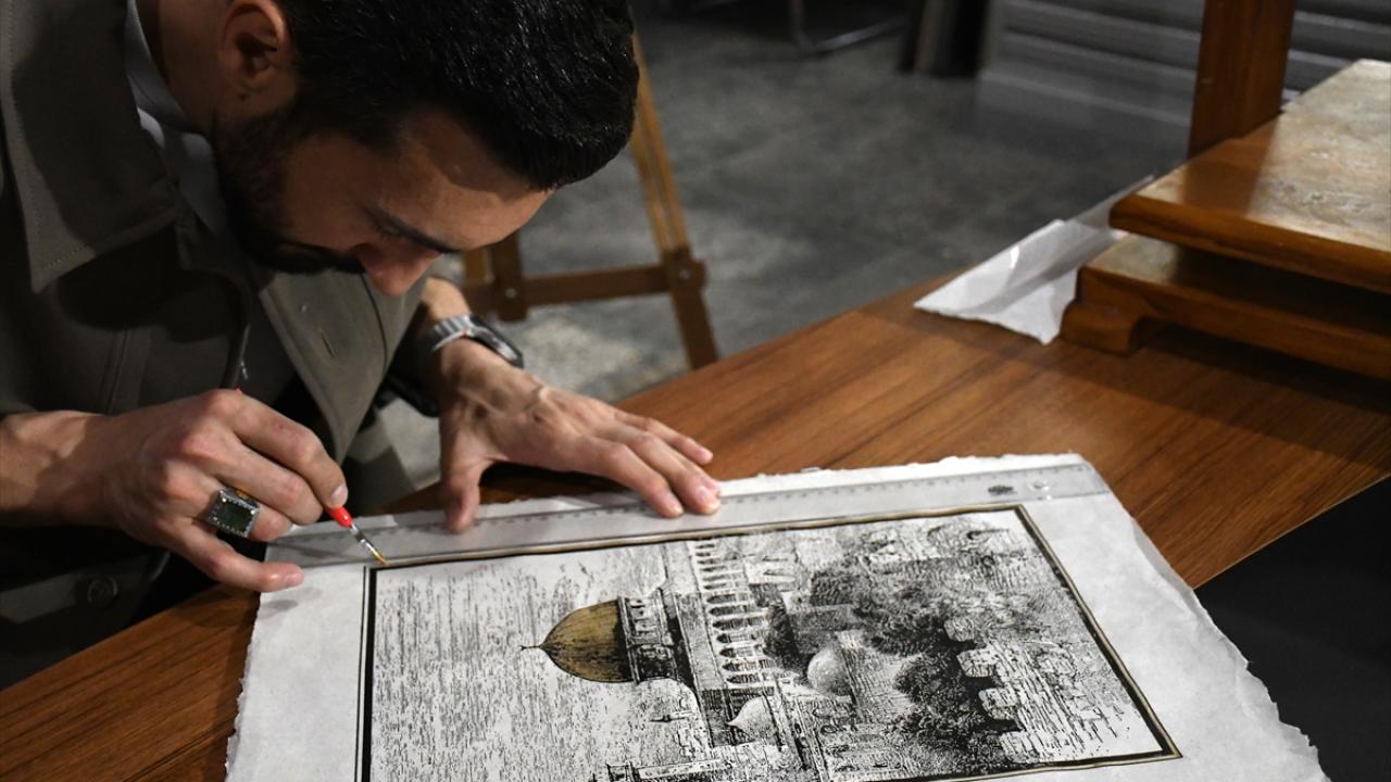 Düzce Üniversitesi (DÜ) Öğretim Üyesi Doç. Dr. Yusuf Parlak, İsrail tarafından 28 Şubat'tan bu yana ibadete kapalı tutulan, Müslümanların ilk kıblesini gündeme getirmek amacıyla el yapımı kağıtlar üzerinde gravür baskı yöntemiyle Mescid-i Aksa tabloları hazırlıyor.