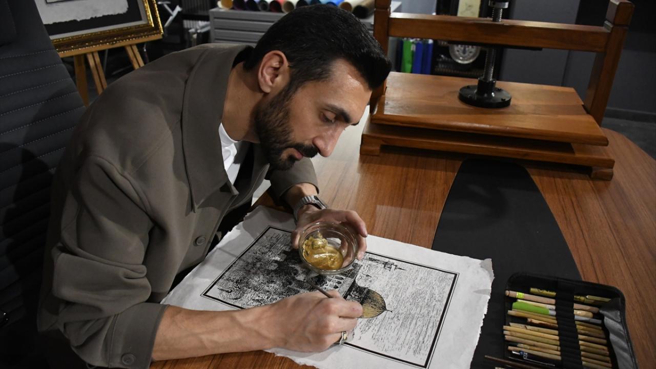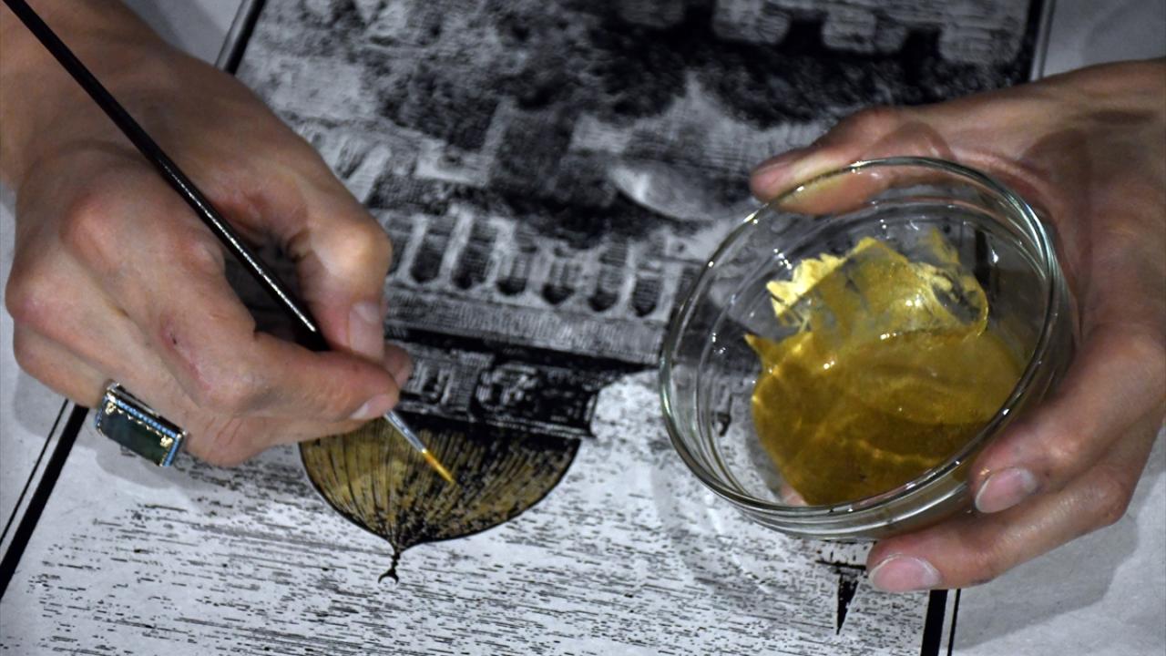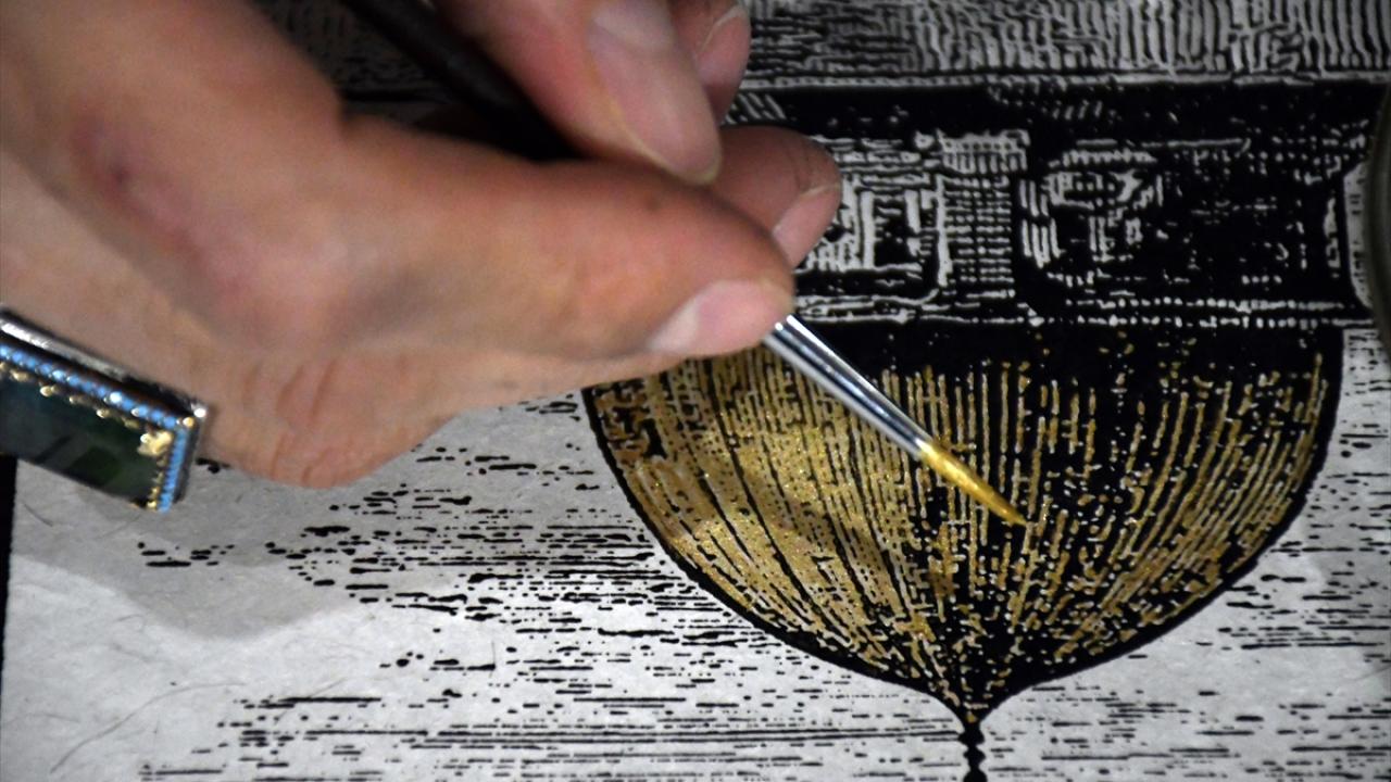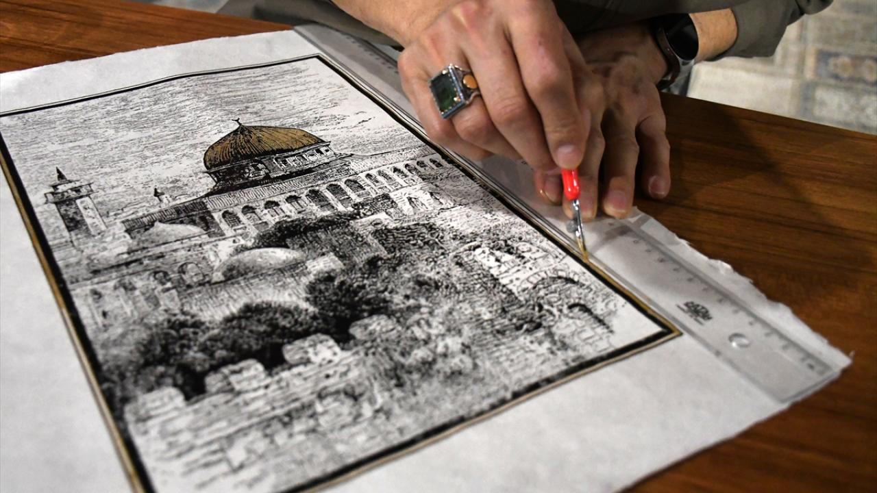 İlk olarak ahşap kalıp üzerinde çalışmanın gravürünün oyularak çıkarıldığını belirten Parlak, "Sonrasında gravür baskı boyalarıyla el yapımı kağıtlar üzerine bunun baskısını gerçekleştirdik. Kubbe kısmında 24 ayar gerçek altın kullandık. Böylelikle bin yıl da geçse Mescid-i Aksa gelecek nesillere bu kağıtlarla aktarılabilecek." diye konuştu.