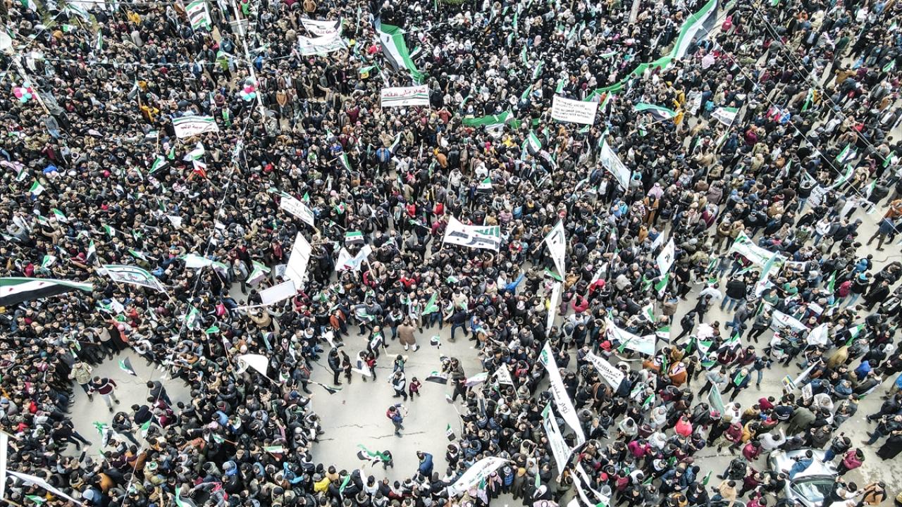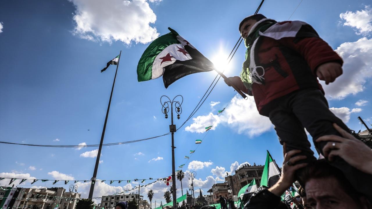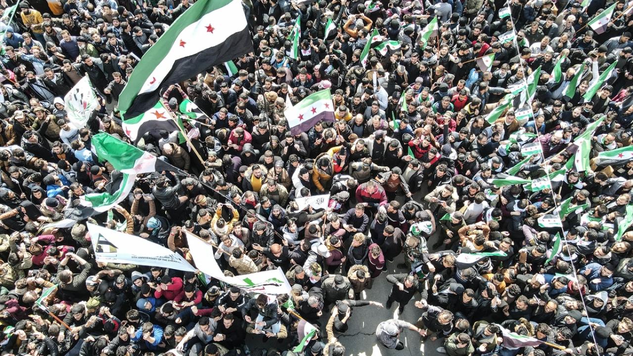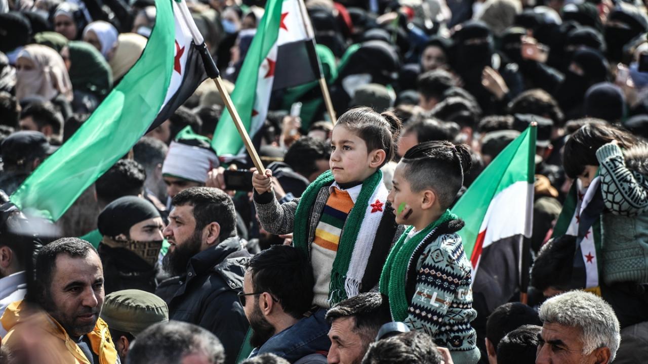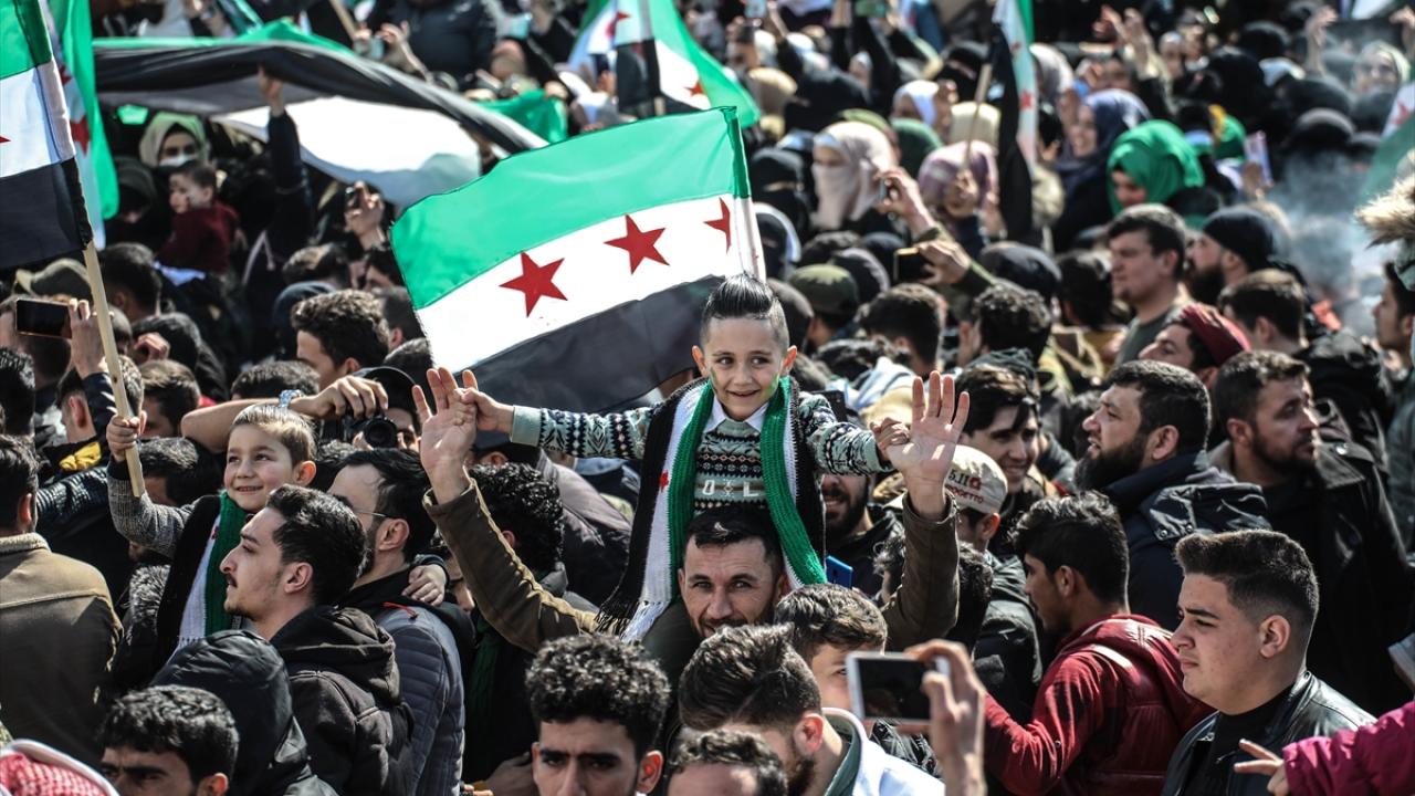 Suriye'nin İdlib ili ve Türkiye'nin teröristlerden arındırdığı Fırat Kalkanı Harekatı ve Barış Pınarı Harekatı bölgelerinde iç savaşın 12. yılına girmesi nedeniyle gösteriler düzenlendi.
