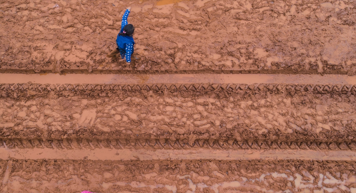 İnsanlar hava şartları nedeniyle çadırlarından çıkmamaya çalışırken, her şeyden habersiz çocuklar ise ailelerinin ikazlarına rağmen, çamurlu sokaklarda zaman geçiriyor.