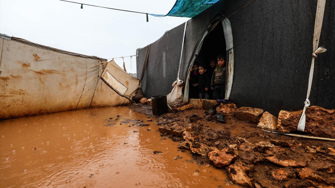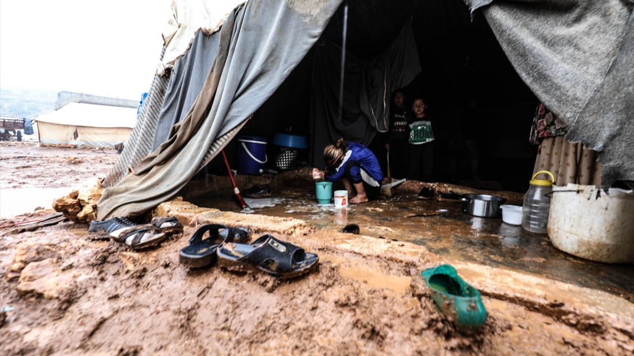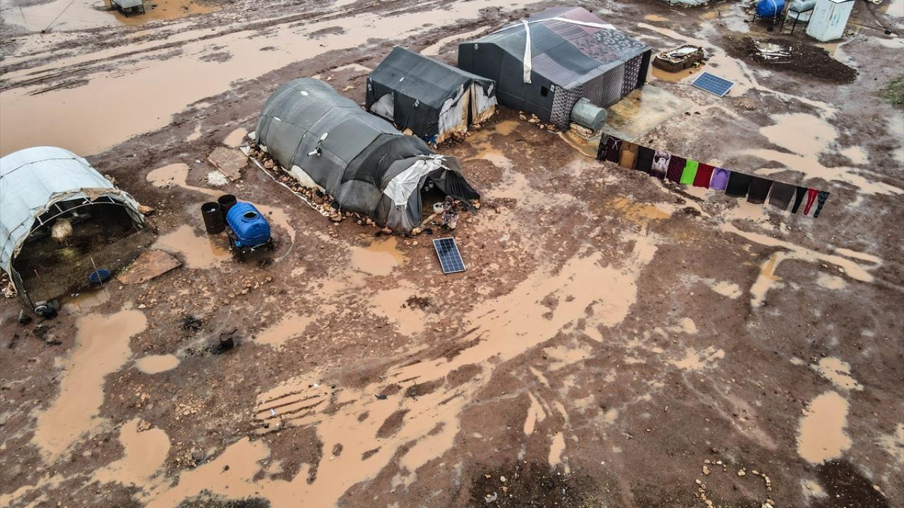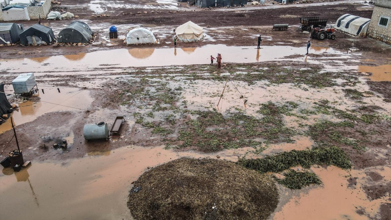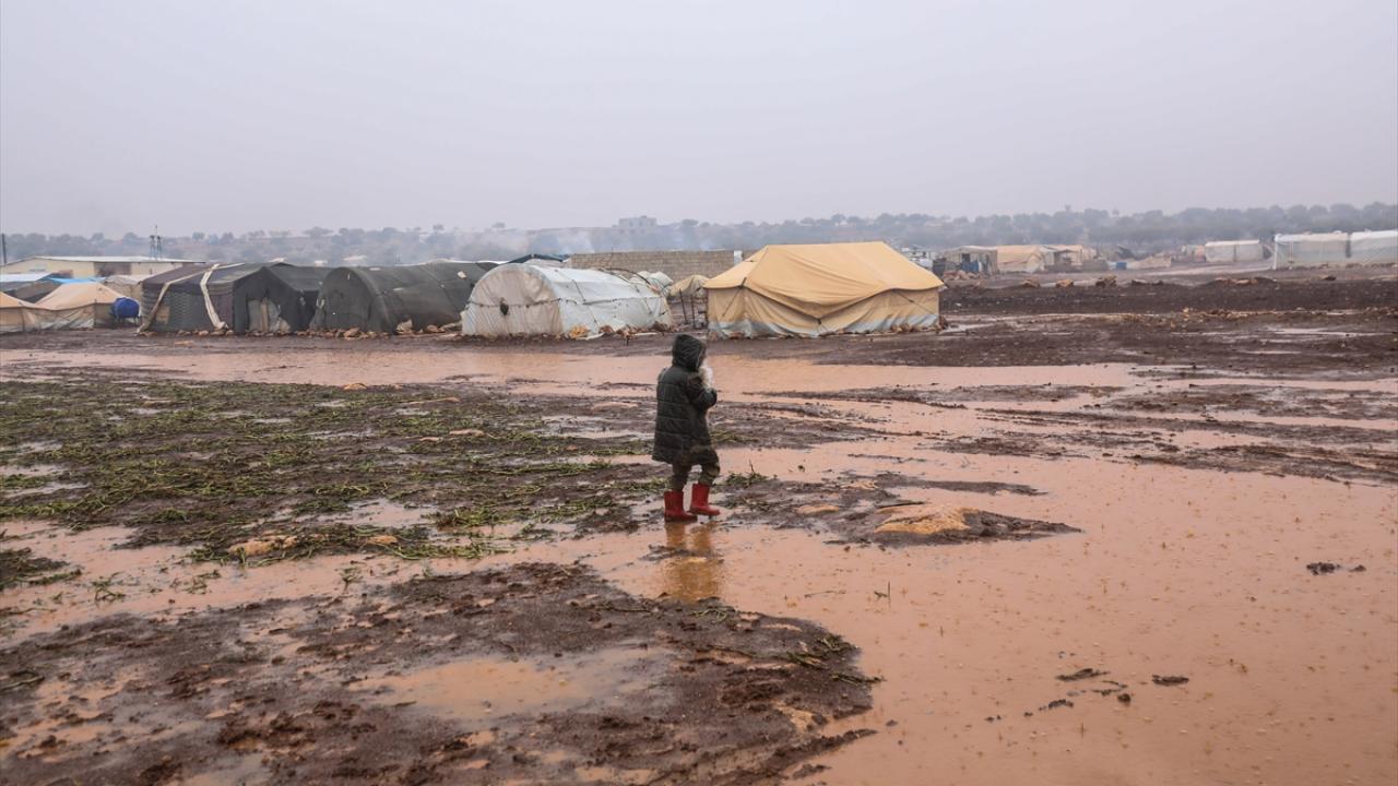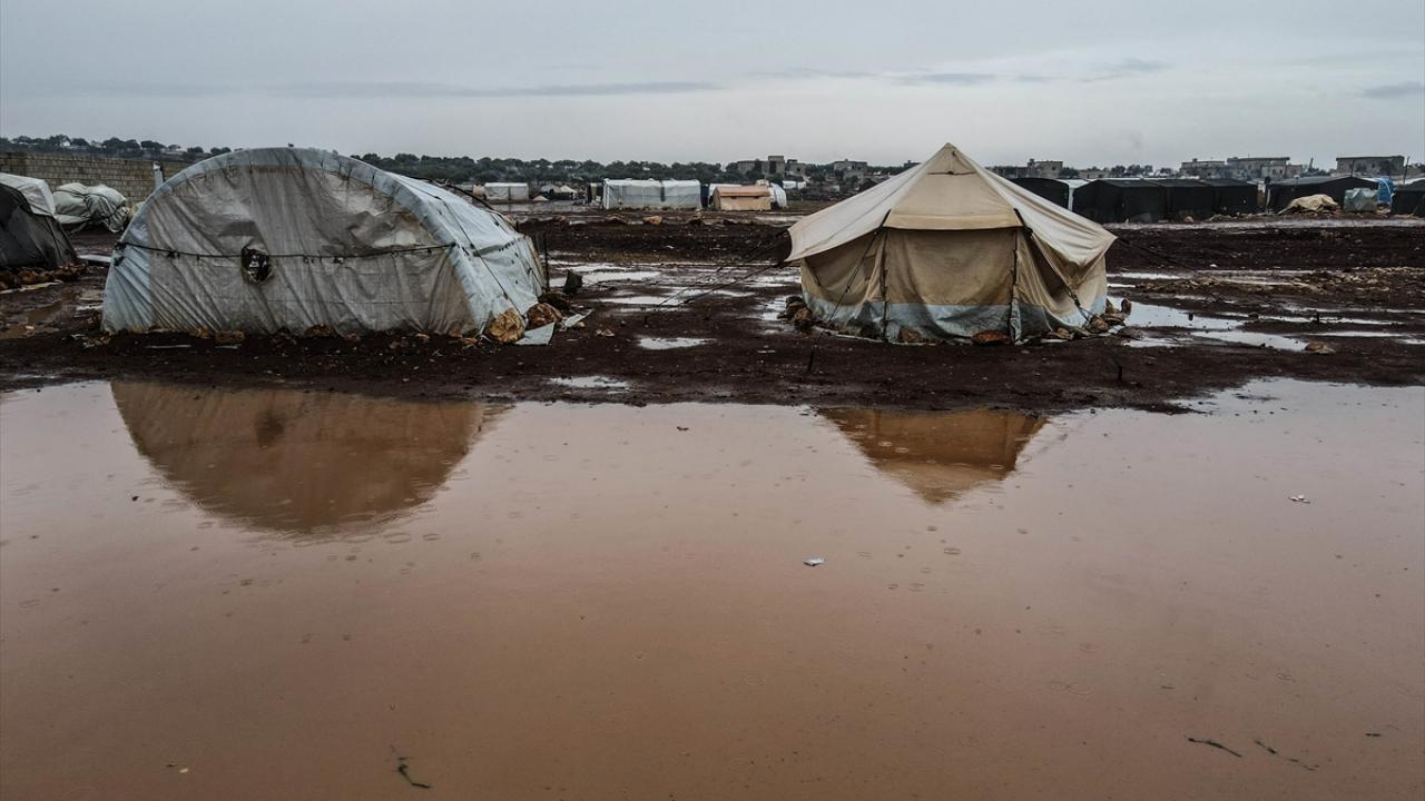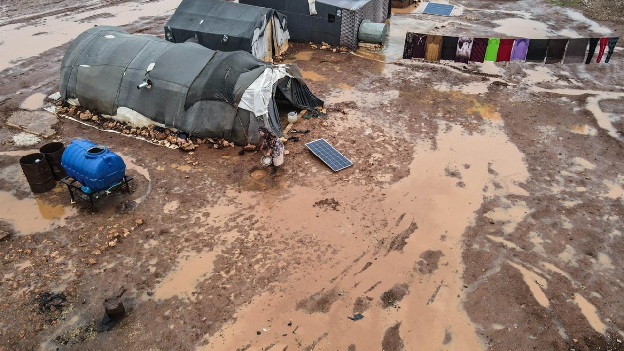 Suriye'nin kuzeybatısındaki İdlib'de etkisini gösteren şiddetli yağış, Türkiye sınırına yakın bölgelerindeki çadır kamplarında yaşayan binlerce sivilinin hayatını olumsuz etkiledi.