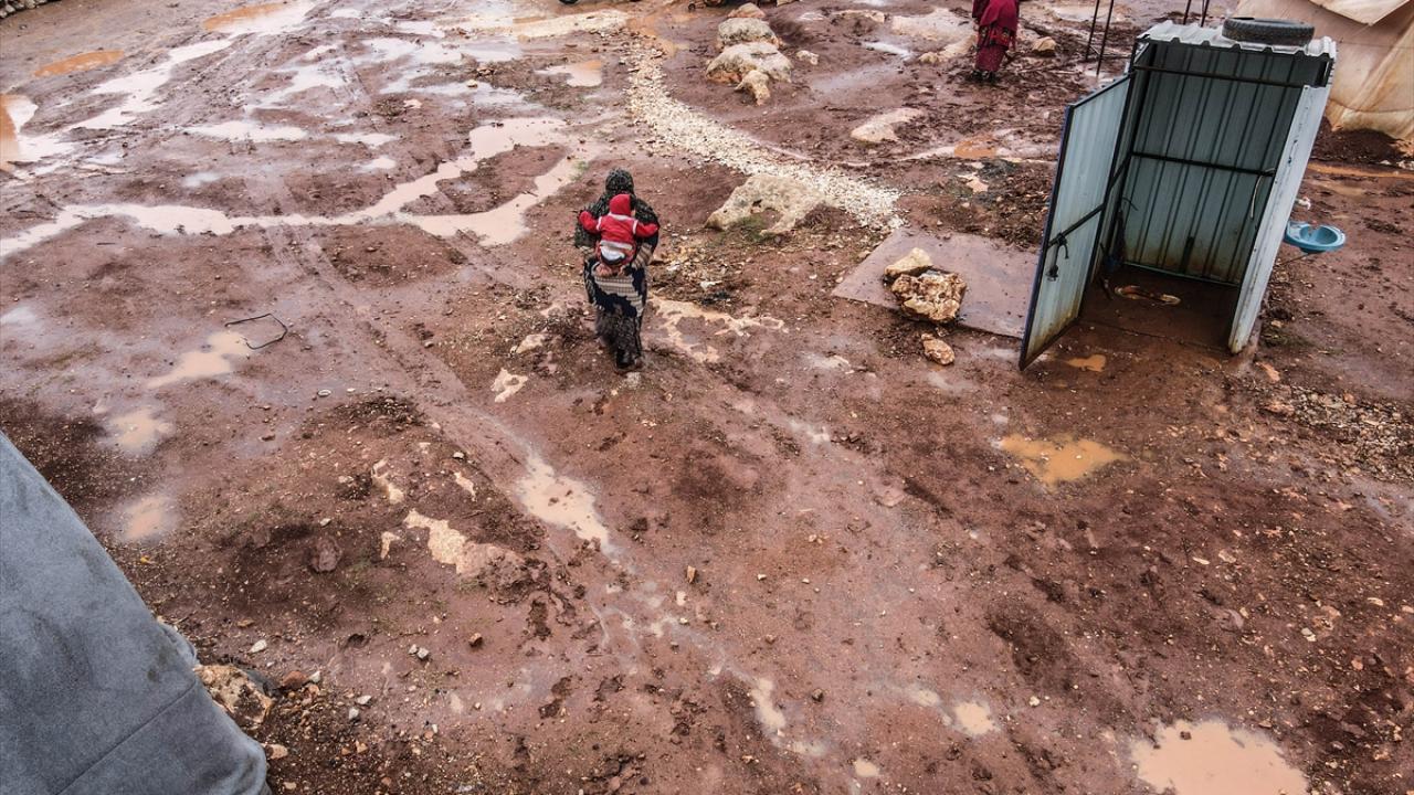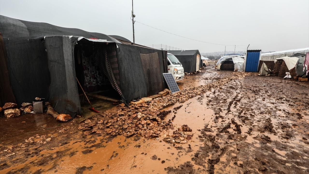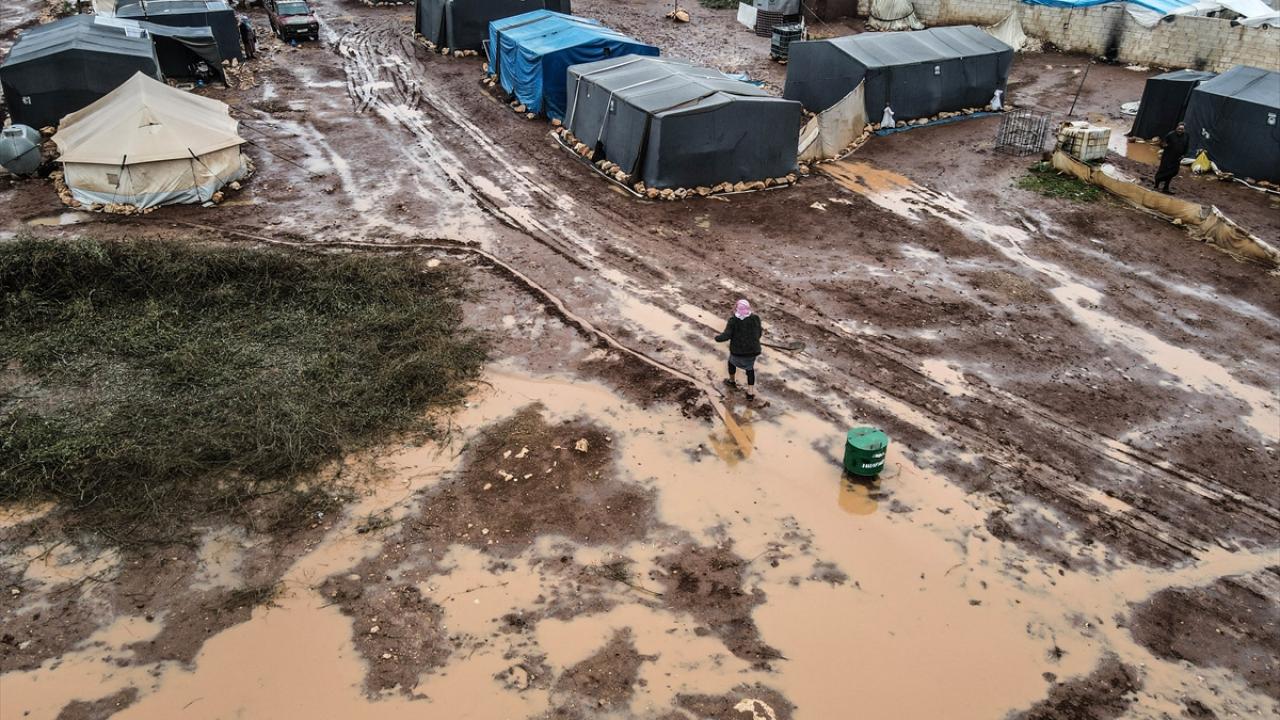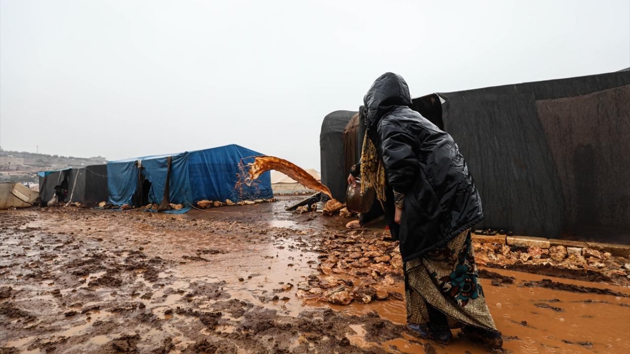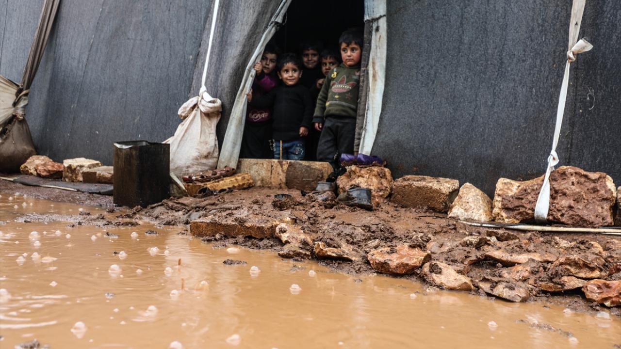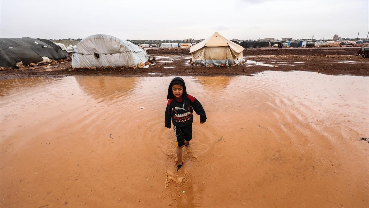 Suriye'nin kuzeybatısındaki İdlib'de etkisini gösteren şiddetli yağış, Türkiye sınırına yakın bölgelerindeki çadır kamplarında yaşayan binlerce sivilinin hayatını olumsuz etkiledi.