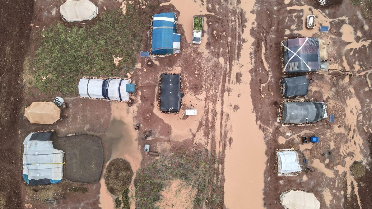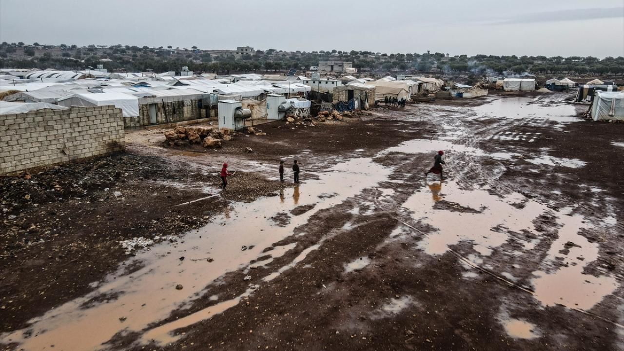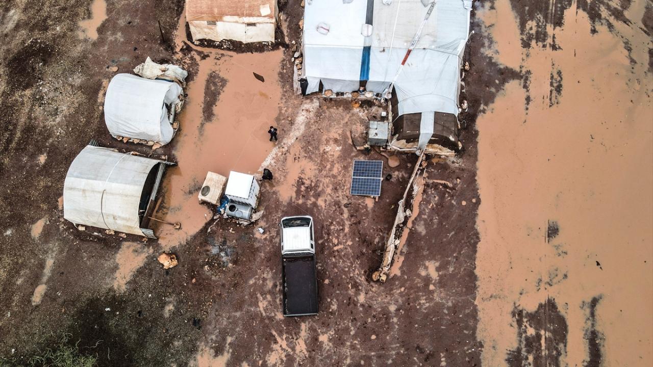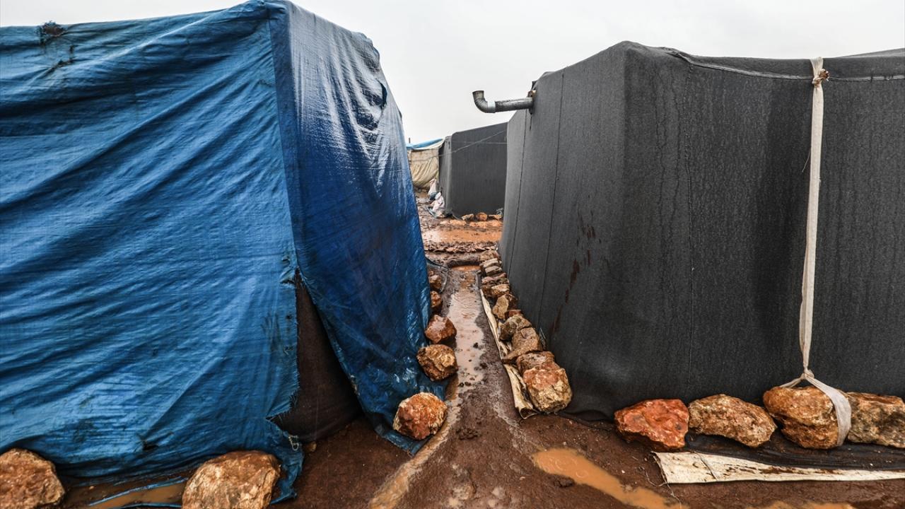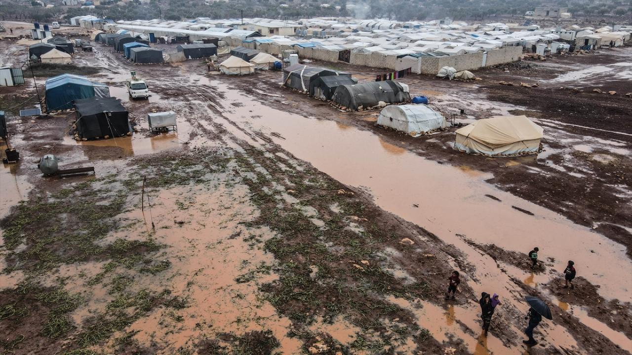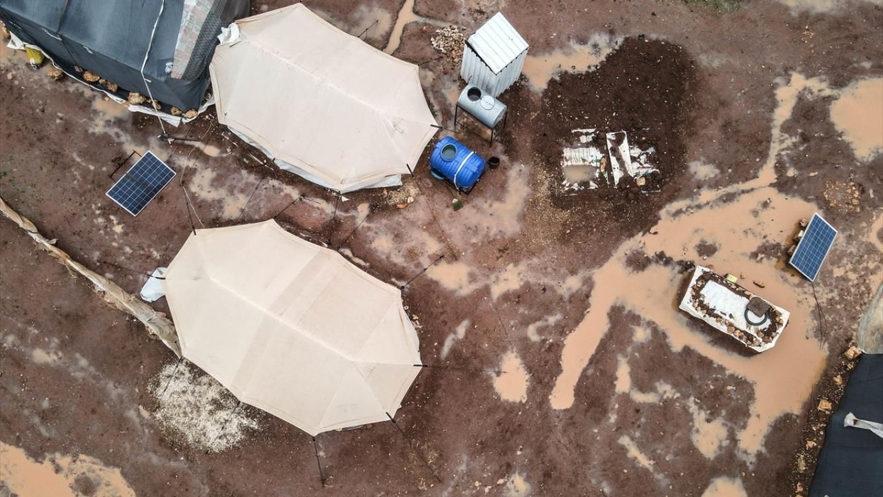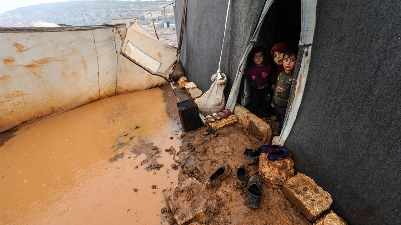 Suriye'nin kuzeybatısındaki İdlib'de etkisini gösteren şiddetli yağış, Türkiye sınırına yakın bölgelerindeki çadır kamplarında yaşayan binlerce sivilinin hayatını olumsuz etkiledi.