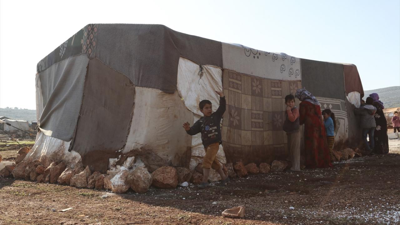Suriye'de Beşşar Esed rejiminin saldırılarından kaçıp Türkiye sınırındaki kamplara sığınan İdlibli aileler, kış şartlarından zarar gören çadırlarını iğne iplikle onararak, soğuk ve yağmura karşı güçlendiriyor.