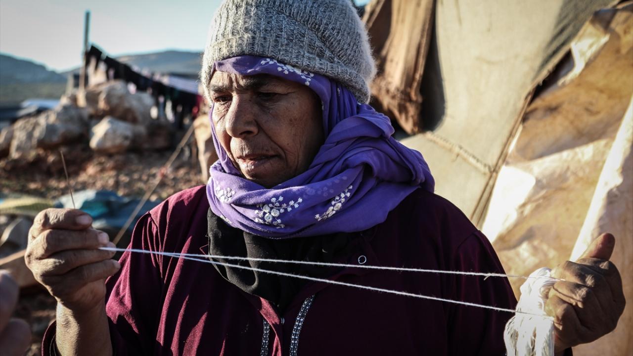 Aileleriyle İdlib`deki kamplara sığınan kadınlar ellerine aldıkları iğne, iplik ve çeşitli malzemelerle zarar gören çadırlarına yama yapıyor.