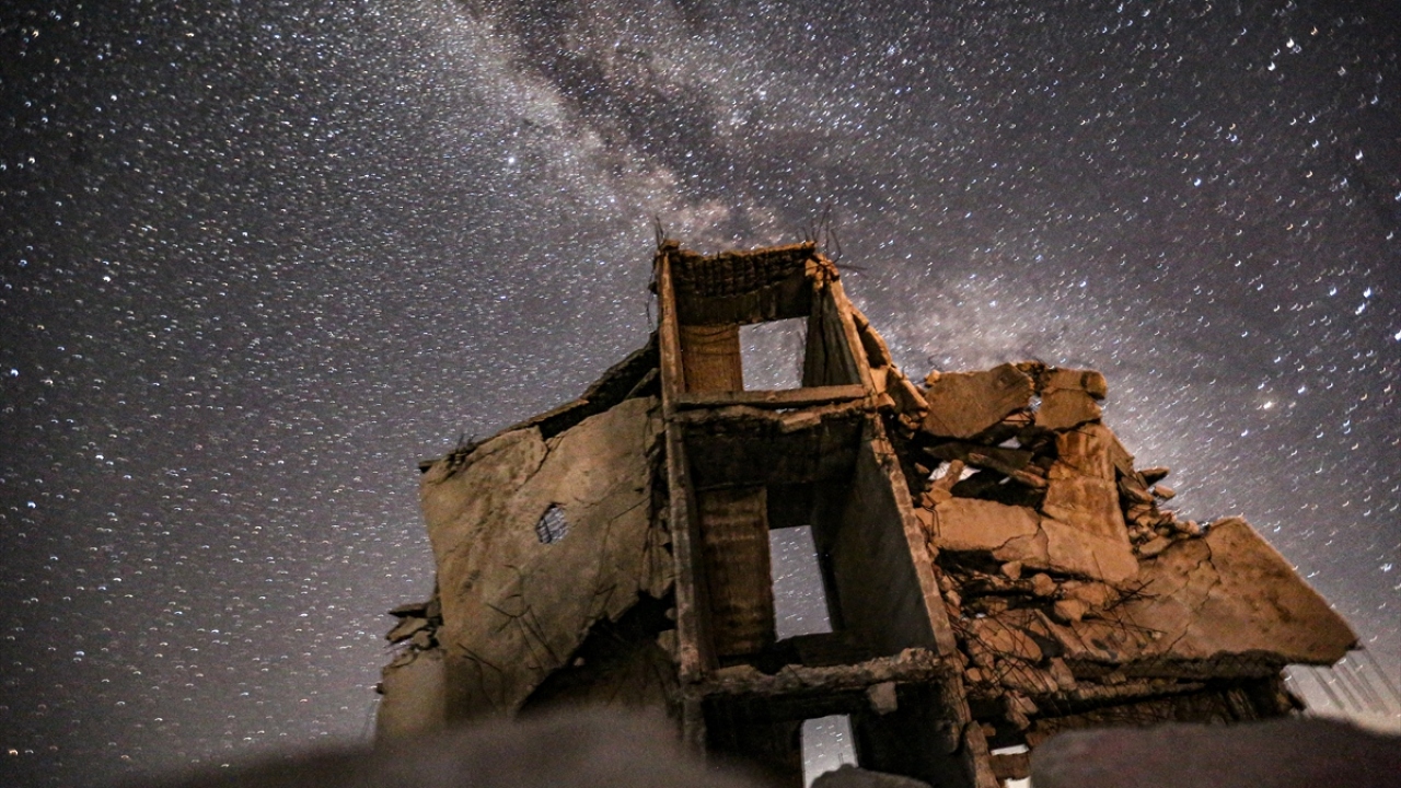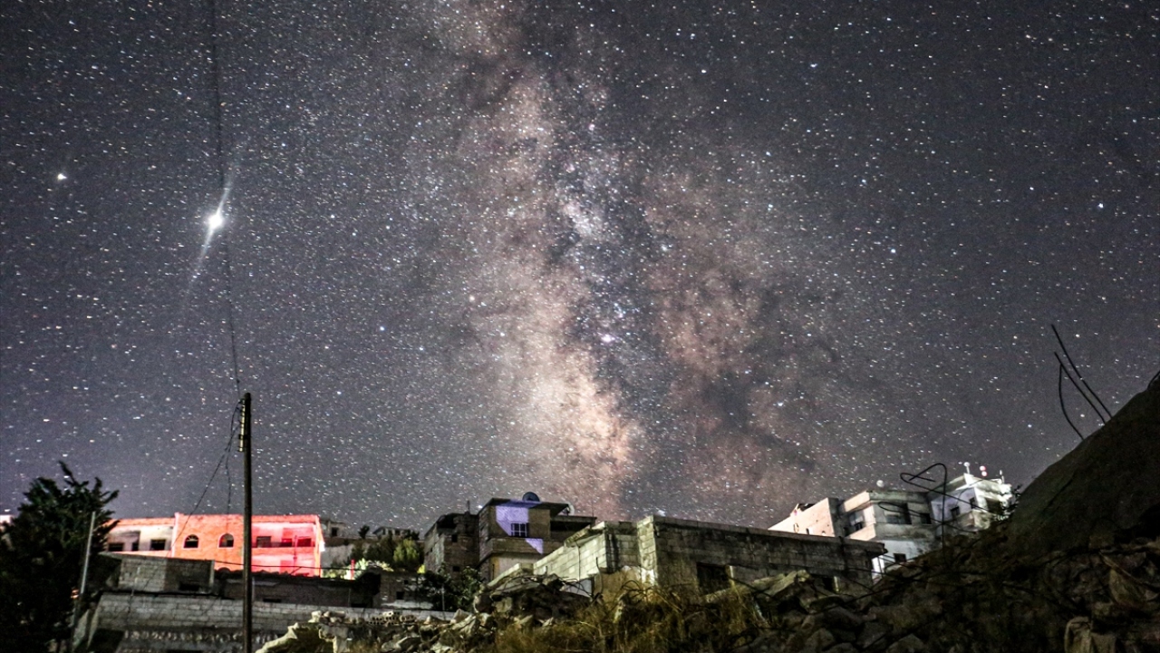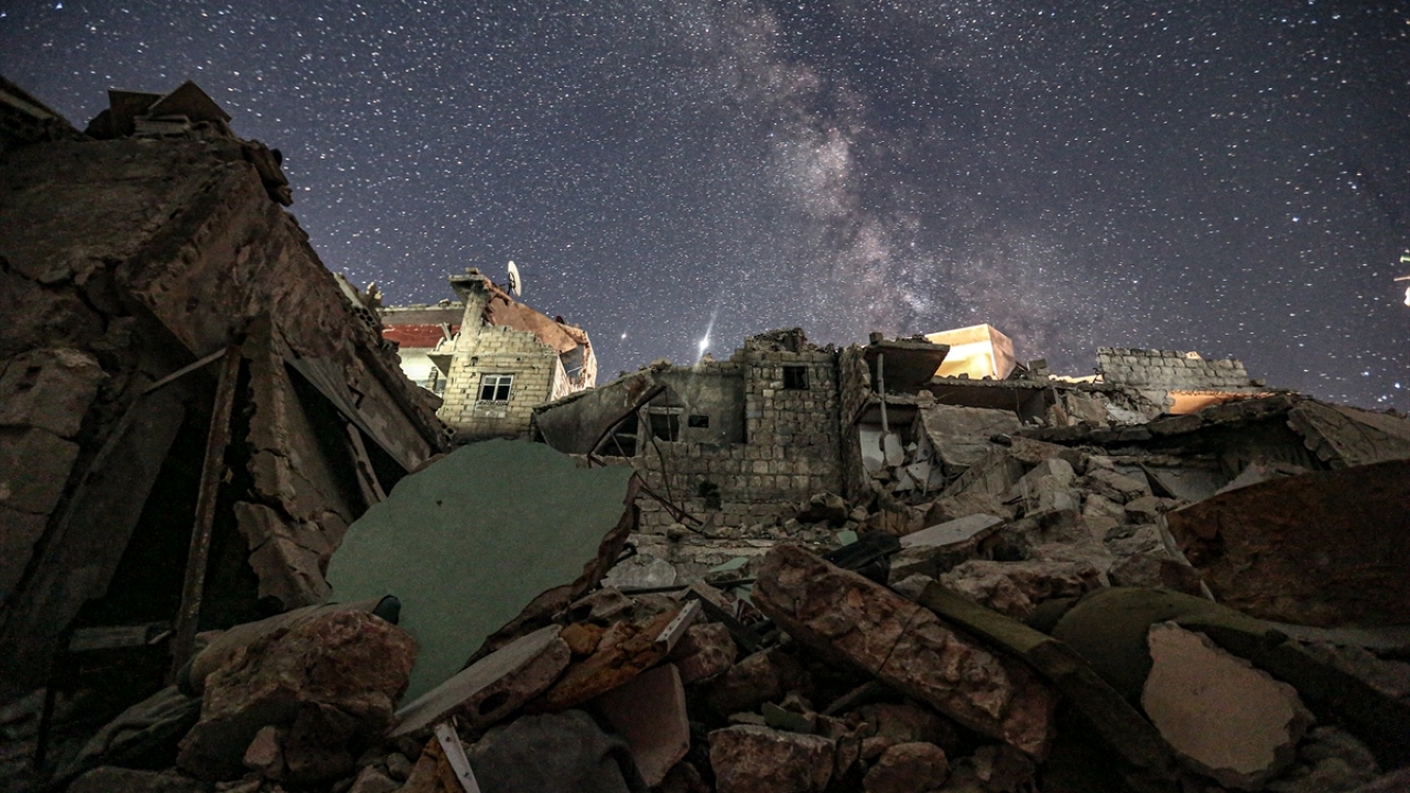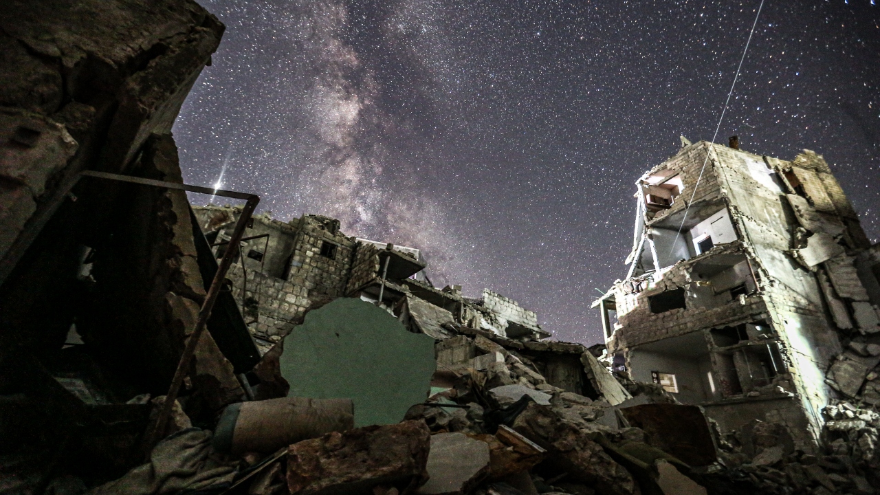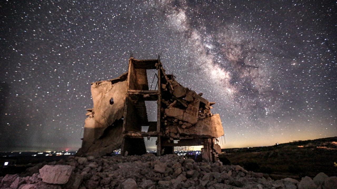 Suriye'nin kuzeybatısındaki İdlib'te Beşşar Esed rejimi ve destekçilerinin saldırılarında enkaz haline gelen binalar, Samanyolu Galaksisi ve yıldızlar ile objektife yansıdı.