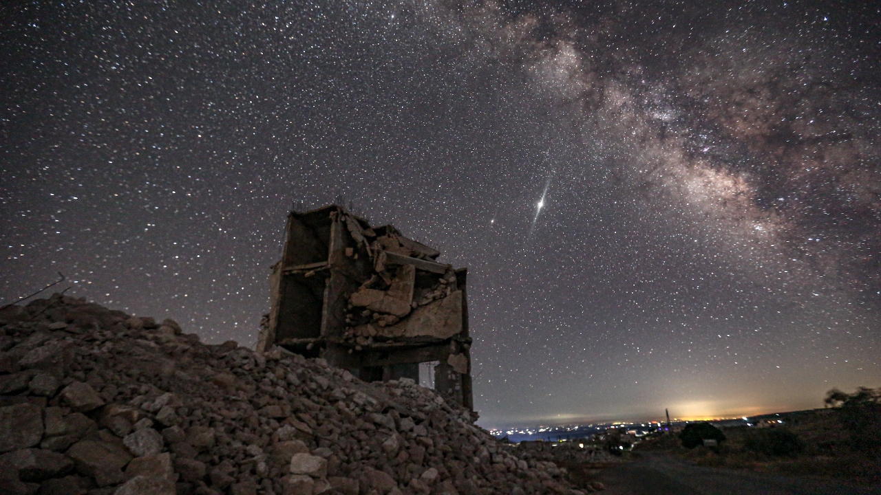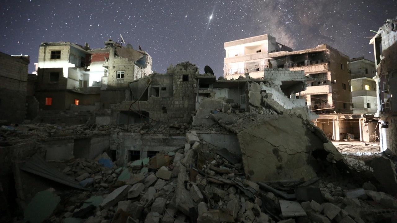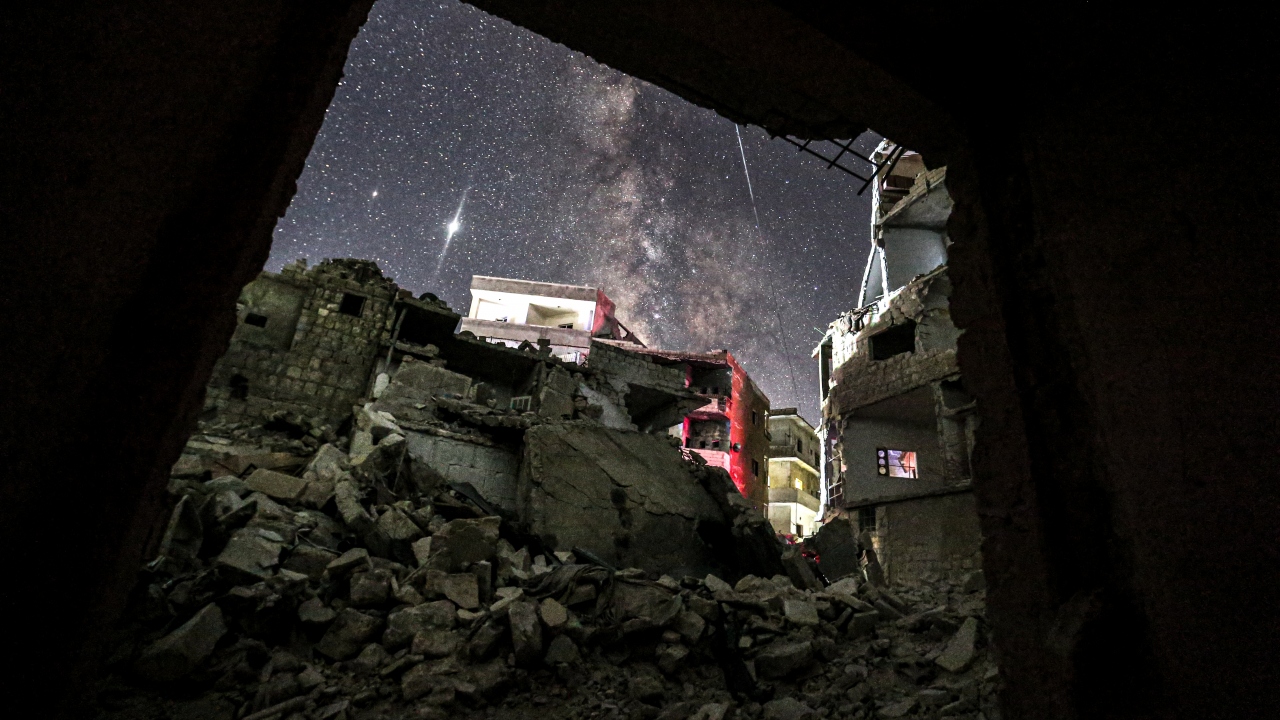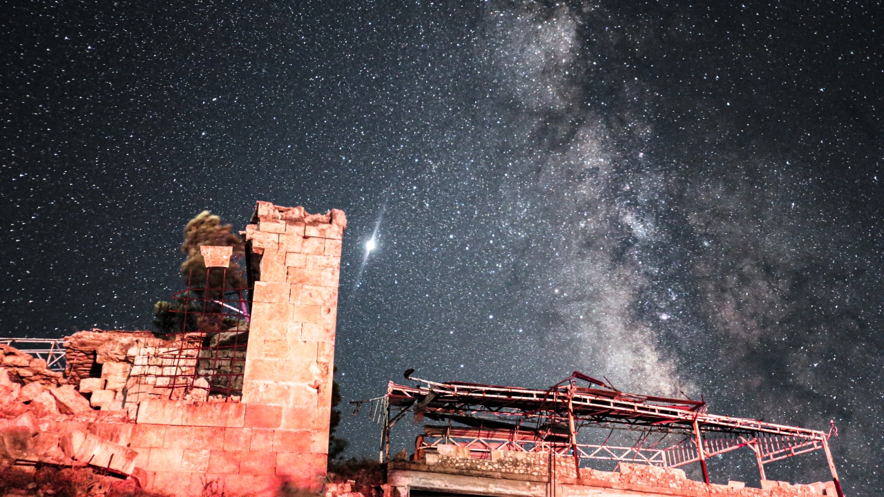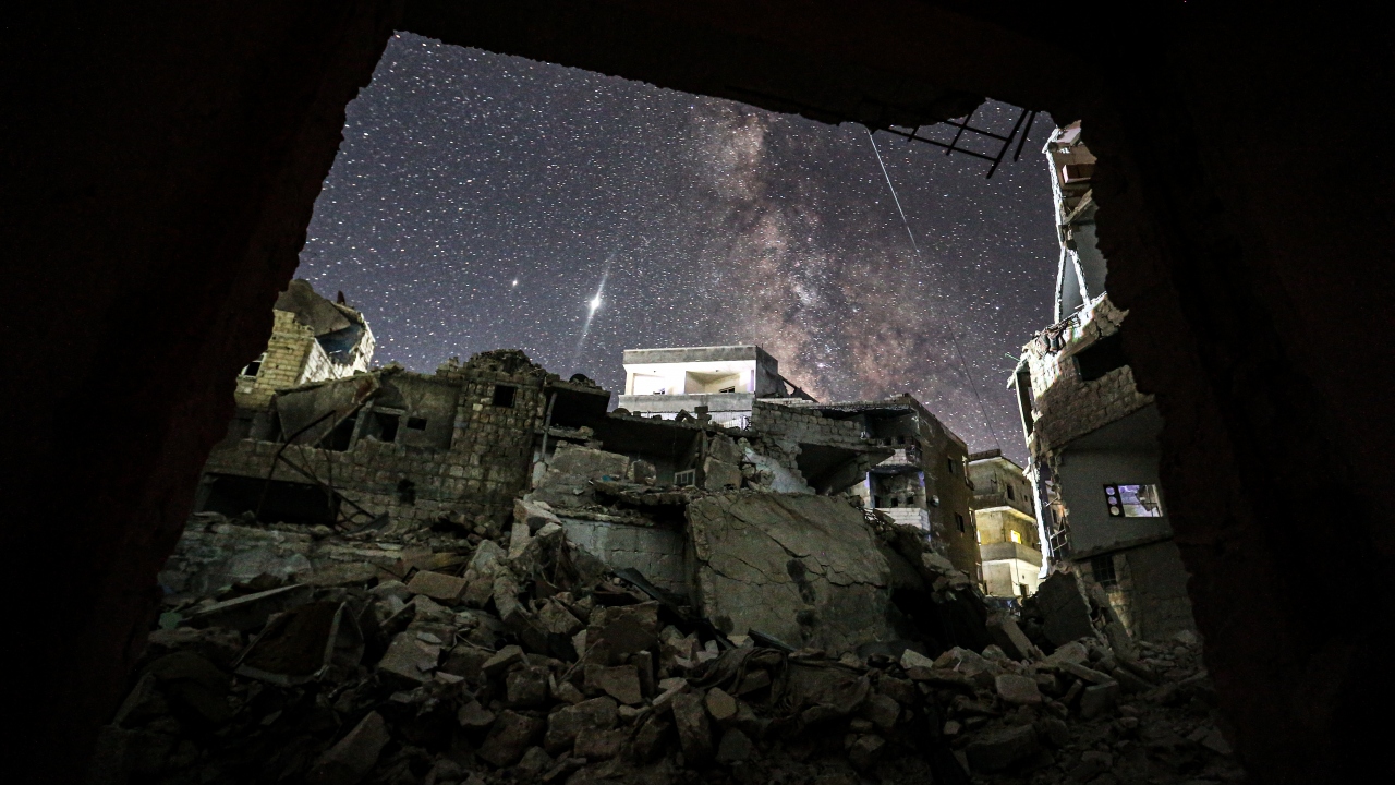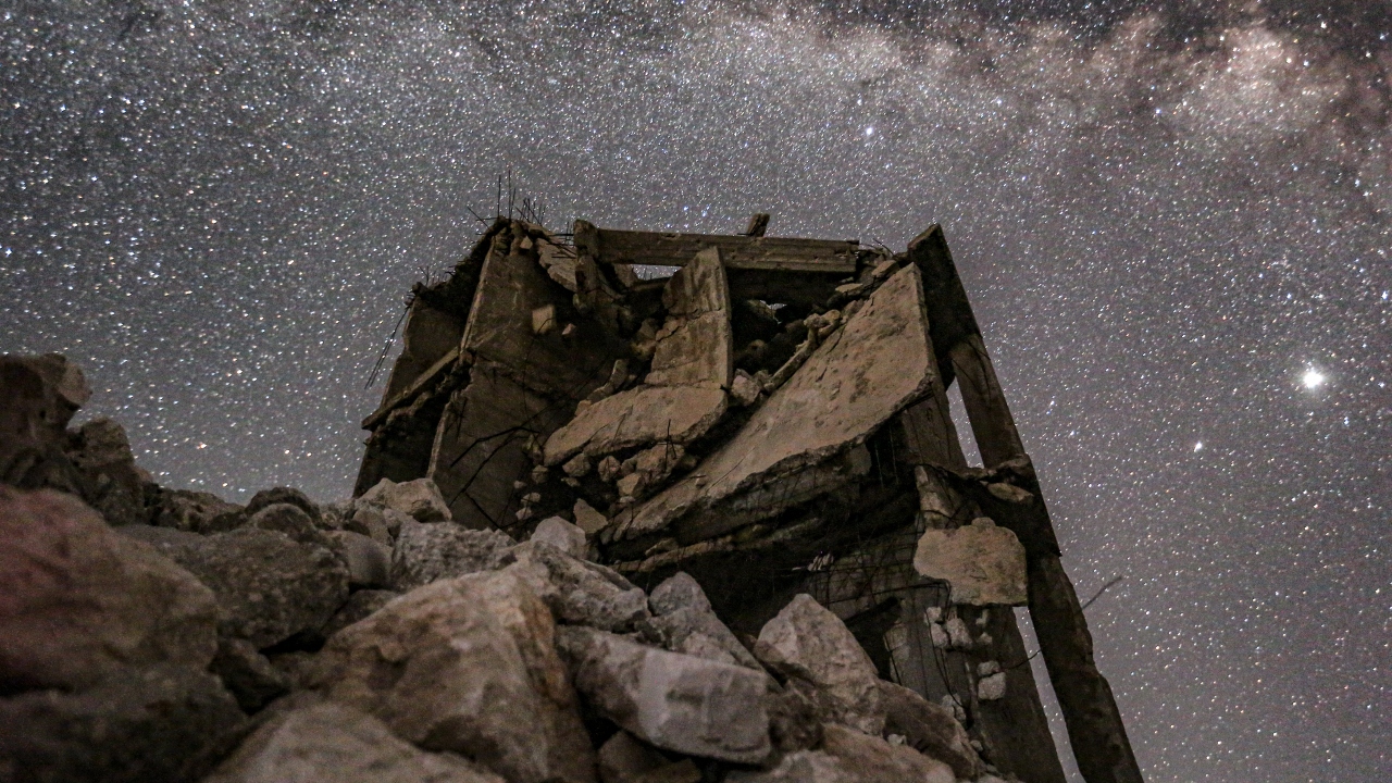 Suriye'nin kuzeybatısındaki İdlib'te Beşşar Esed rejimi ve destekçilerinin saldırılarında enkaz haline gelen binalar, Samanyolu Galaksisi ve yıldızlar ile objektife yansıdı.
