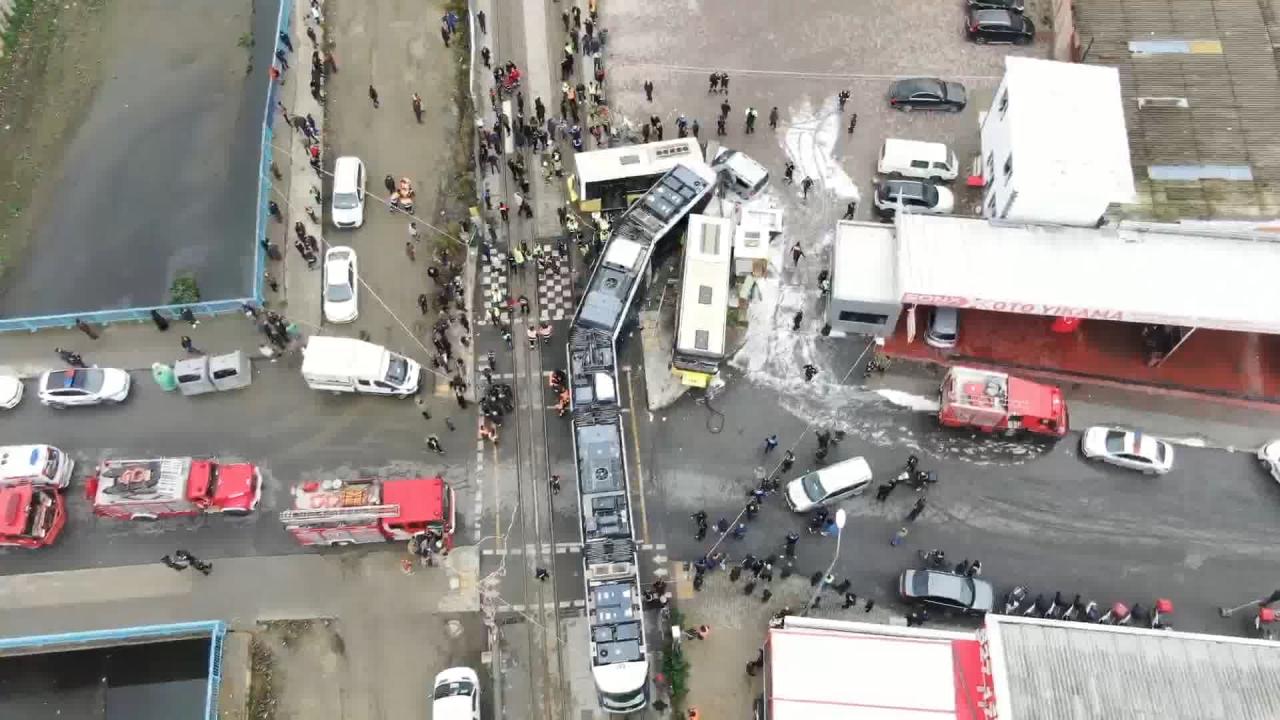 Öte yandan güvenlik kamerasınca kaydedilen görüntüde, tramvay ile çarpışan otobüsün savrularak yakınındaki bir araç ile otoparkta bulunan güvenlik kulübesine çarpması yer aldı.