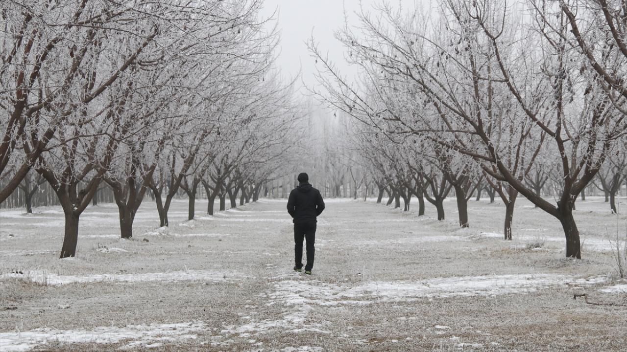 Iğdır`da kent merkezi ve köylerde etkili olan sis ve kırağı, kayısı bahçelerini beyaza bürüdü.
