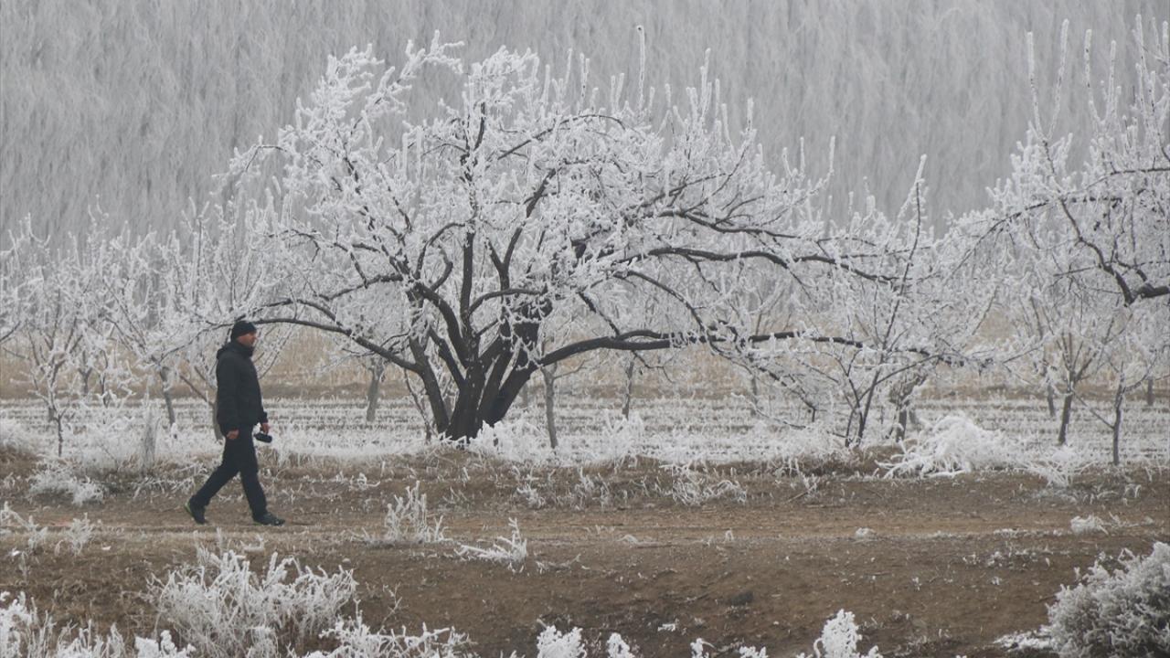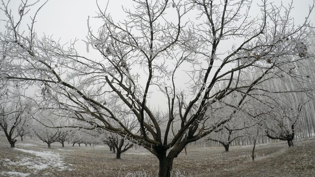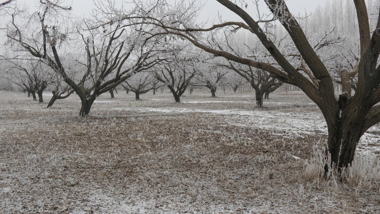 Iğdır'da kent merkezi ve köylerde etkili olan sis ve kırağı, kayısı bahçelerini beyaza bürüdü.