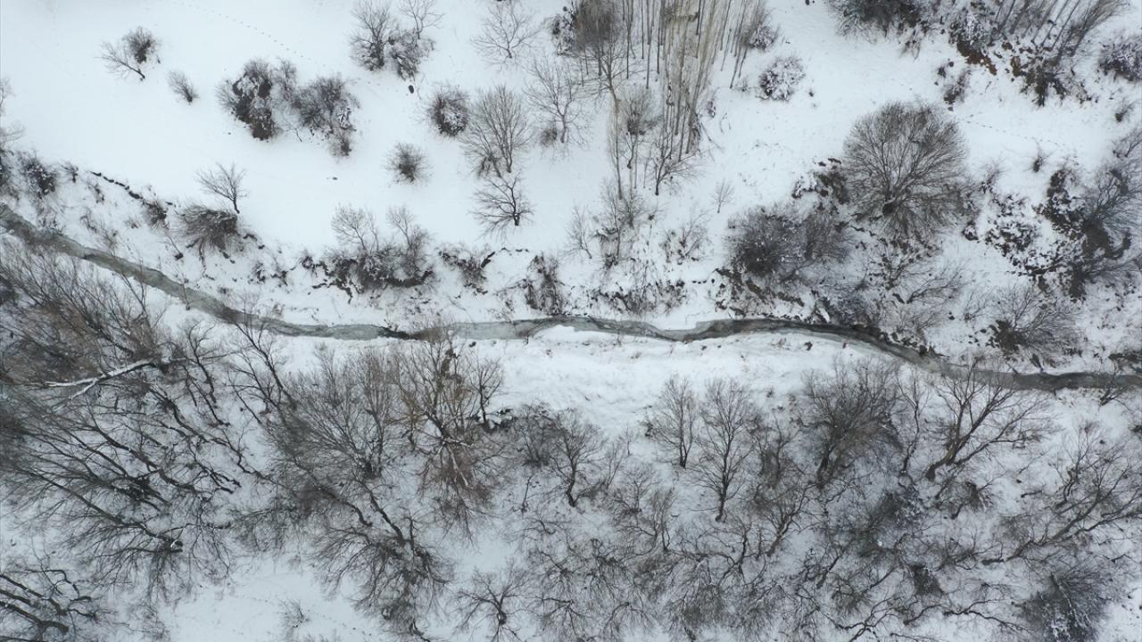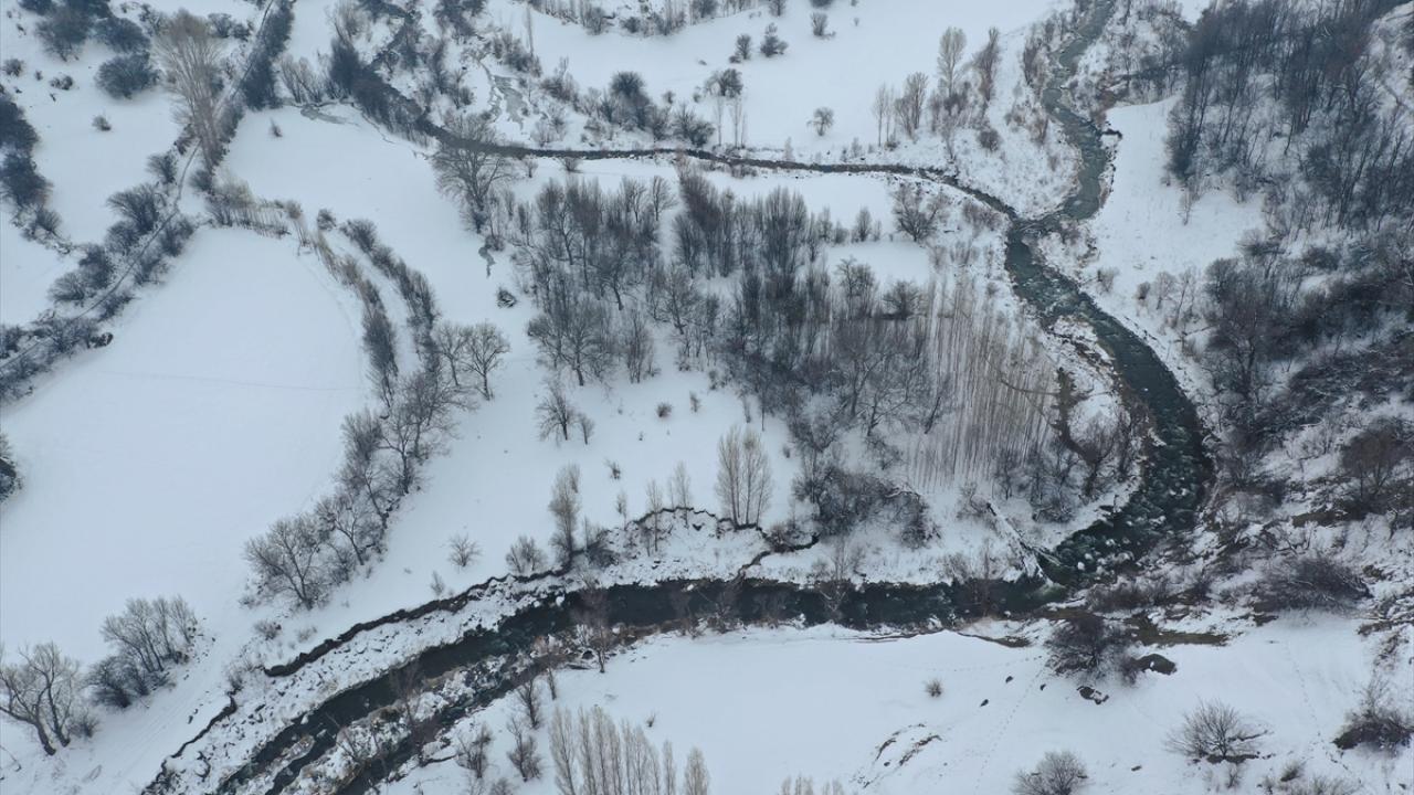 Her mevsim ayrı bir güzellik sunan Üçkaya Vadisi`nin karla kaplı hali dronla görüntülendi.