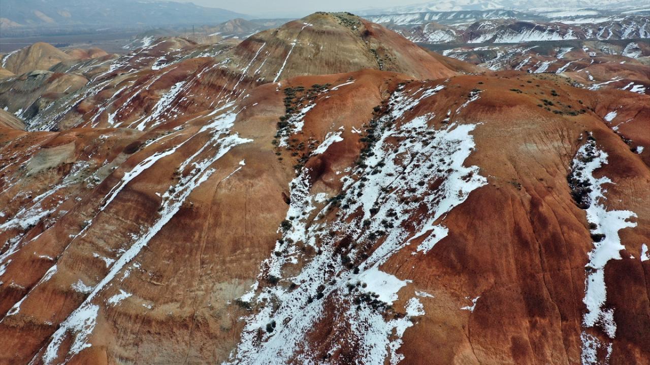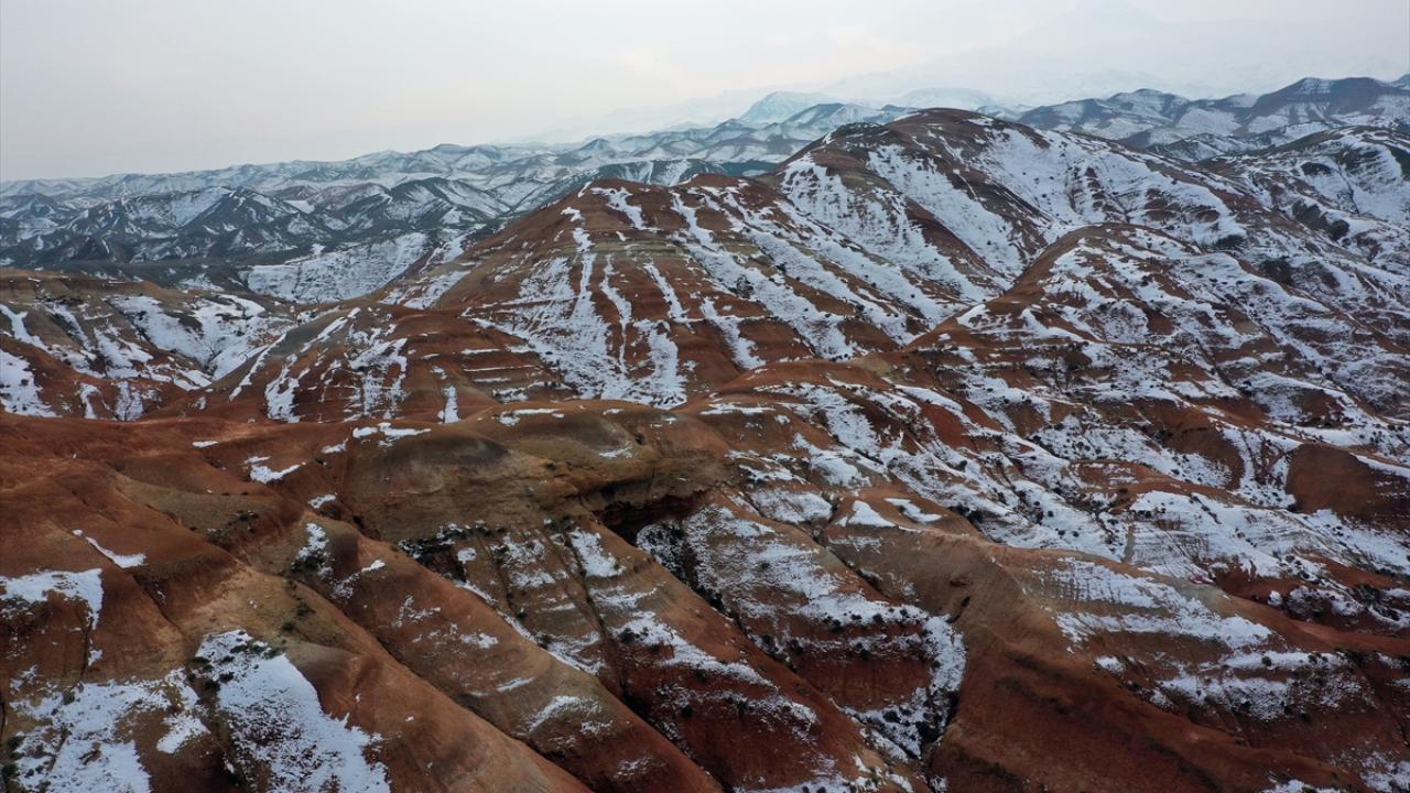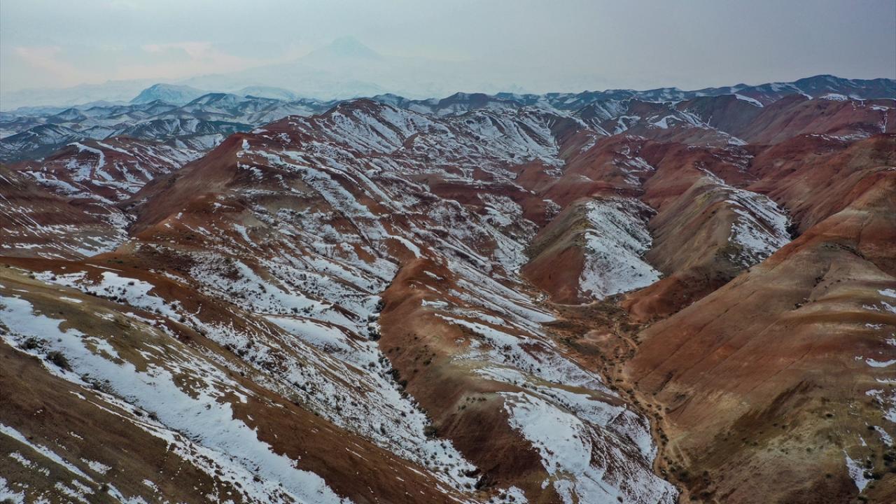 Iğdır'da etkili olan kar yağışıyla bir kısmı karla kaplanan Gökkuşağı Tepeleri, dron ile havadan görüntülendi. Tepelerin karlı manzarası güzel görüntüler oluşturdu.
