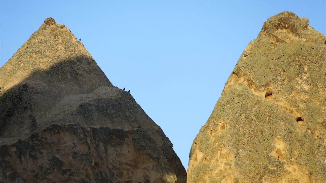 Kaya oyma mekanları arasından geçerek zirveye ulaşan ziyaretçiler, yeşilin ve yüzlerce peri bacasının buluştuğu manzarada dinlenerek, fotoğraf makineleriyle eşsiz anı ölümsüzleştiriyor.