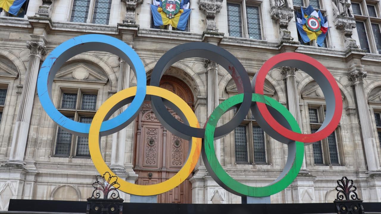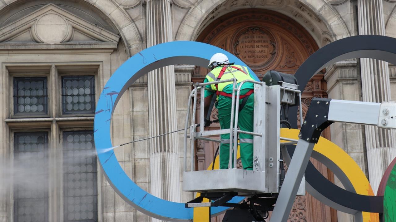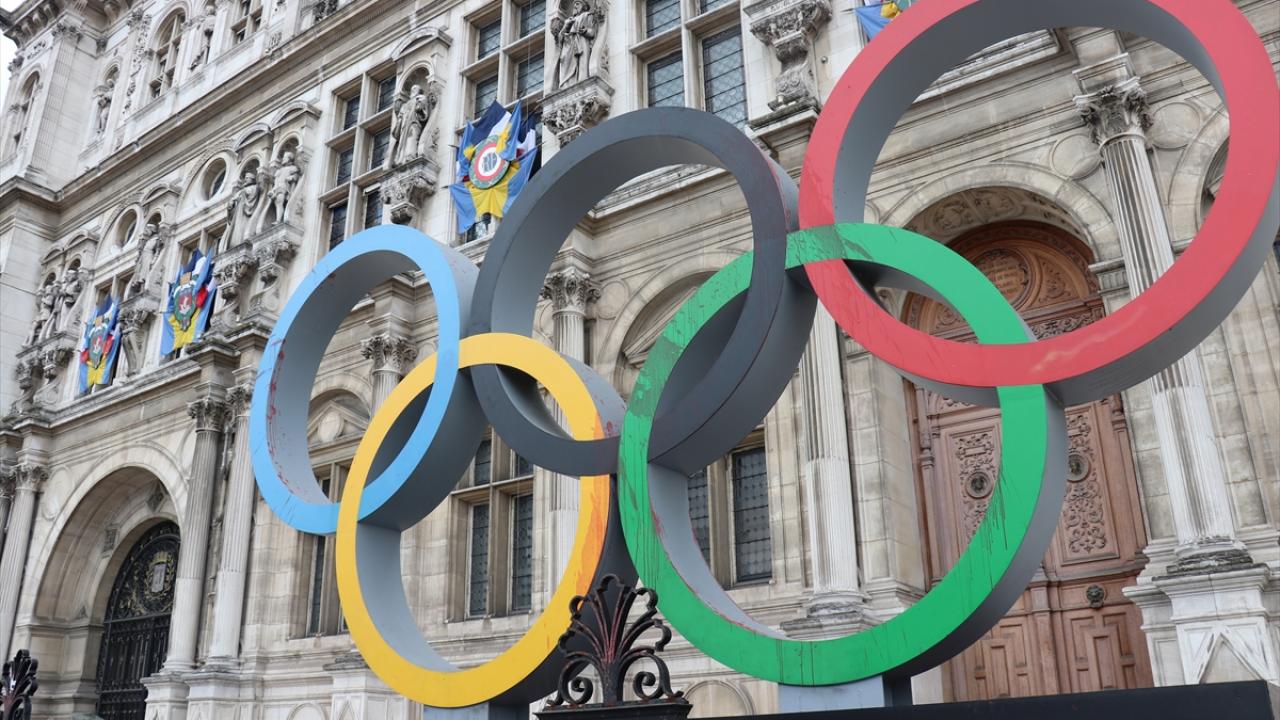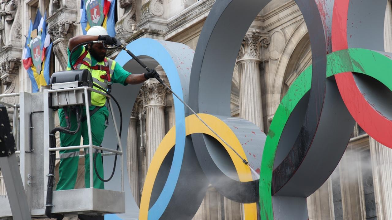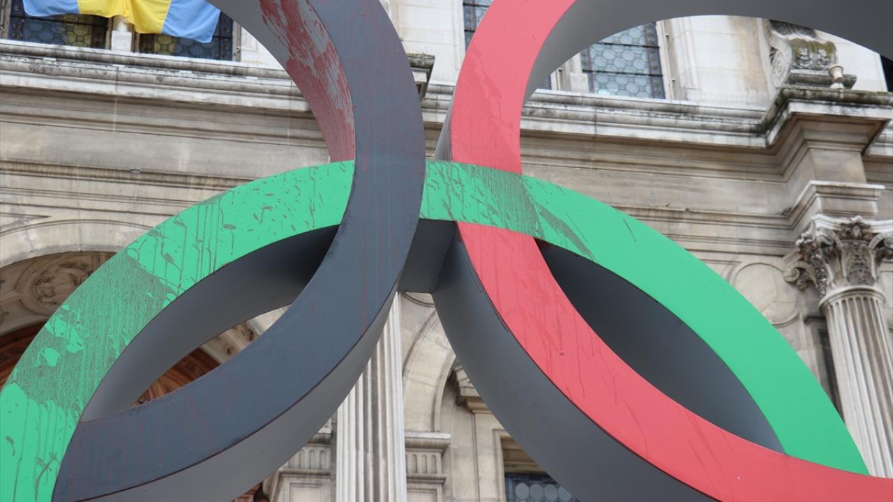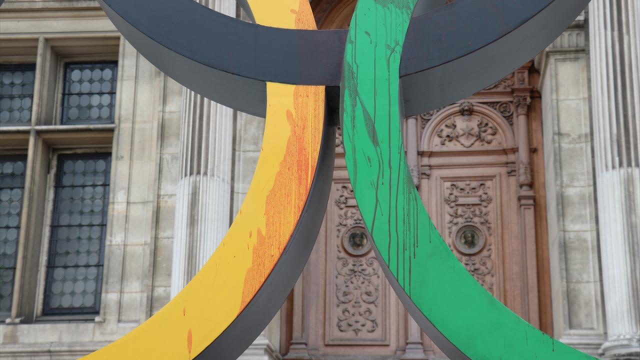 Fransa'nın başkenti Paris'te, iklim aktivistleri 2024 Olimpiyatlarının Paris'te düzenlenecek olmasını belediye binası önündeki Olimpiyat halkaları anıtına "sahte kan" dökerek protesto etti.