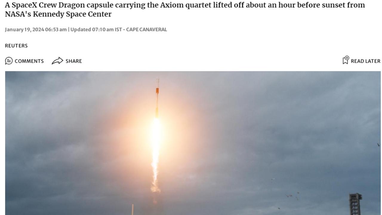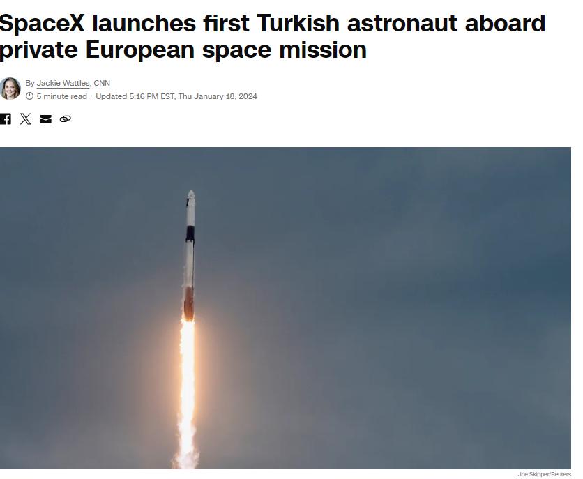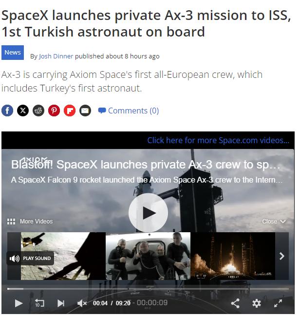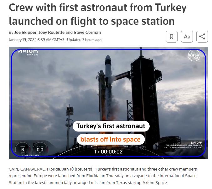 Ünlü uzay sitesi Space.com`da, "Ax-3, Axiom Space`in, aralarında Türkiye`nin ilk astronotunun da bulunduğu, tamamı Avrupa`dan oluşan ilk mürettebatını taşıyor" denildi.