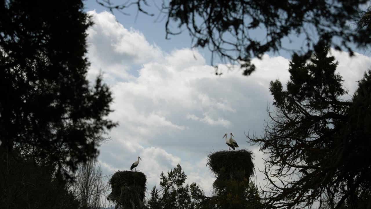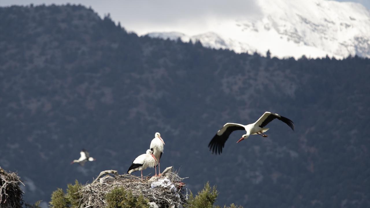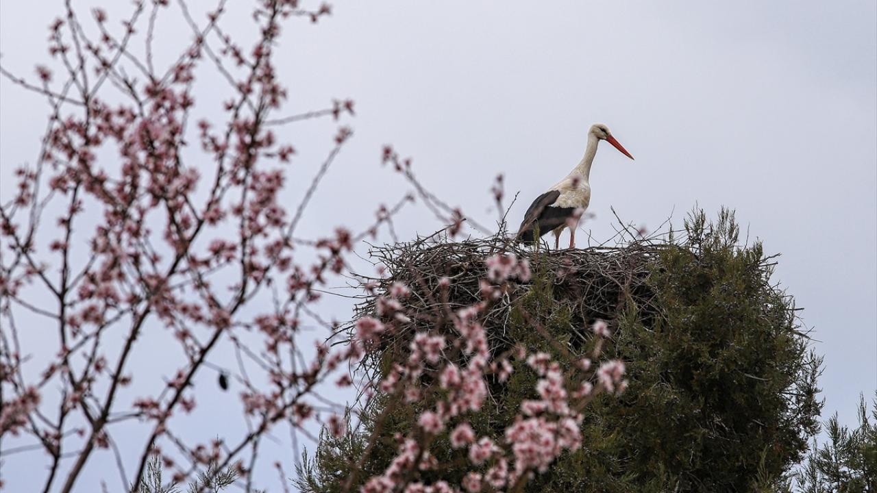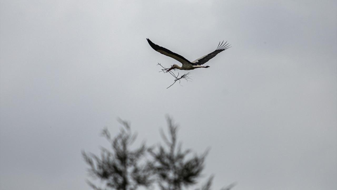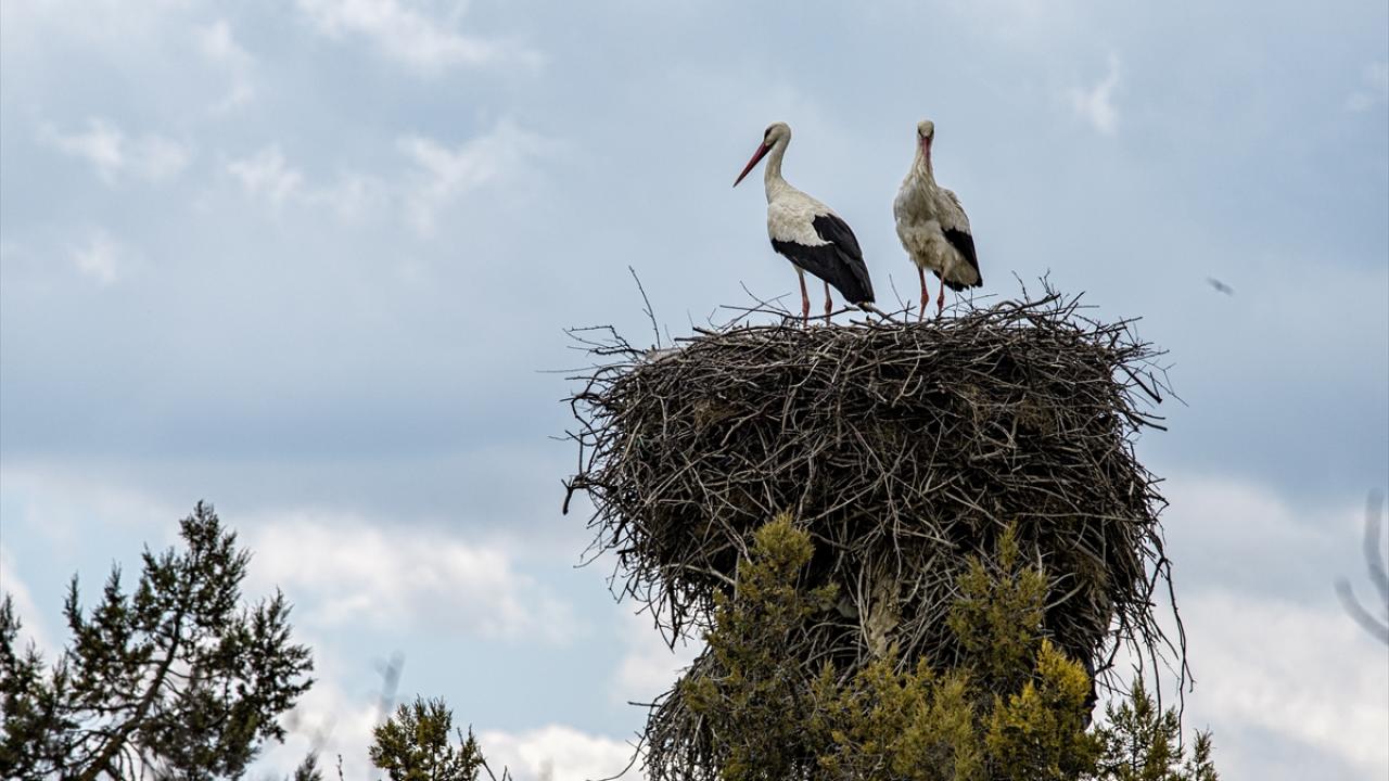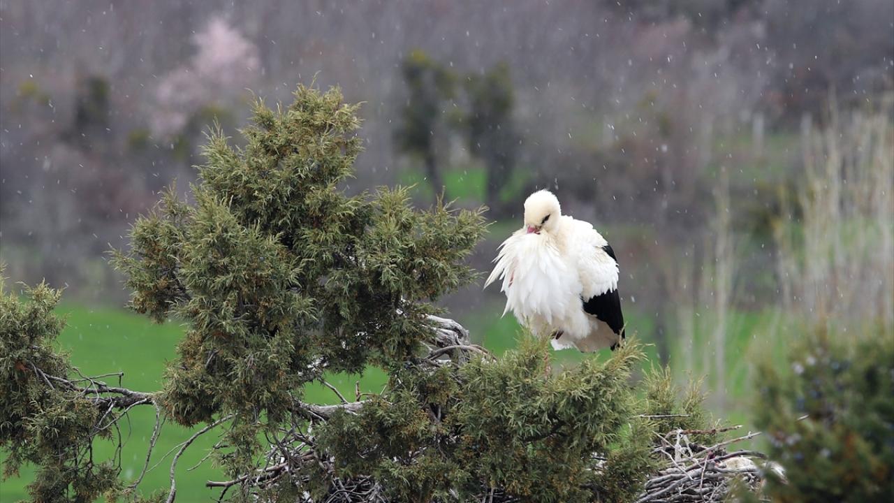 Mart ayında hafif kar yağışı ile karşılaşan leylekler, ardıç ağaçlarındaki yuvalarında yavrulama dönemi için hazırlık yaptı.