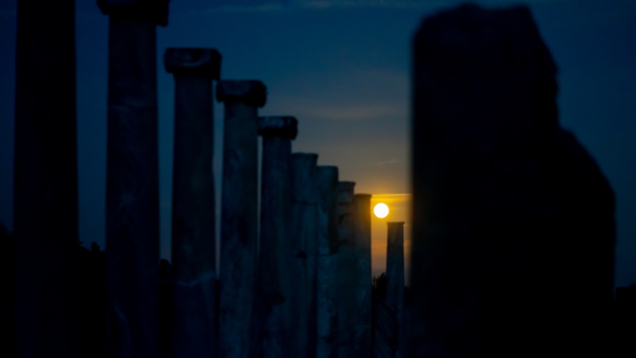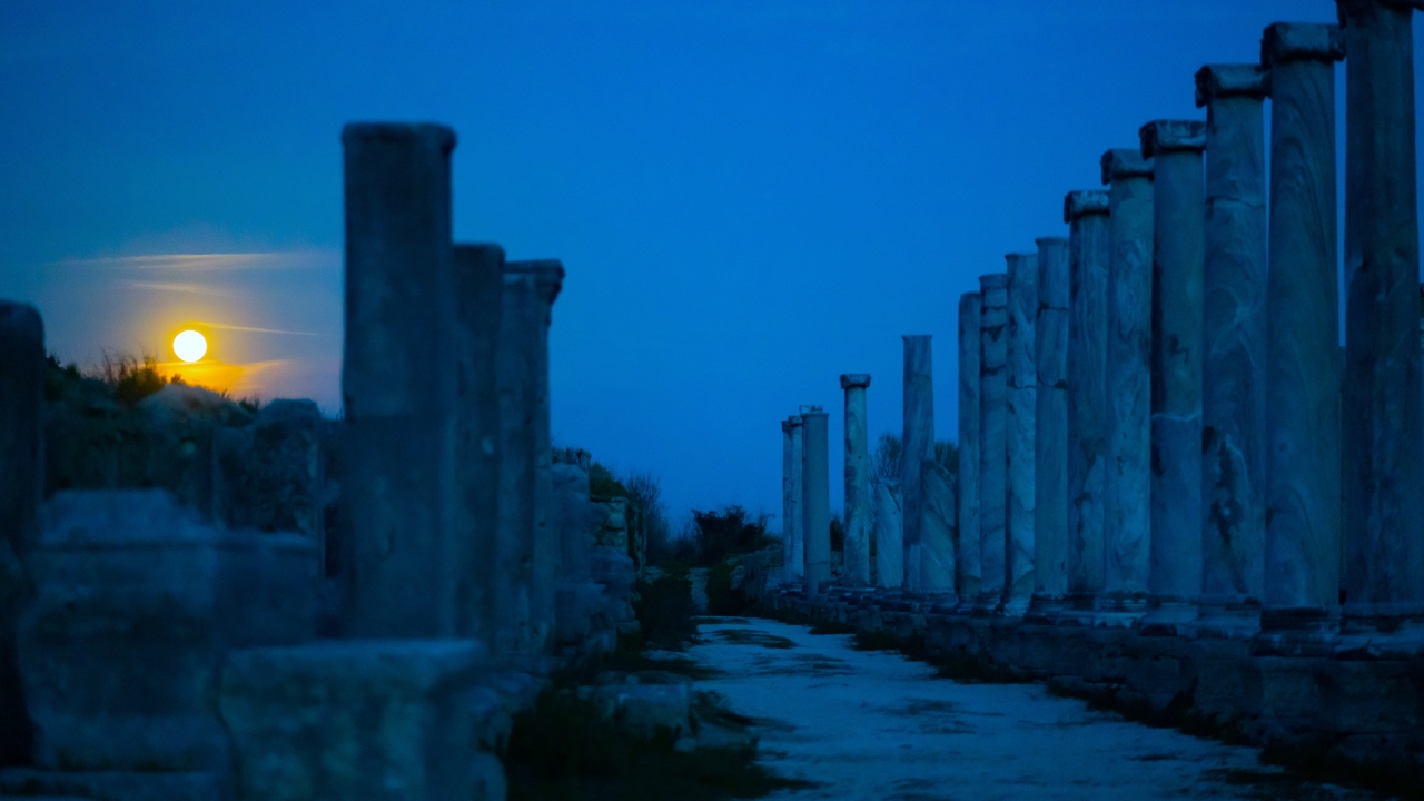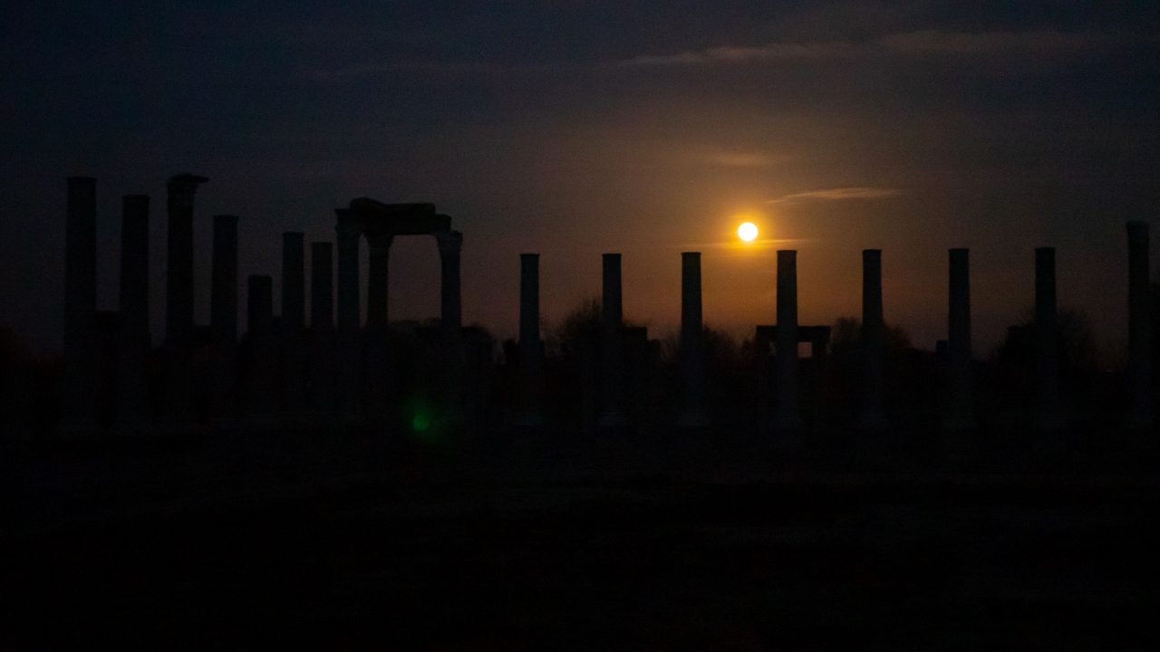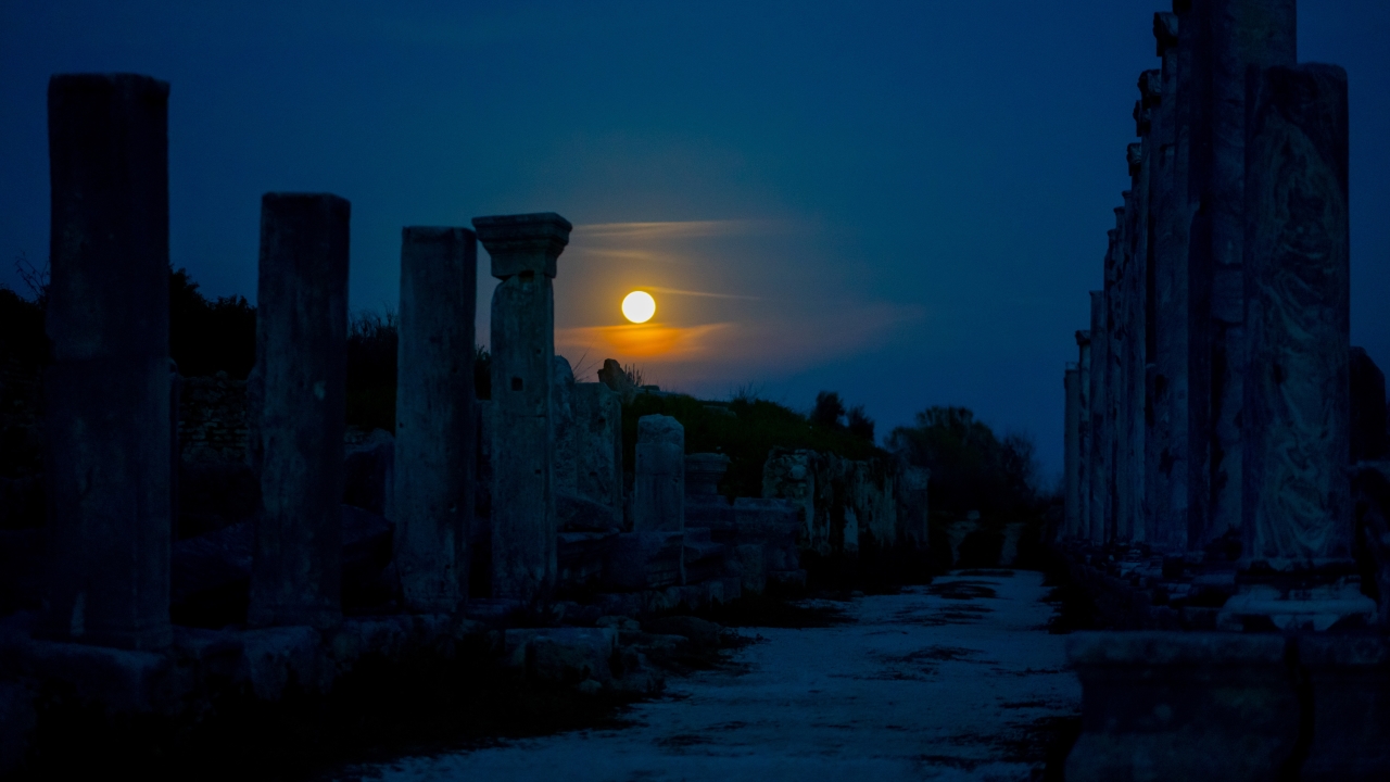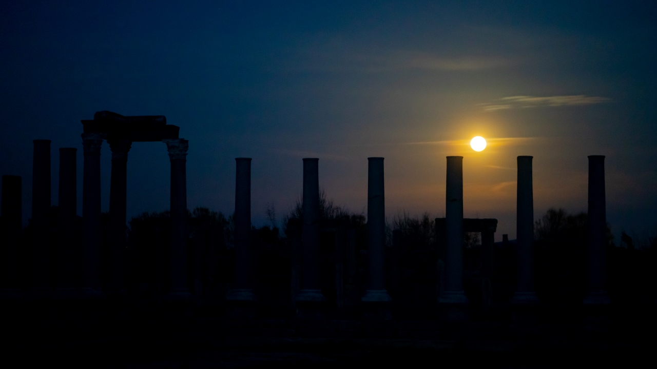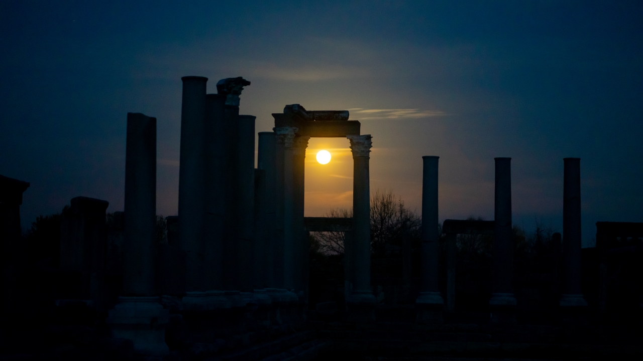 Dolunay`ı Perge Antik Kenti`nden takip eden doğa fotoğrafçılarıysa, bu muhteşem doğa olayıyla tarihi bir karede buluşturma imkanı buldular.