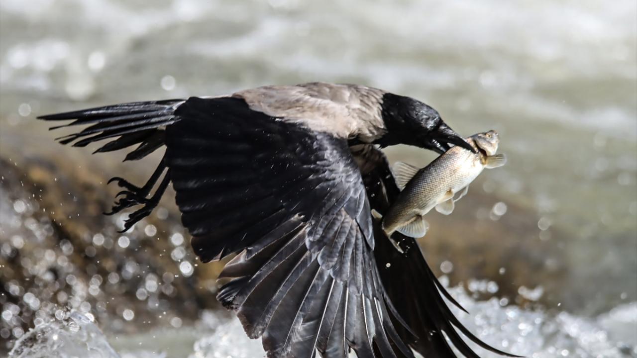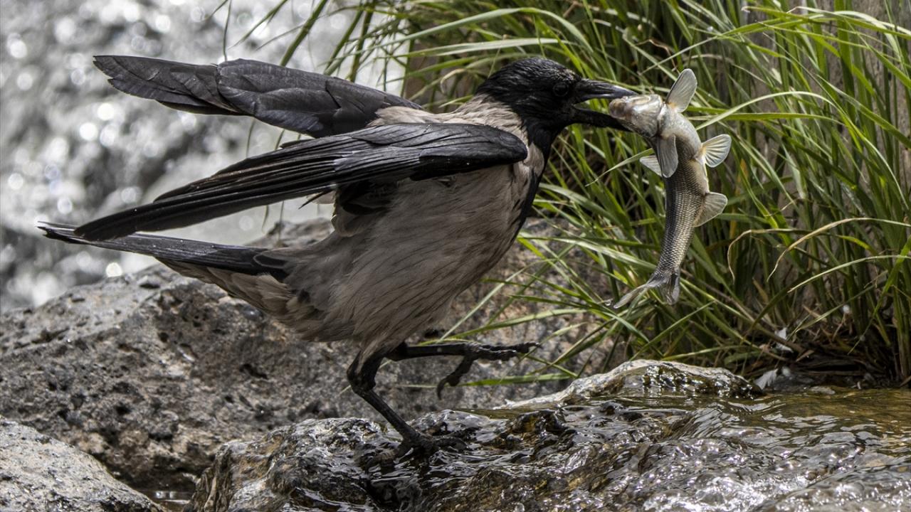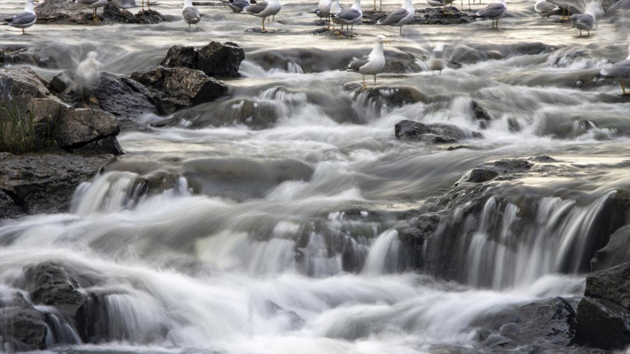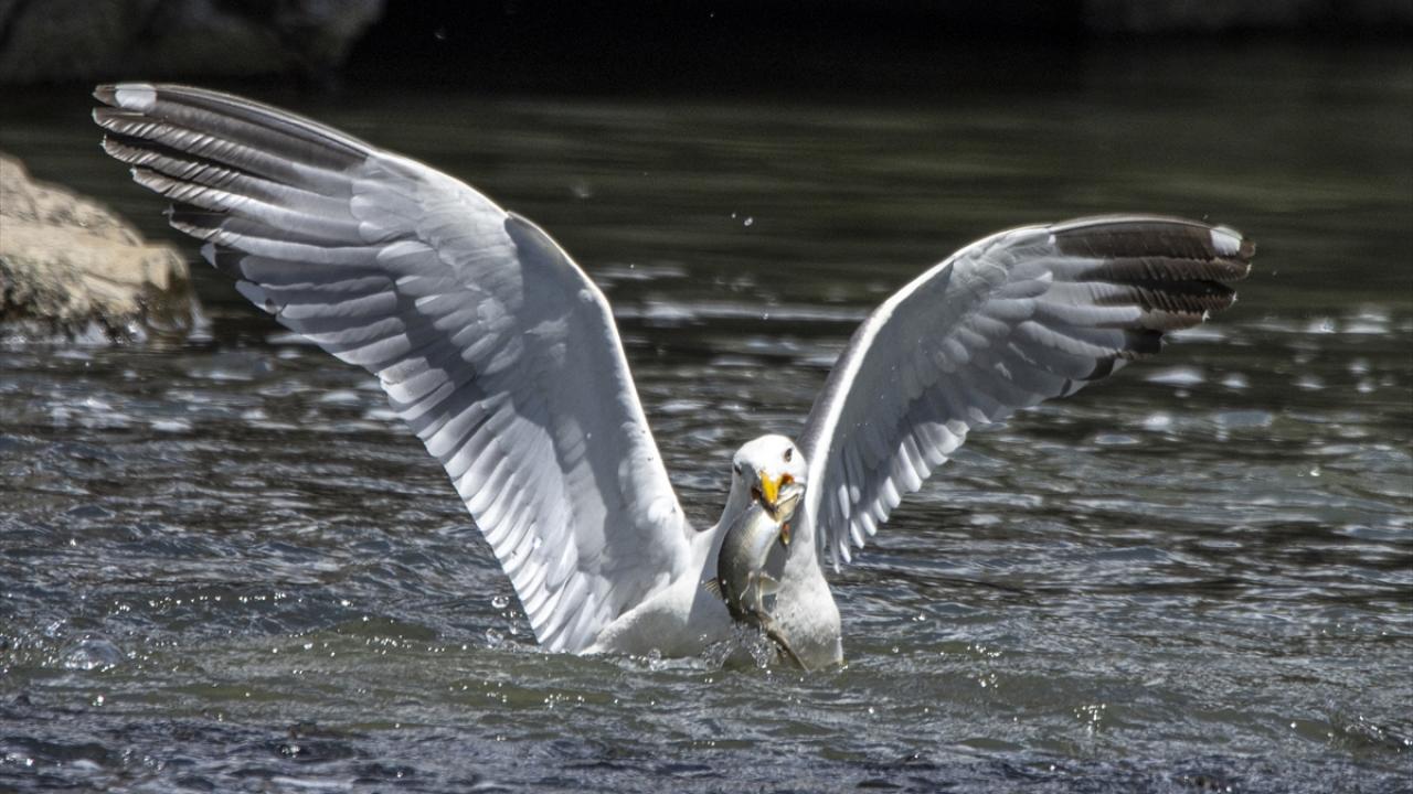 Bölgedeki martı ve kargalar da suyun tersine yüzen balıkları avlamaya çalışıyor.