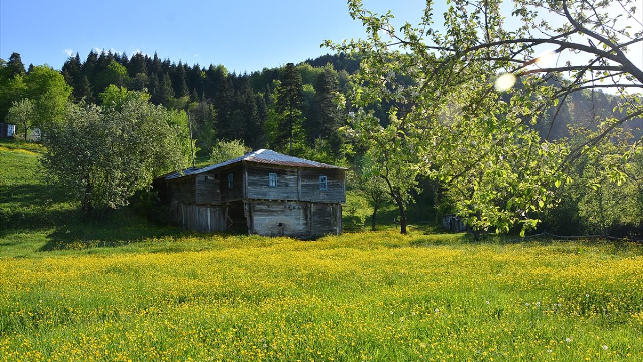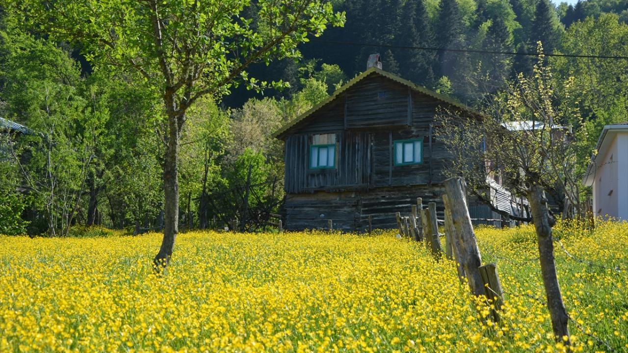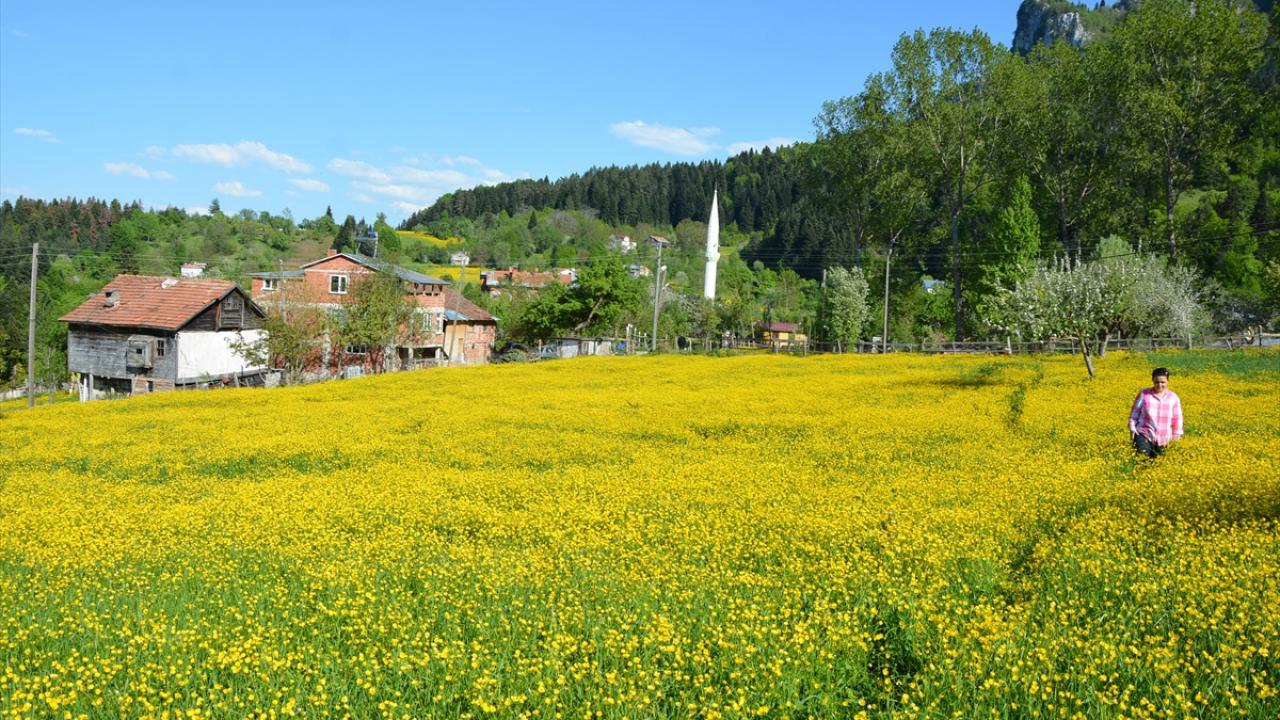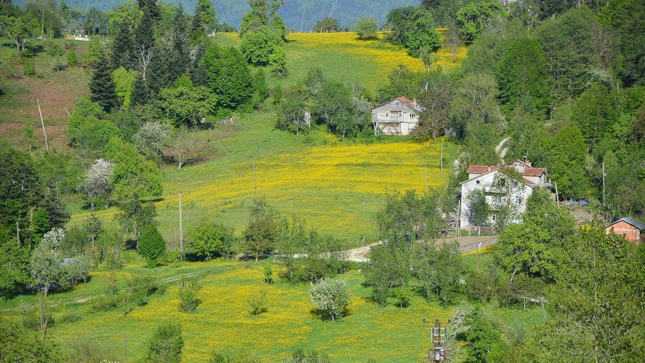 Çiçekyazı köyündeki tarlalarda açan sarı çiçekler, yeşilin birbirinden güzel tonları ve köy evleriyle bütünleşip adeta renk cümbüşüne dönüştü.