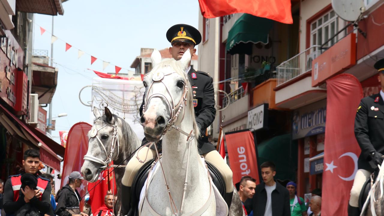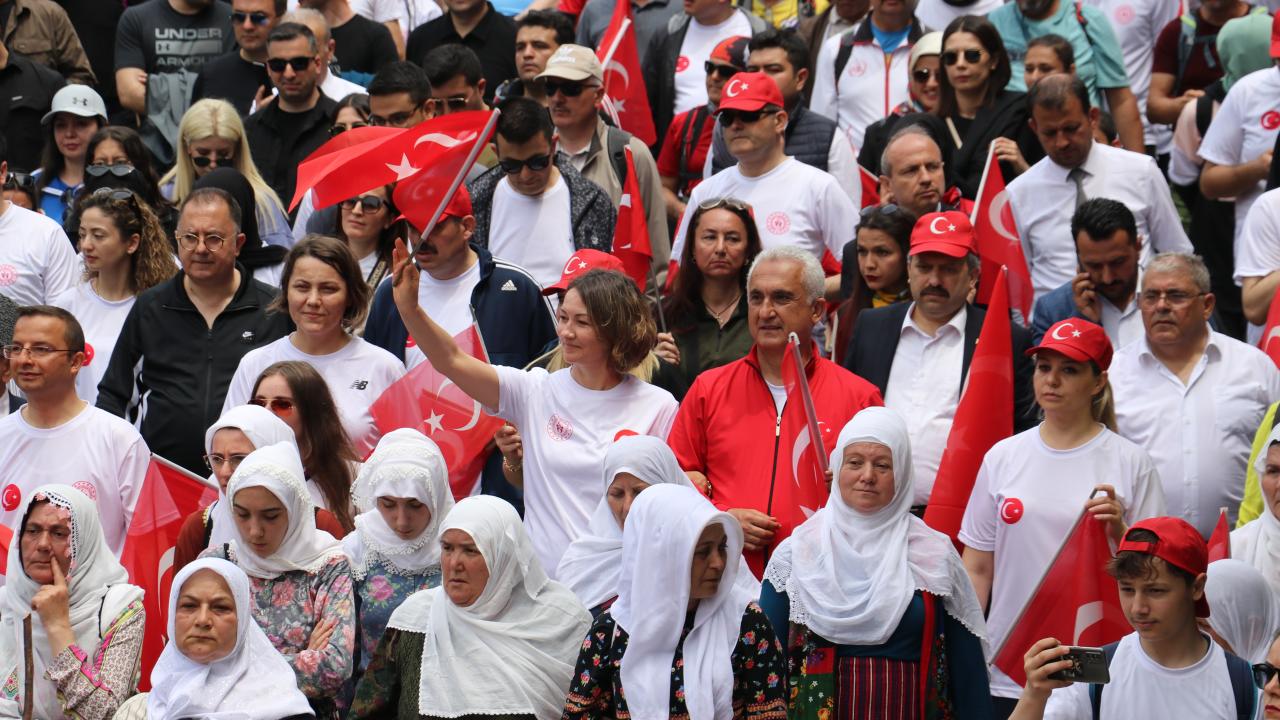 Ellerinde Türk bayraklarıyla yürüyüşe katılanlara şehir merkezinden geçerken vatandaşlar tarafından konfeti ve çiçekler atıldı.