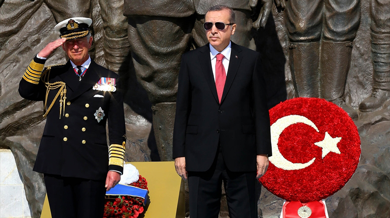 24 Nisan 2015`te Cumhurbaşkanı Recep Tayyip Erdoğan (sağda) ve Birleşik Krallık Galler Prensi Charles (solda), Çanakkale Kara Savaşları`nın 100. yıl dönümü dolayısıyla Şehitler Abidesi`nde düzenlenen törene katılmıştı. (Arşiv)