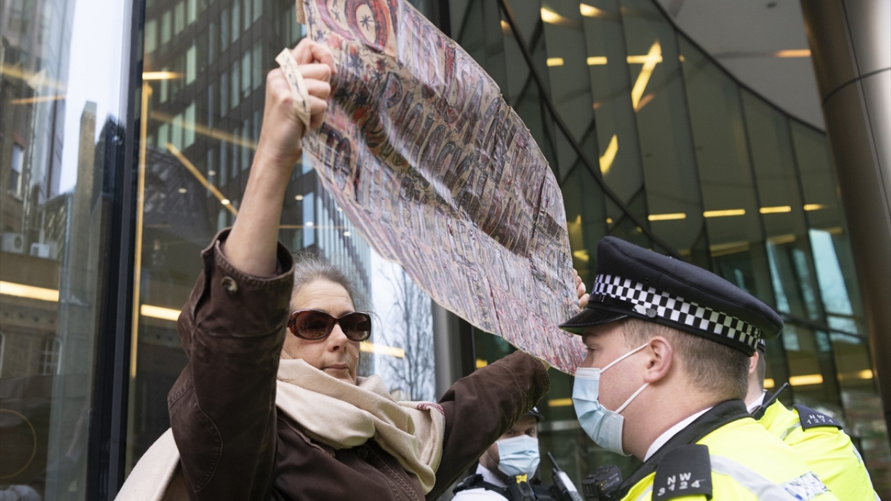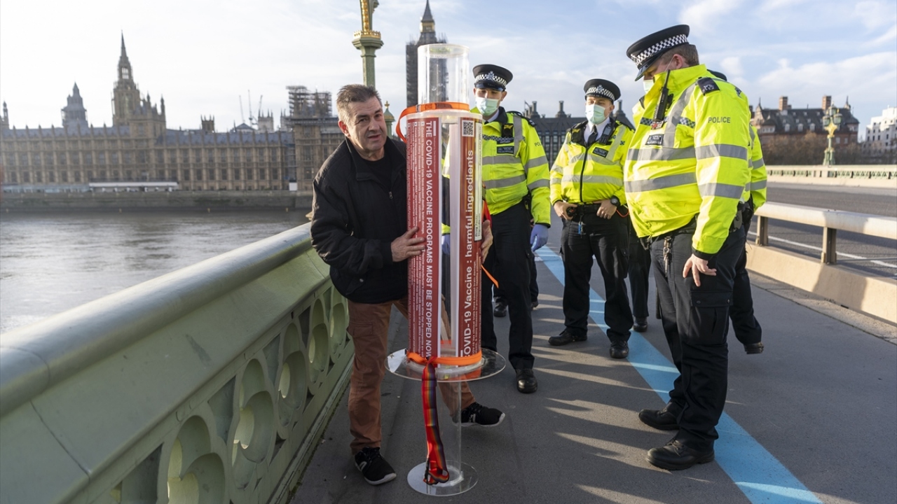 Parlamento önünde başka bir kadın daha gözaltına alınırken, polis dev şırıngayı taşıyan KKTC kökenli Tuğrul Hurşit isimli eylemciye 200 sterlin ceza yazdı.