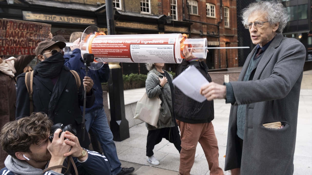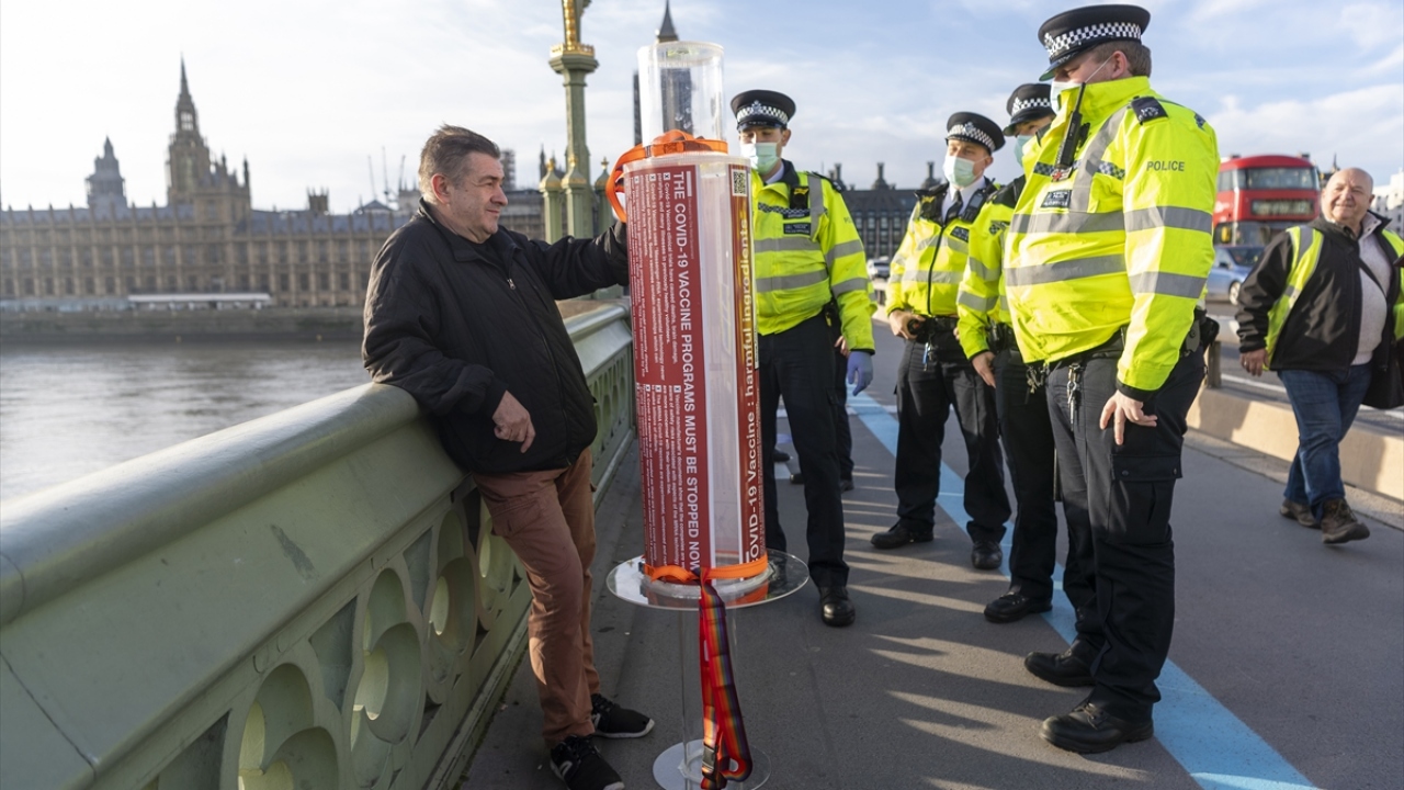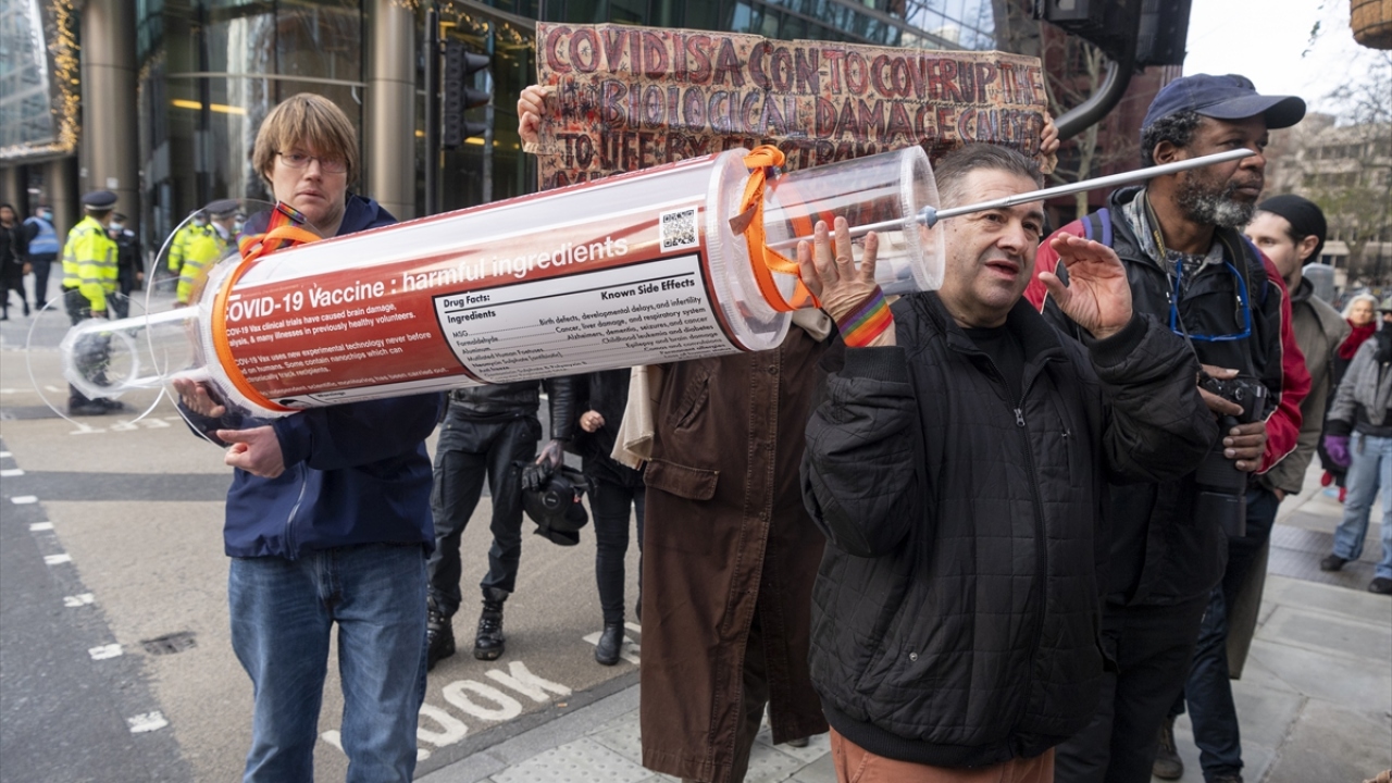 Üzerinde aşının zararlı olduğu iddia edilen yazılar bulunan dev bir şırınganın taşındığı eylemde polis, göstericileri adım adım takip etti.