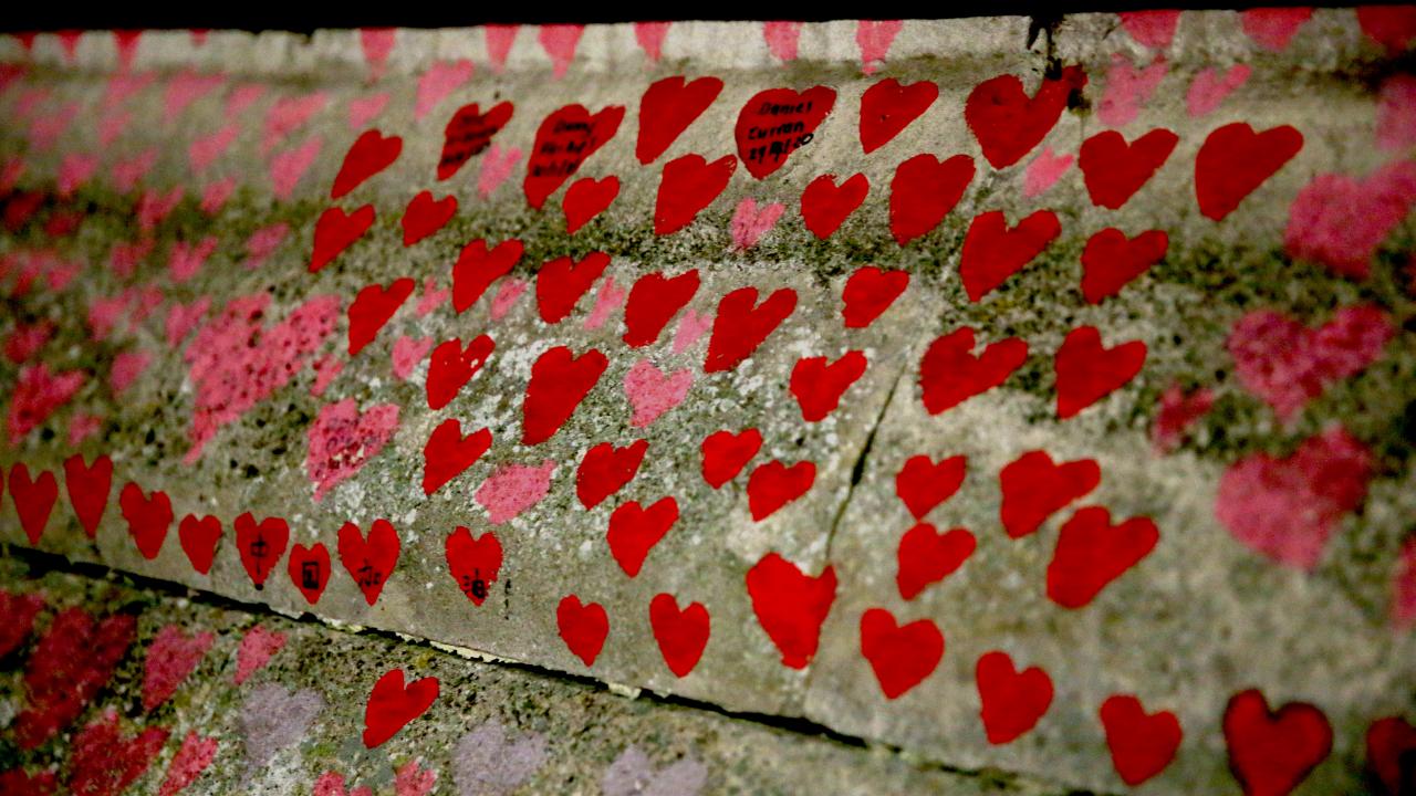 Duvar üzerinde 160 bine yakın kalp çizimi bulunuyor.
