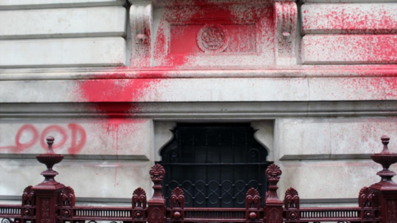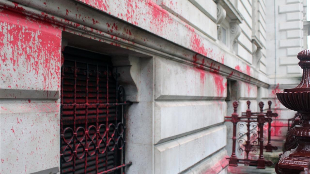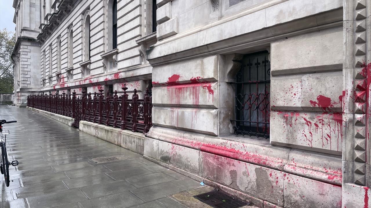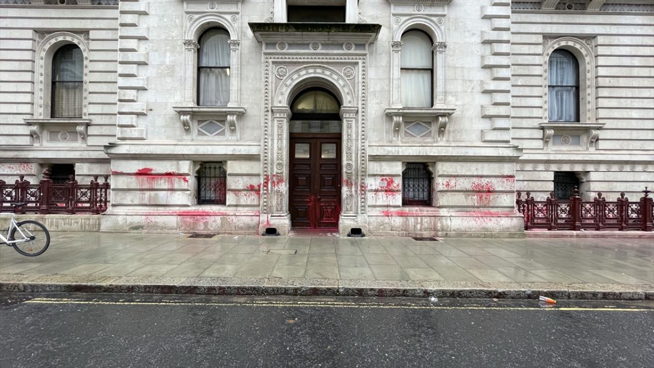 İngiltere'de Filistin destekçisi bir grup, başkent Londra’da Dışişleri Bakanlığı binasının duvarlarına Balfour Deklarasyonu'nun 106. yıldönümü sebebiyle kırmızı boya atarak protesto etti.