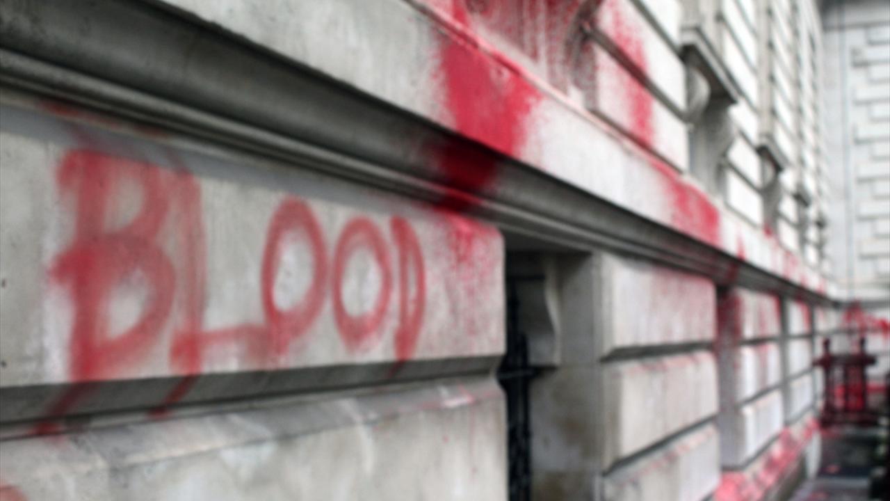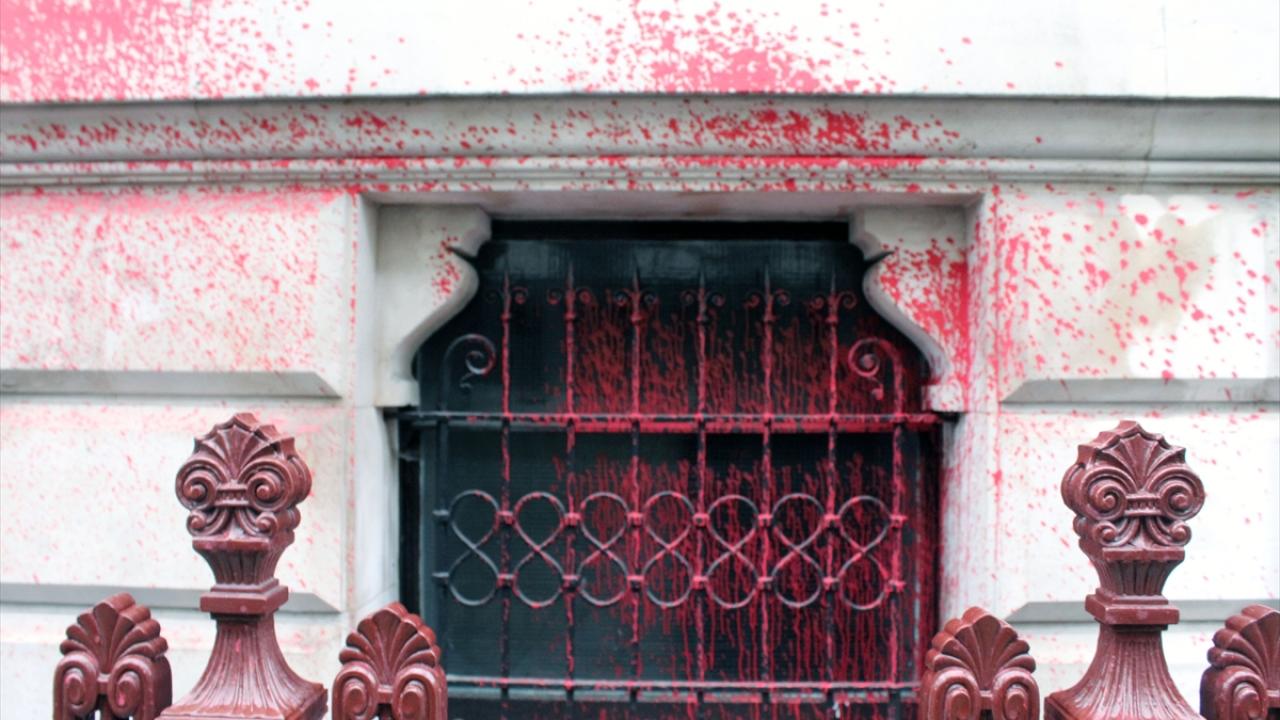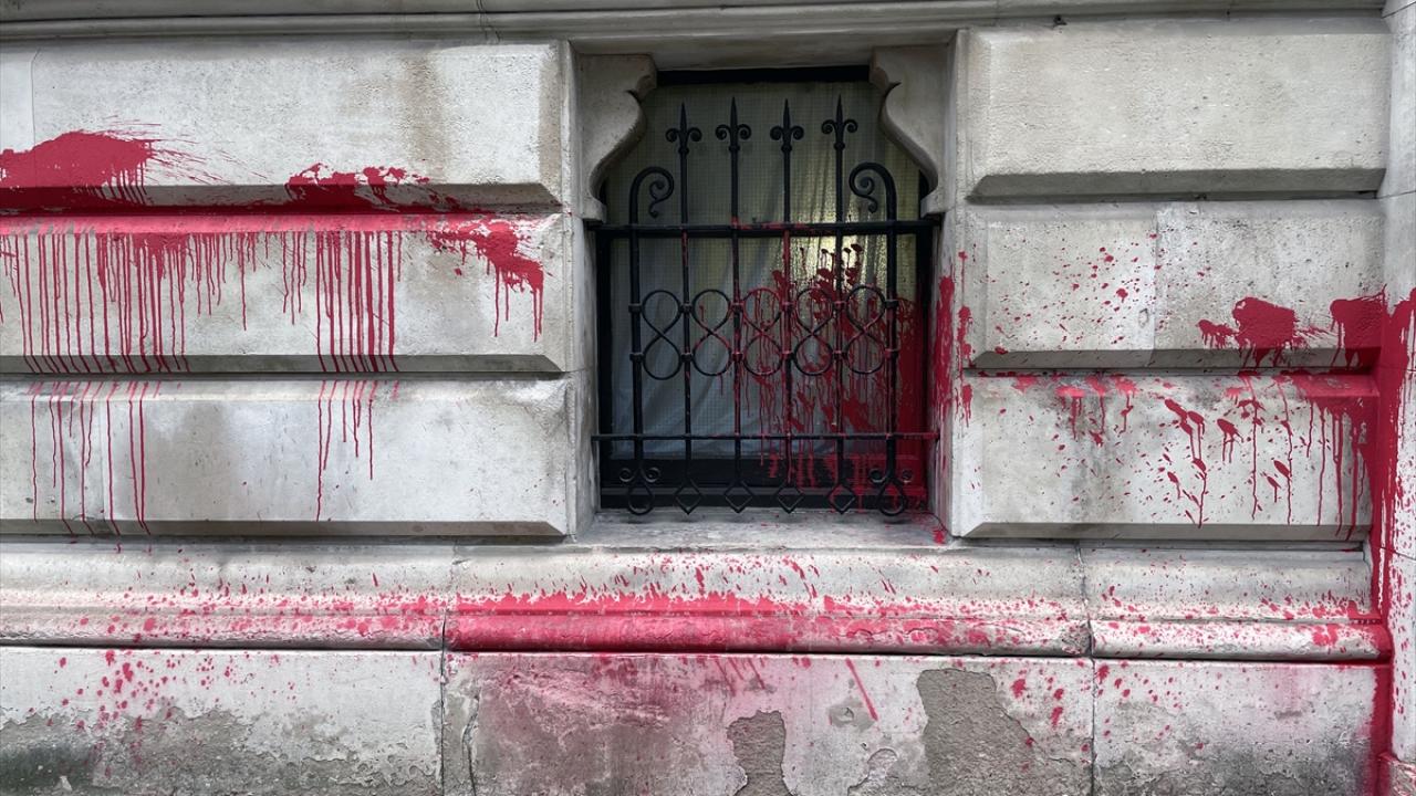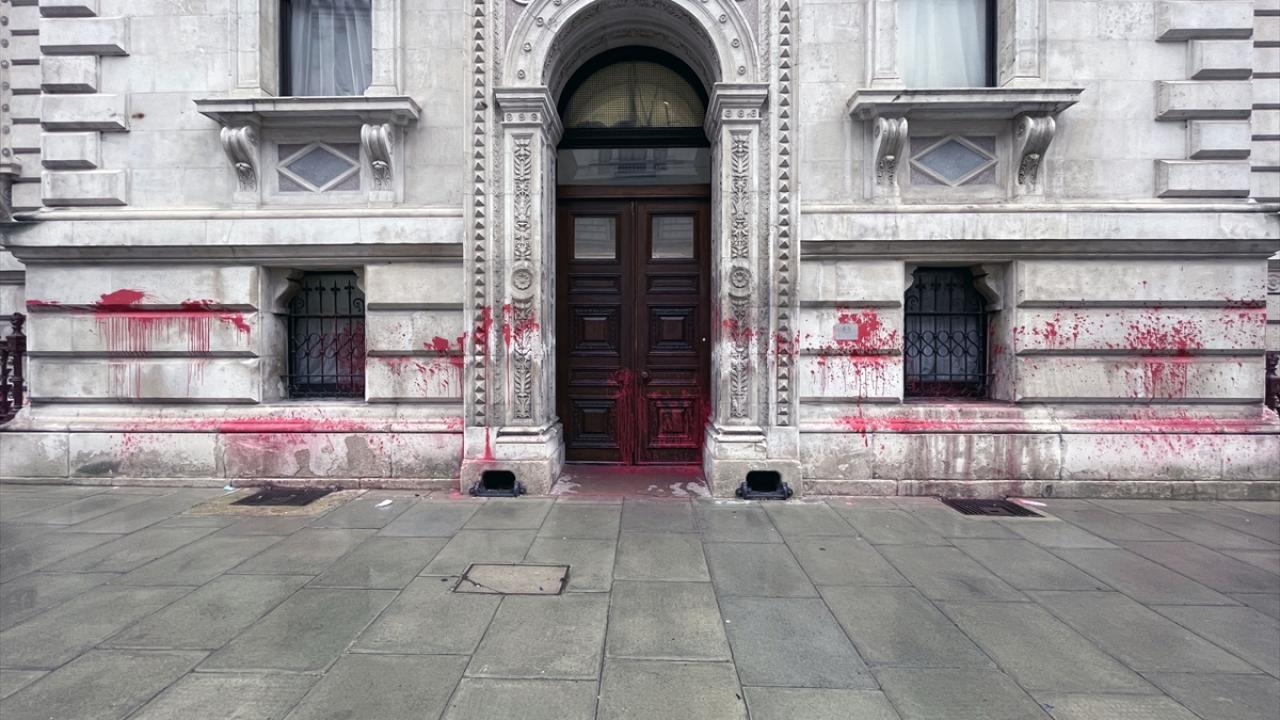 İngiltere'de Filistin destekçisi bir grup, başkent Londra’da Dışişleri Bakanlığı binasının duvarlarına Balfour Deklarasyonu'nun 106. yıldönümü sebebiyle kırmızı boya atarak protesto etti.