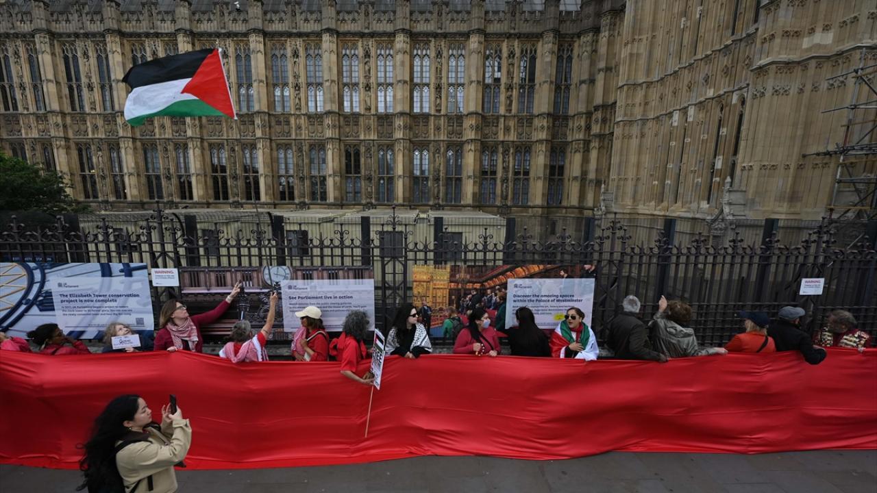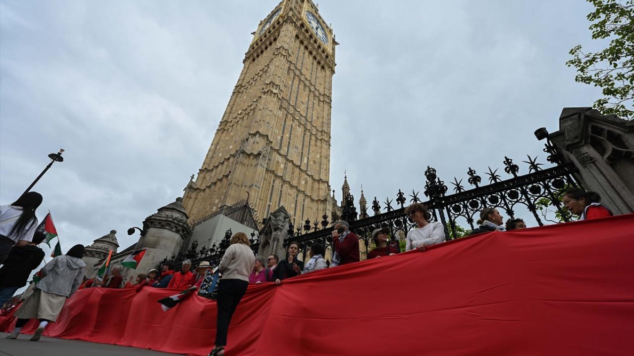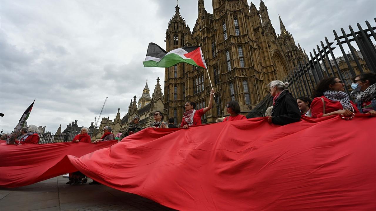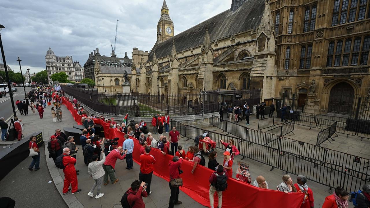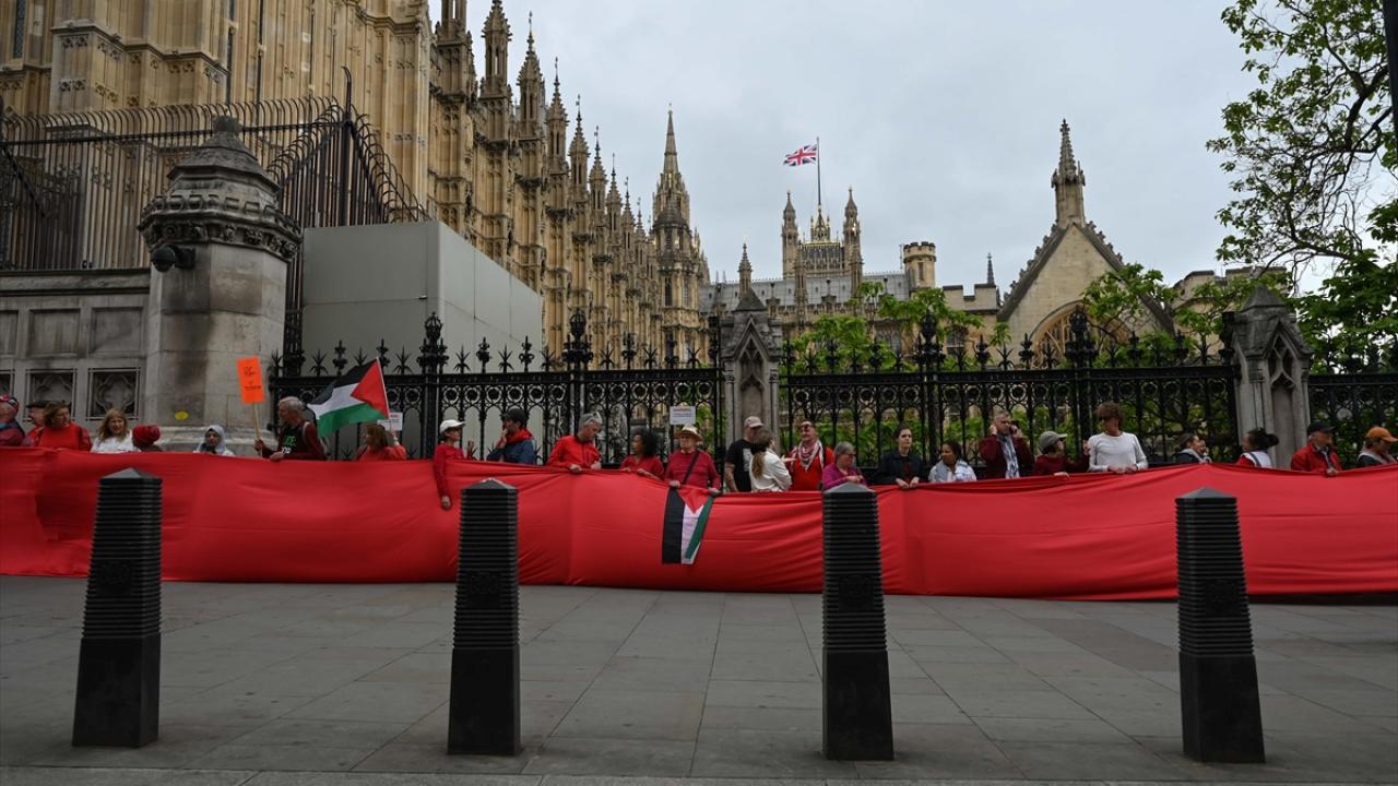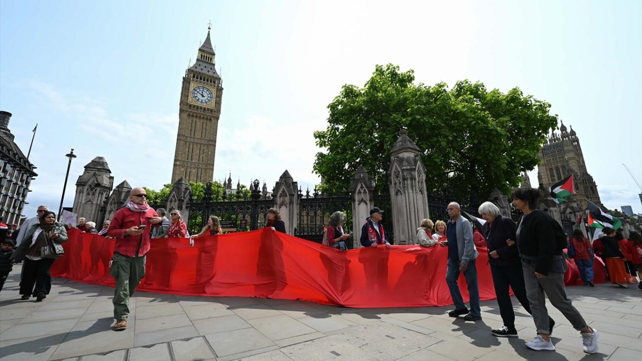 İngiltere’nin İsrail'e silah satışını protesto eden binlerce gösterici, başkent Londra'daki parlamento binası önünde kırmızı giysilerle ve ellerinde tuttukları kırmızı örtüyle insan zinciri oluşturarak sembolik "kırmızı duvar" ördü.