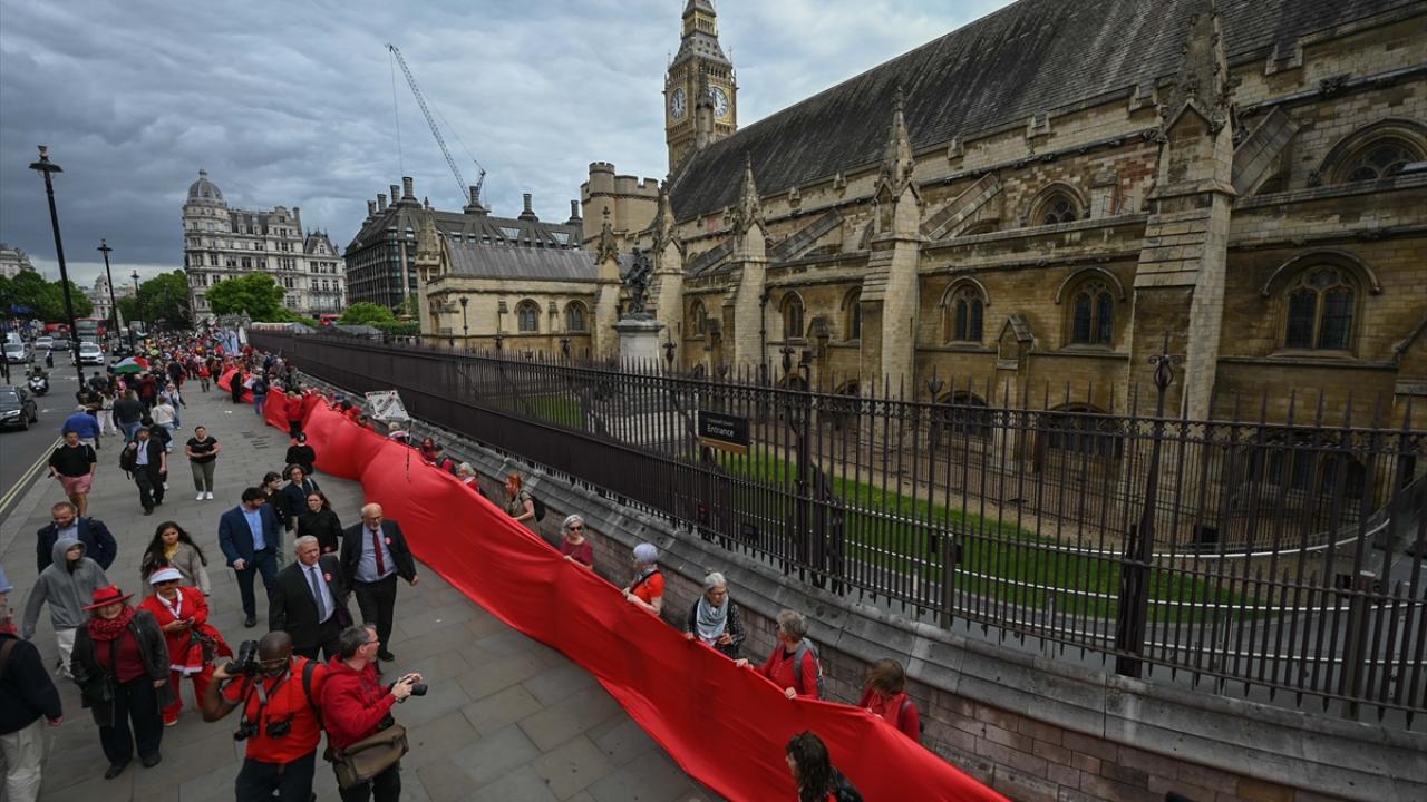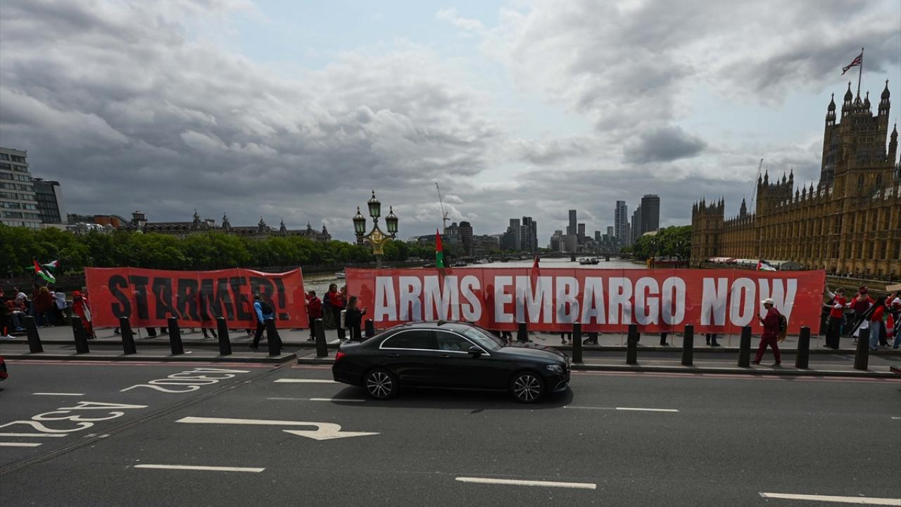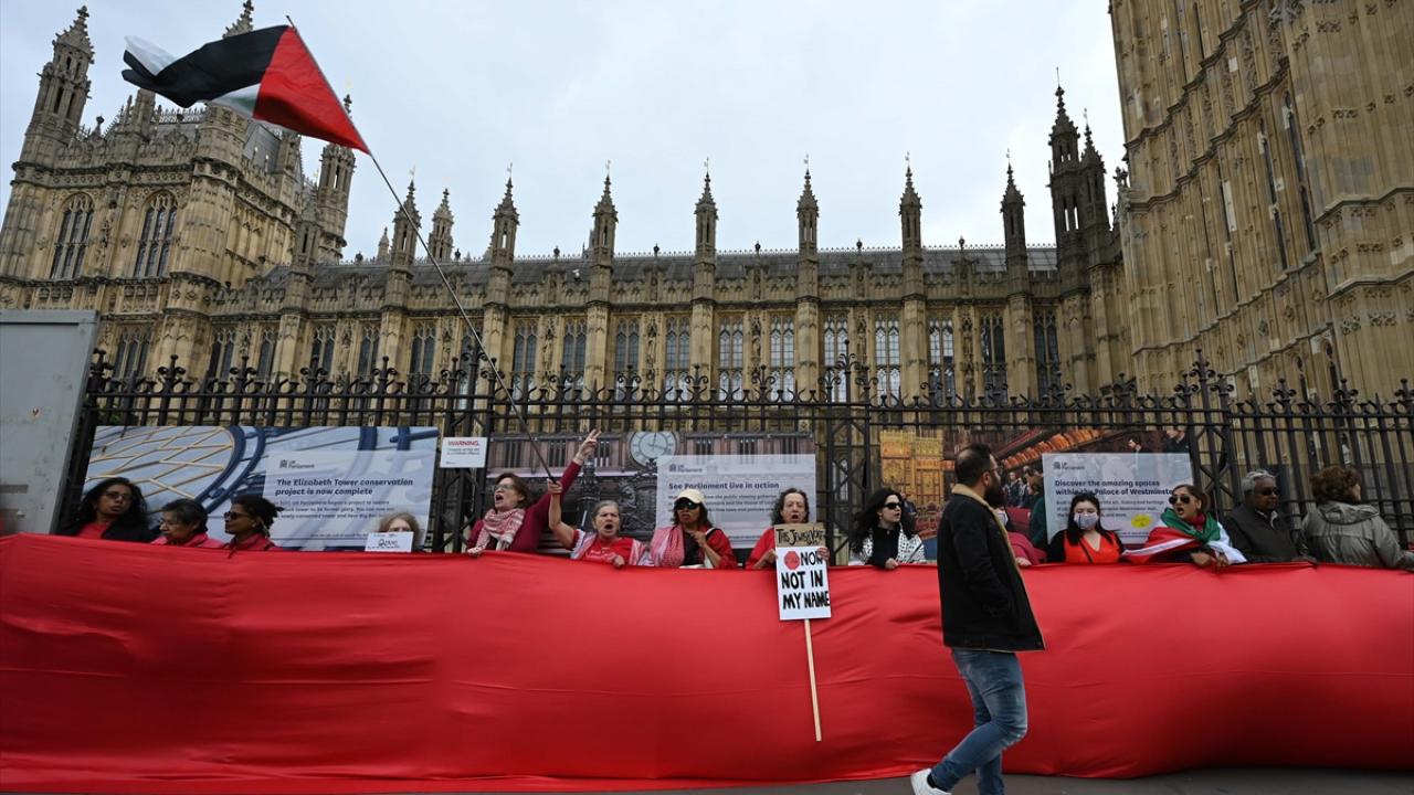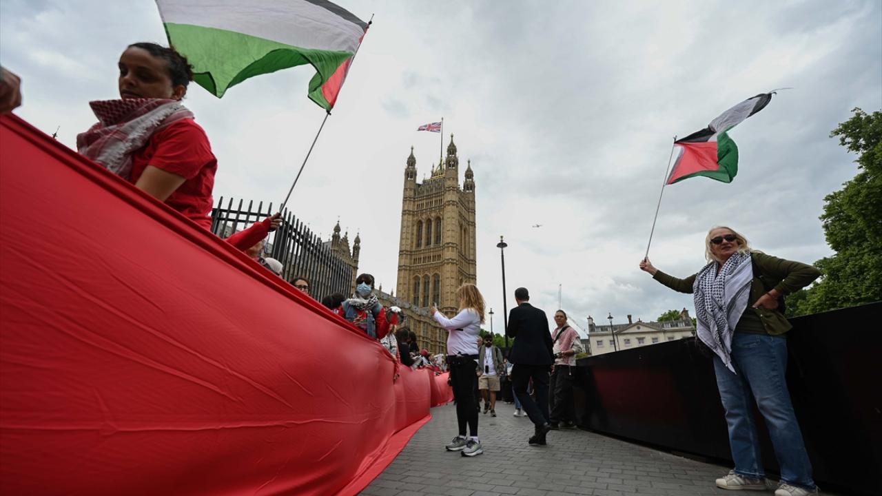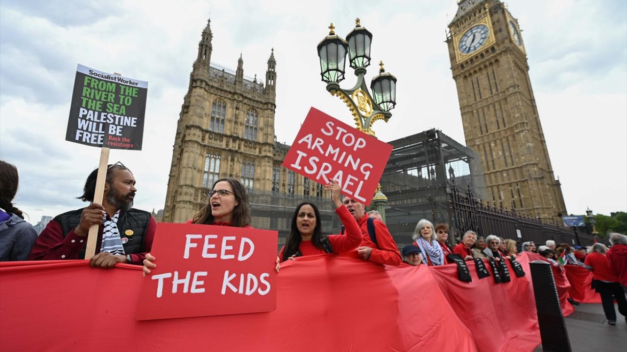 İngiltere’nin İsrail'e silah satışını protesto eden binlerce gösterici, başkent Londra'daki parlamento binası önünde kırmızı giysilerle ve ellerinde tuttukları kırmızı örtüyle insan zinciri oluşturarak sembolik "kırmızı duvar" ördü.