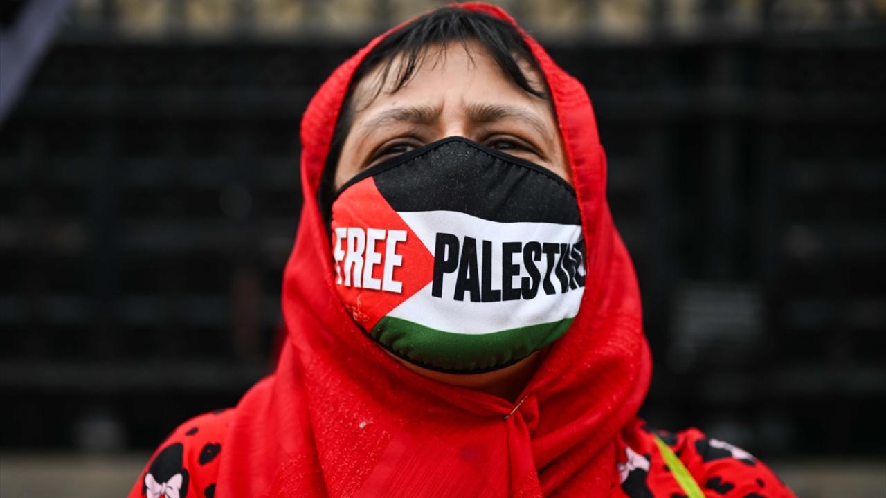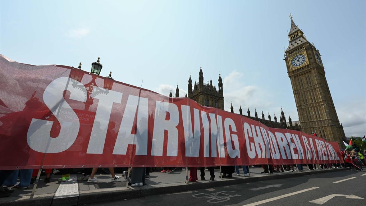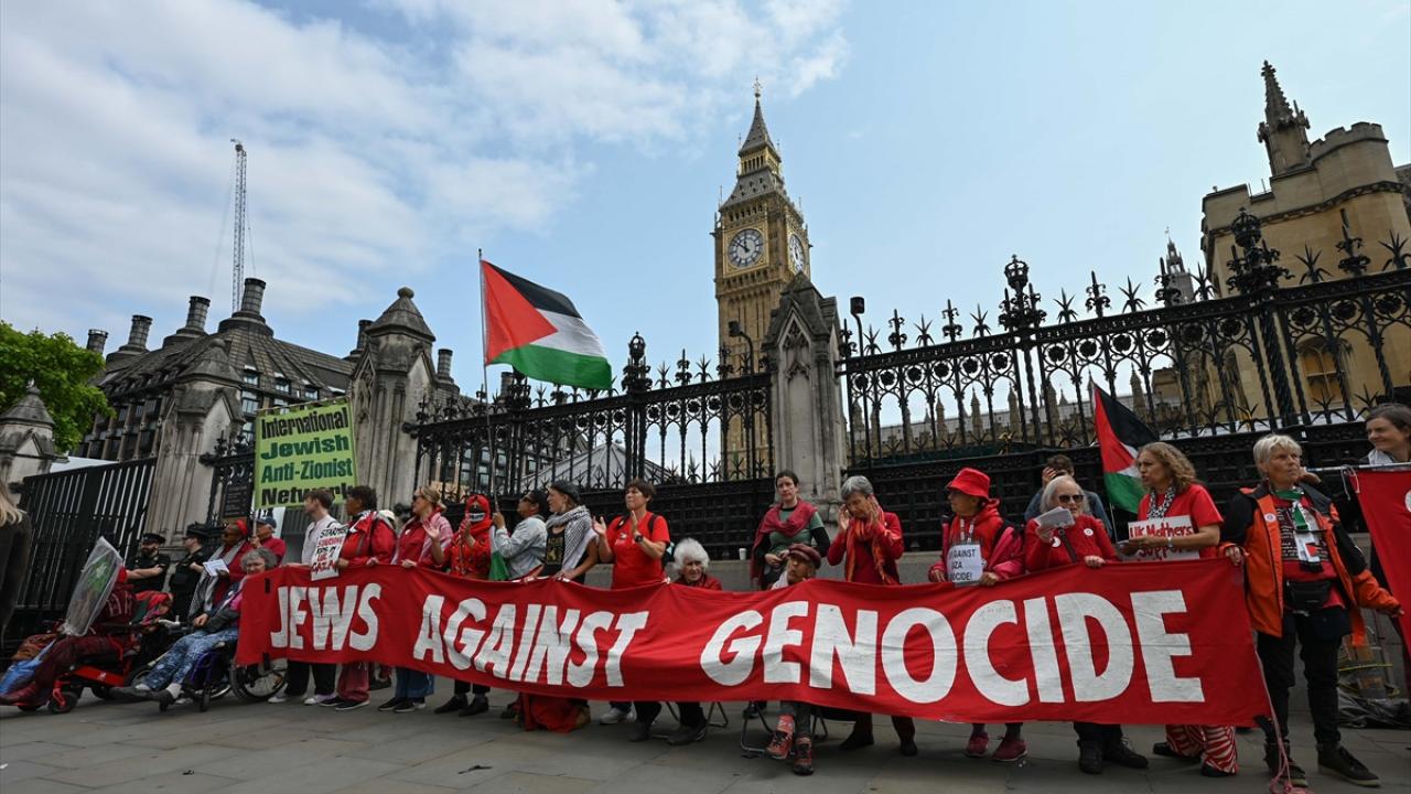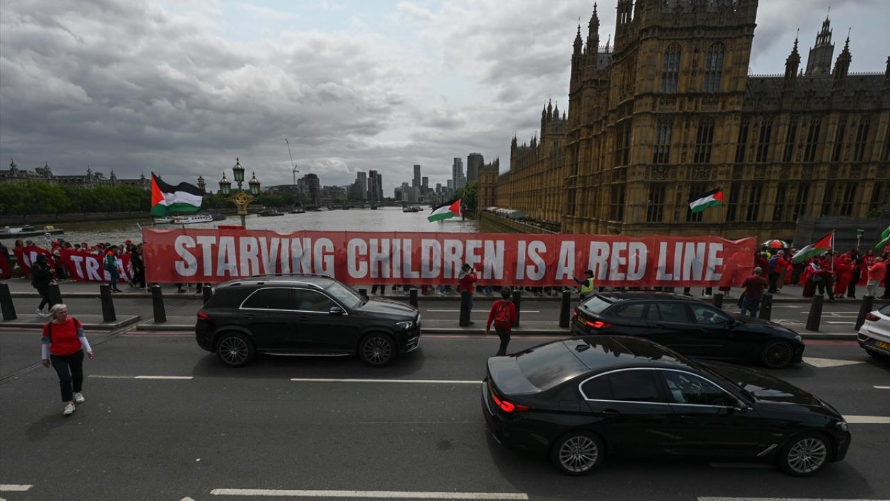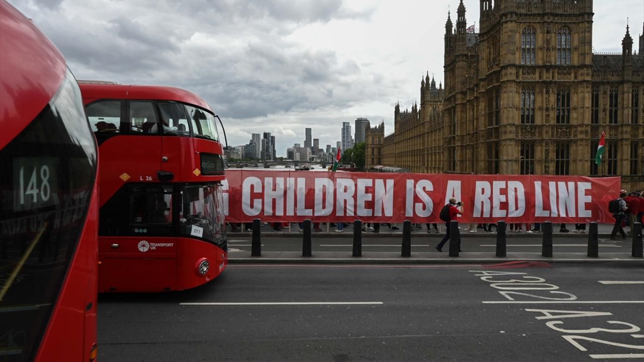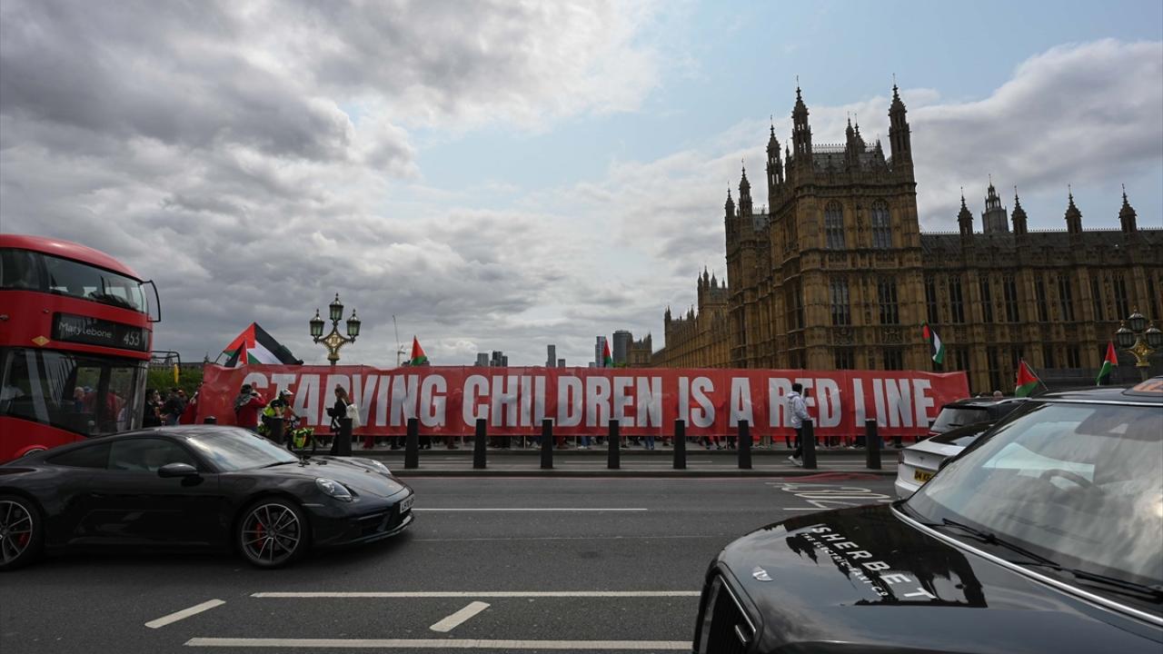 İngiltere’nin İsrail'e silah satışını protesto eden binlerce gösterici, başkent Londra'daki parlamento binası önünde kırmızı giysilerle ve ellerinde tuttukları kırmızı örtüyle insan zinciri oluşturarak sembolik "kırmızı duvar" ördü.