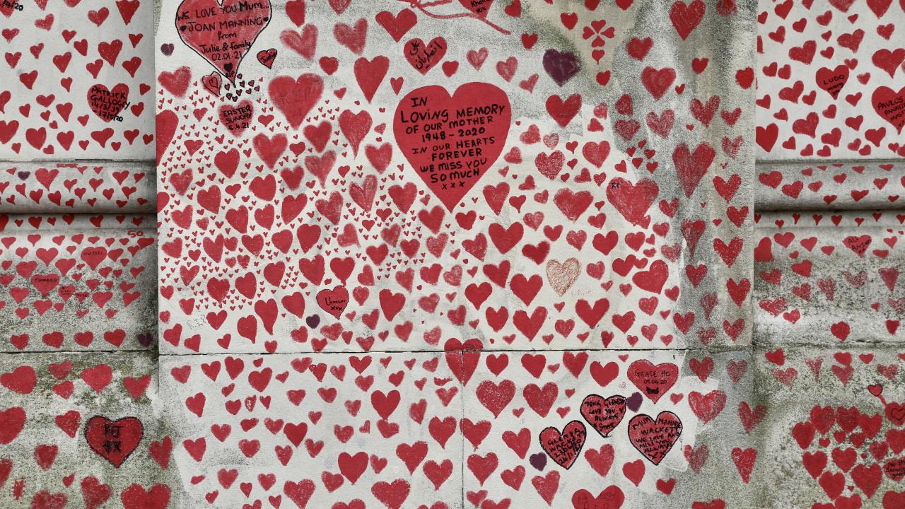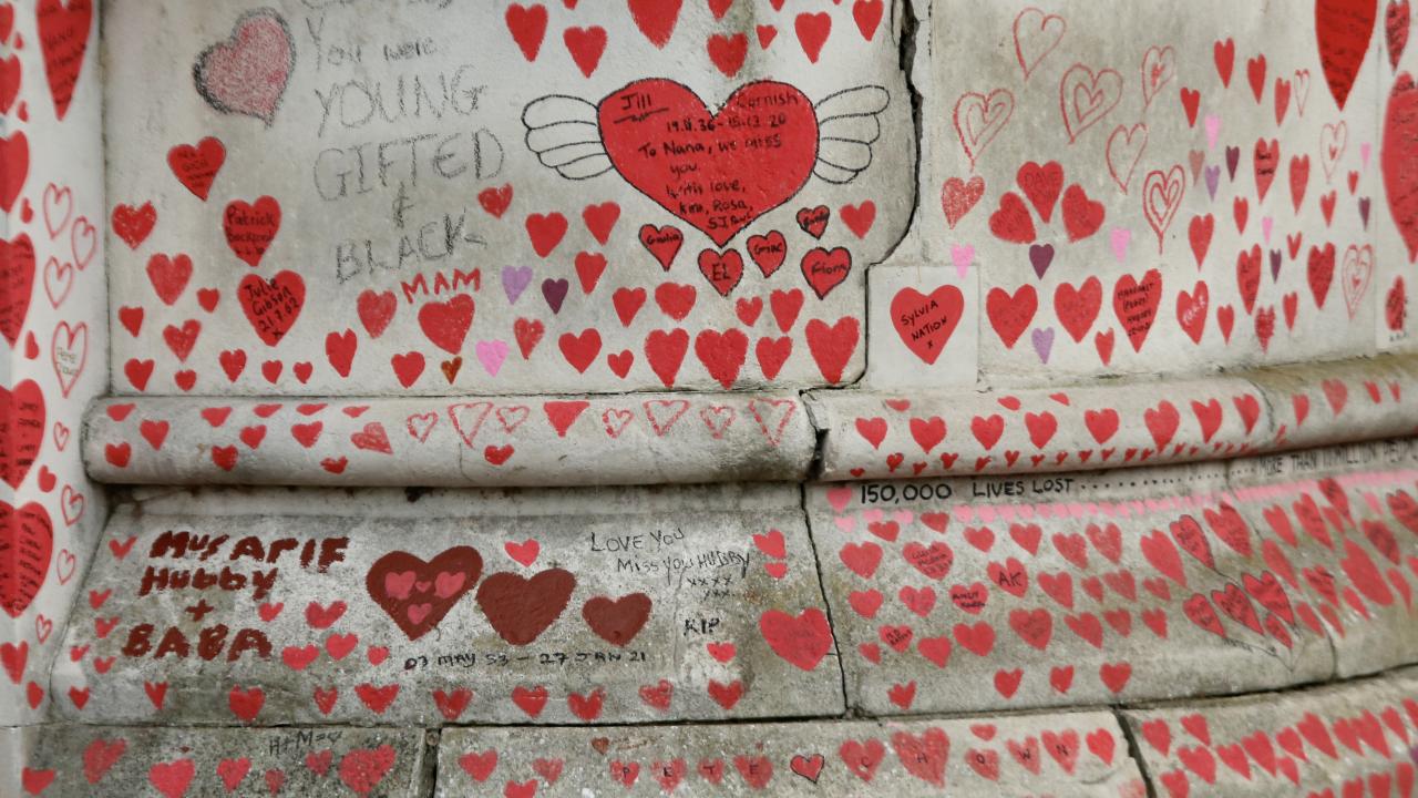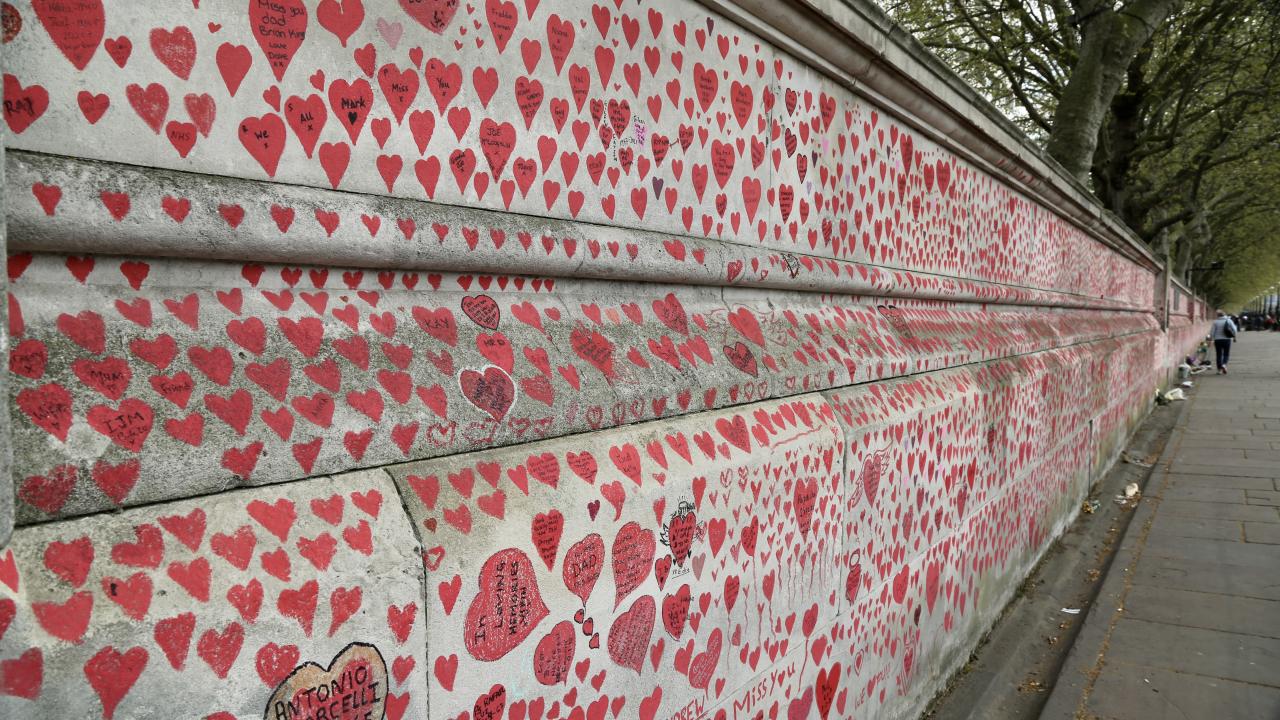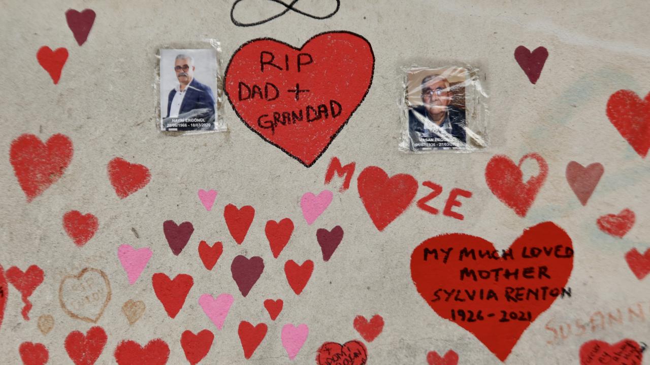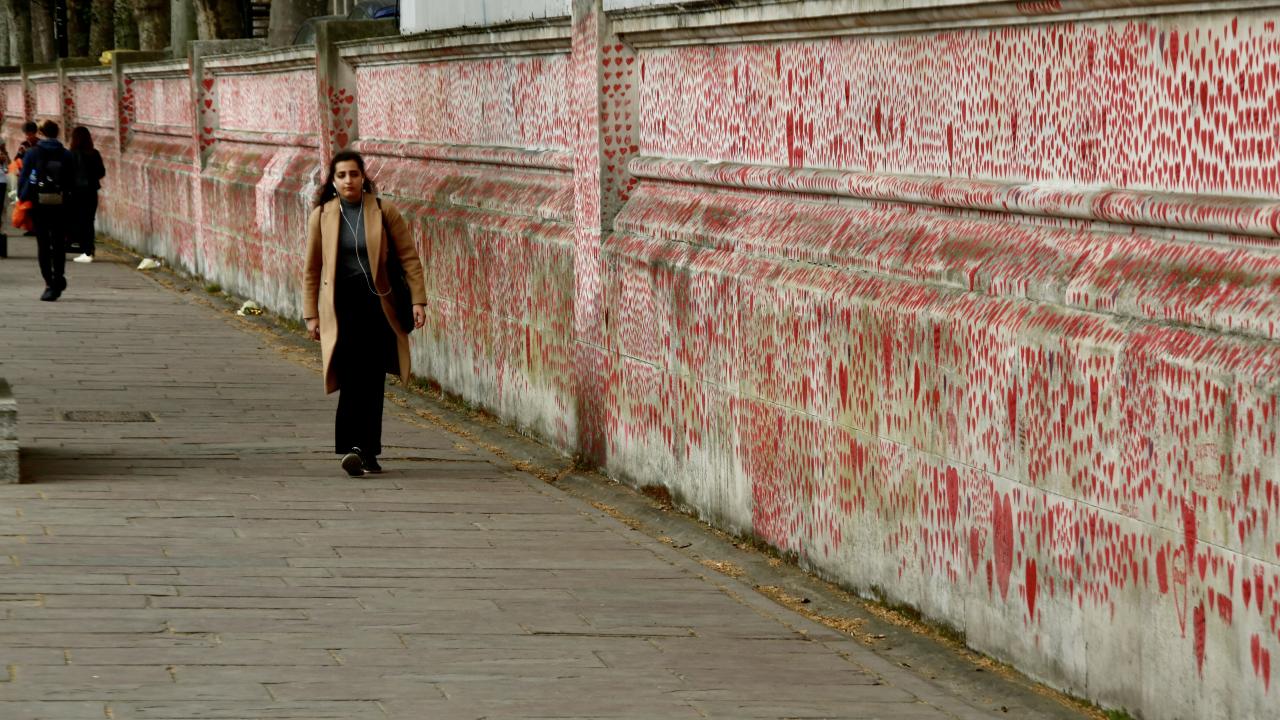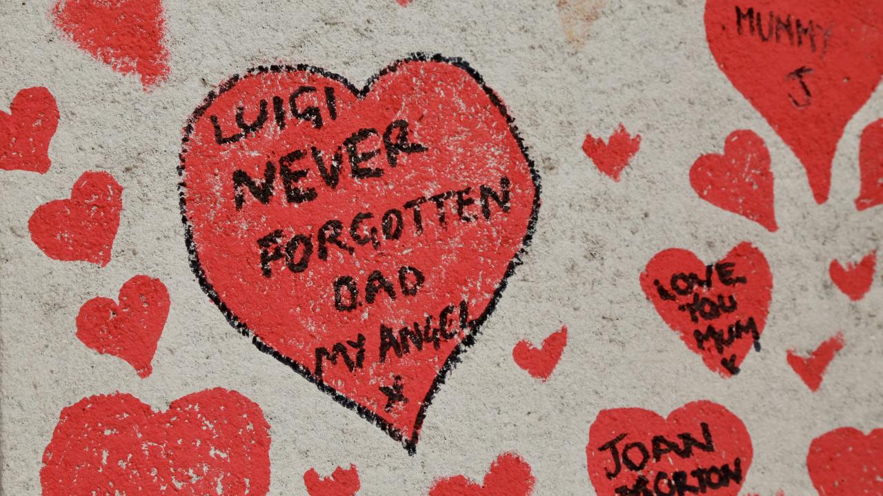 İngiltere’de koronavirüs nedeniyle hayatını kaybedenler için Londra'da 150 bin kalbin çizildiği bir anma duvarı oluşturuldu.