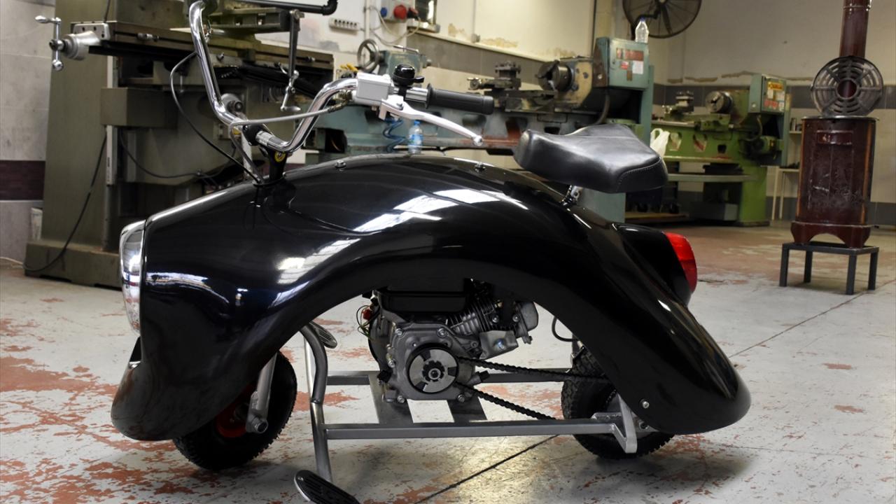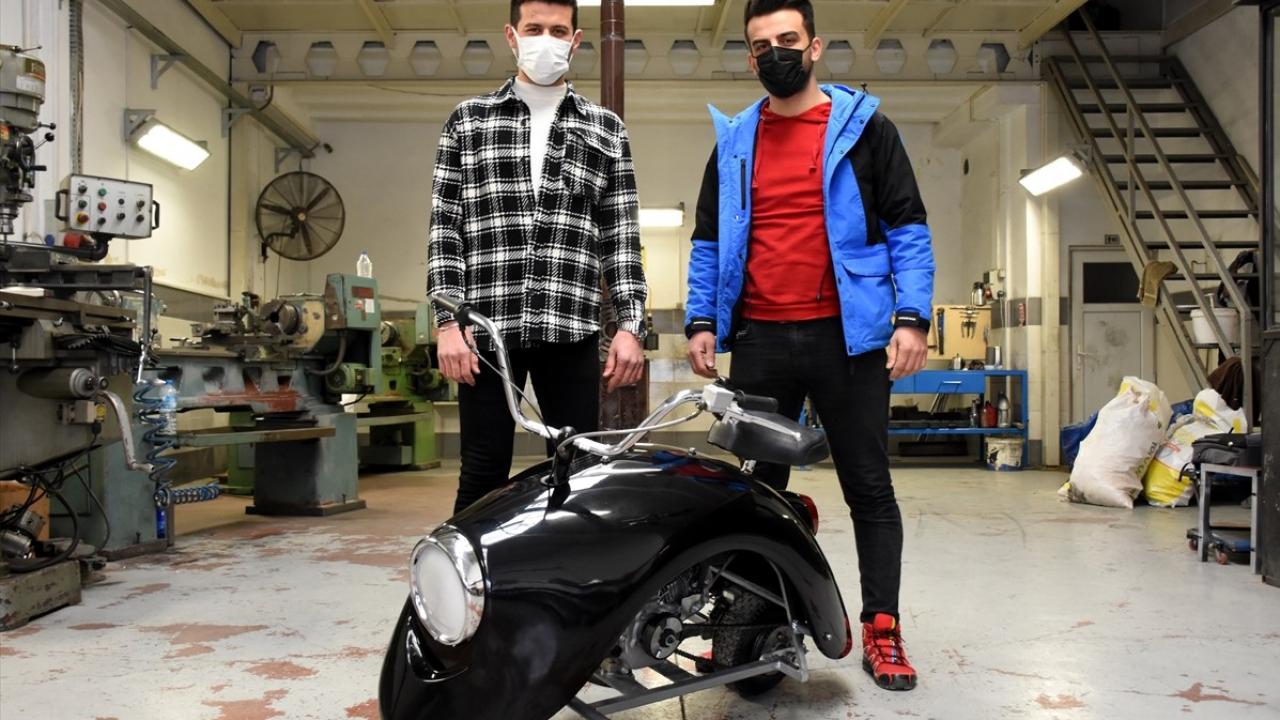 İki arkadaş çapa motoruyla çalışan ve sadece 60 kilogram ağırlığında olan kendi motosikletlerini 1,5 ayda torna dükkanında üretti.