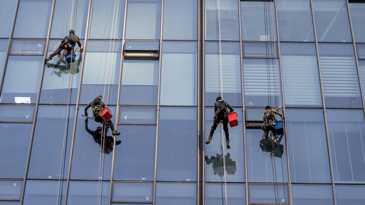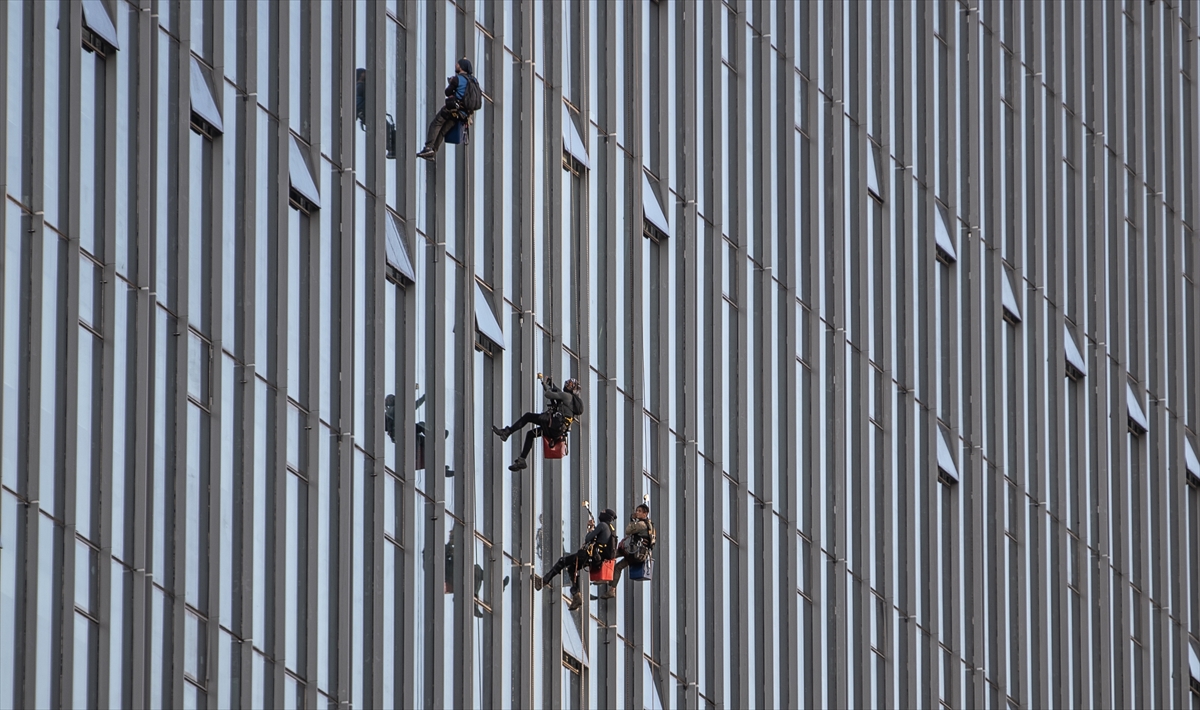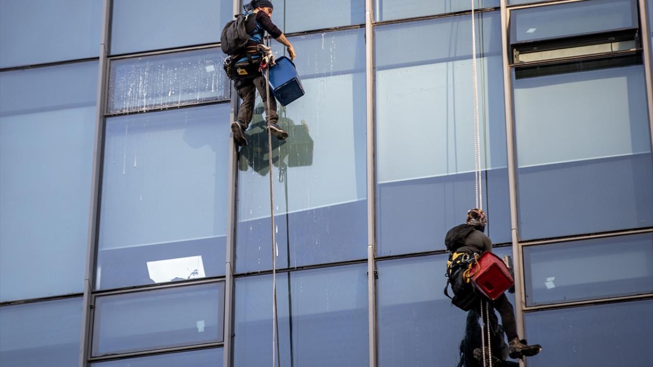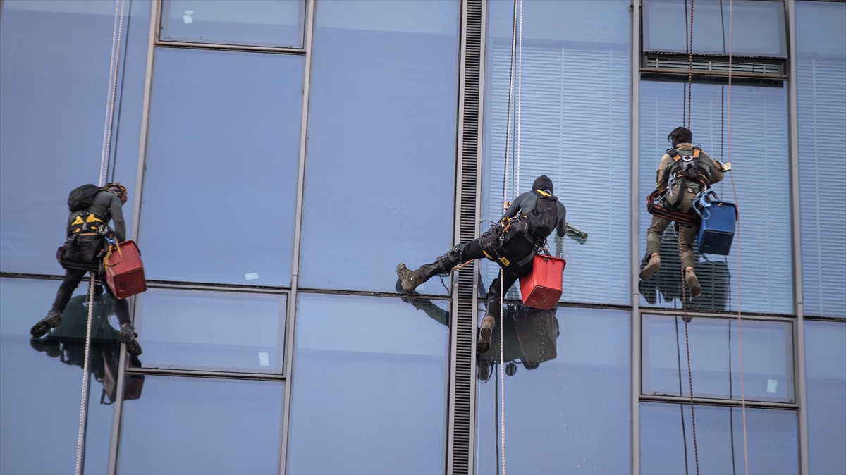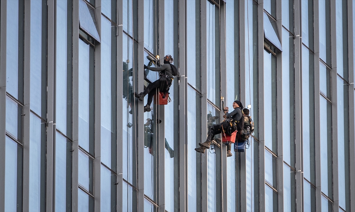 Ankara’nın Çankaya ilçesinde bulunan bir iş merkezinin dış cephe temizliği ve bakımını yapan iple erişim teknisyenlerinin zorlu mesaisi görüntülendi.