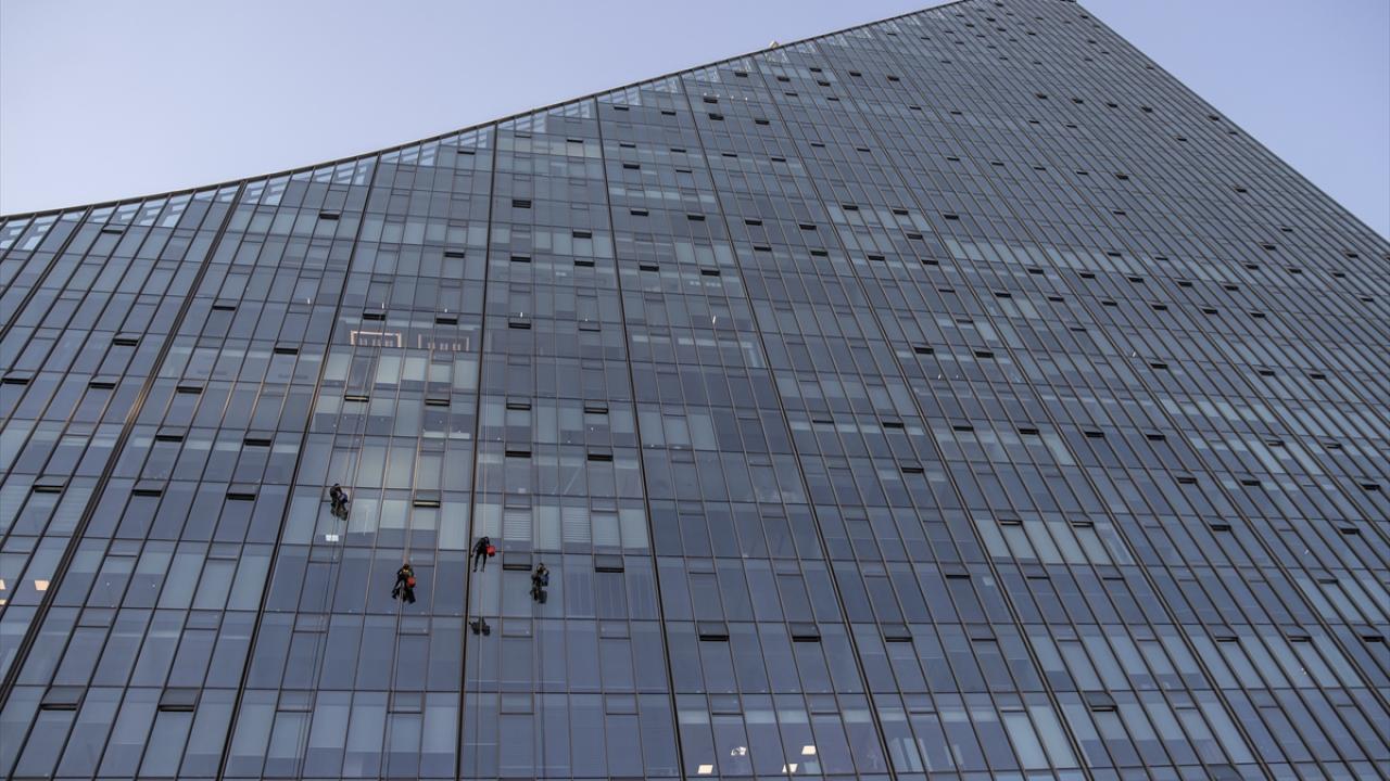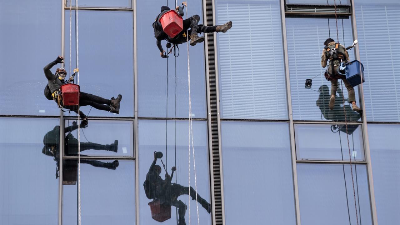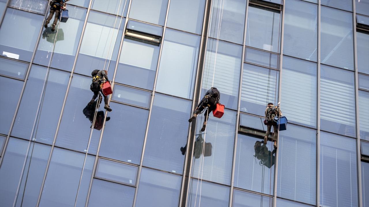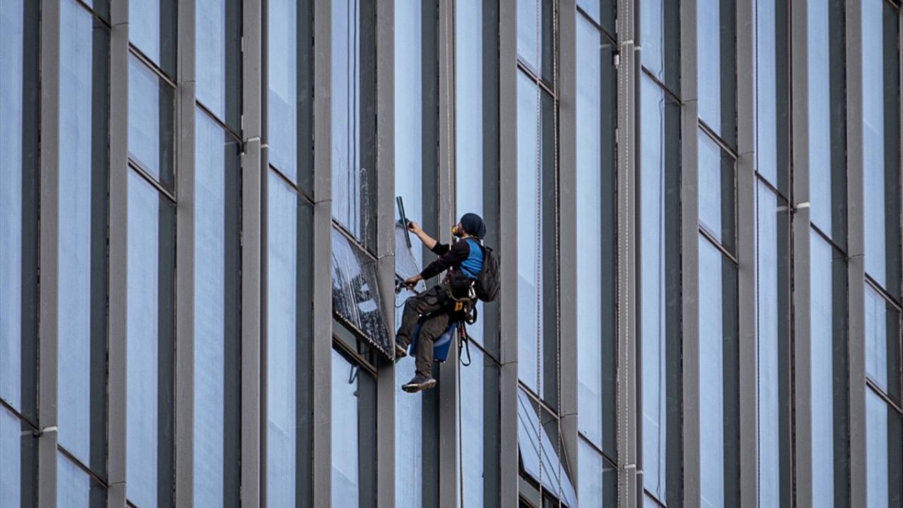 Ankara’nın Çankaya ilçesinde bulunan bir iş merkezinin dış cephe temizliği ve bakımını yapan iple erişim teknisyenlerinin zorlu mesaisi görüntülendi.
