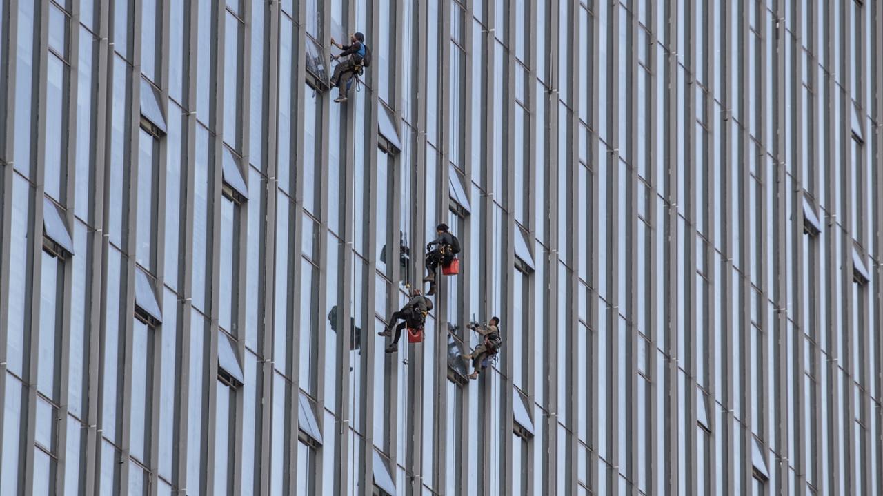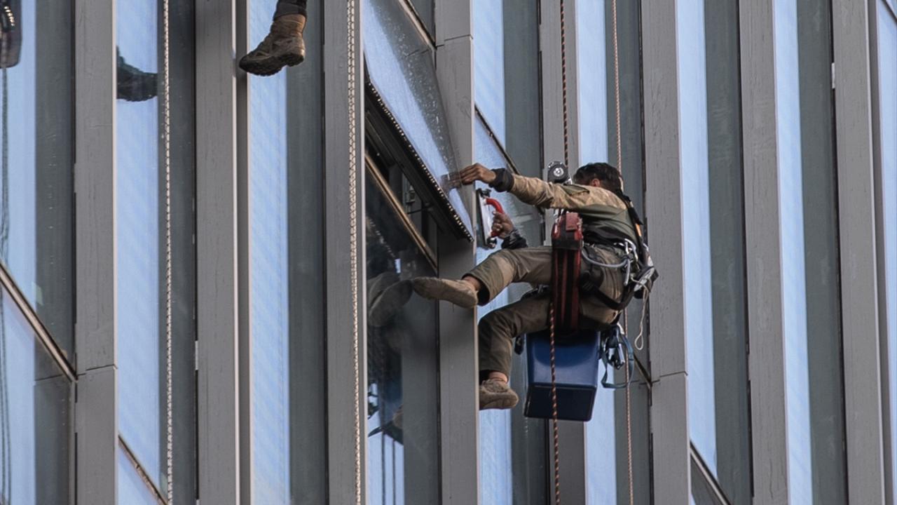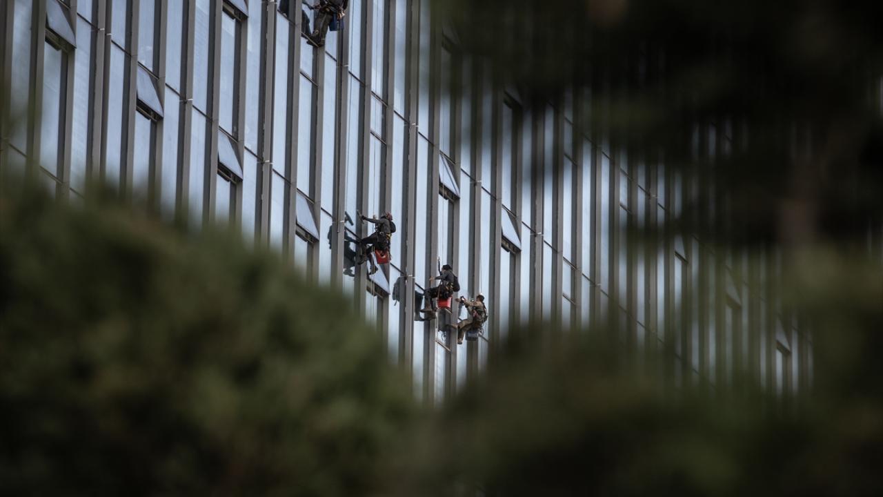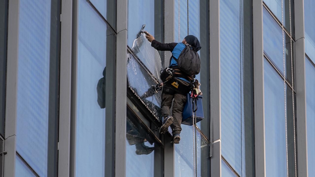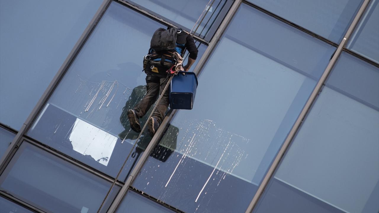 Ankara’nın Çankaya ilçesinde bulunan bir iş merkezinin dış cephe temizliği ve bakımını yapan iple erişim teknisyenlerinin zorlu mesaisi görüntülendi.