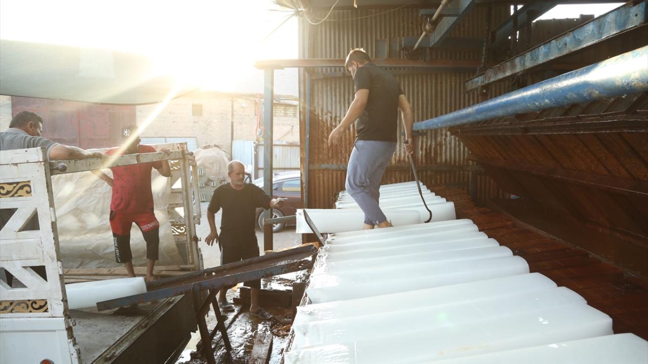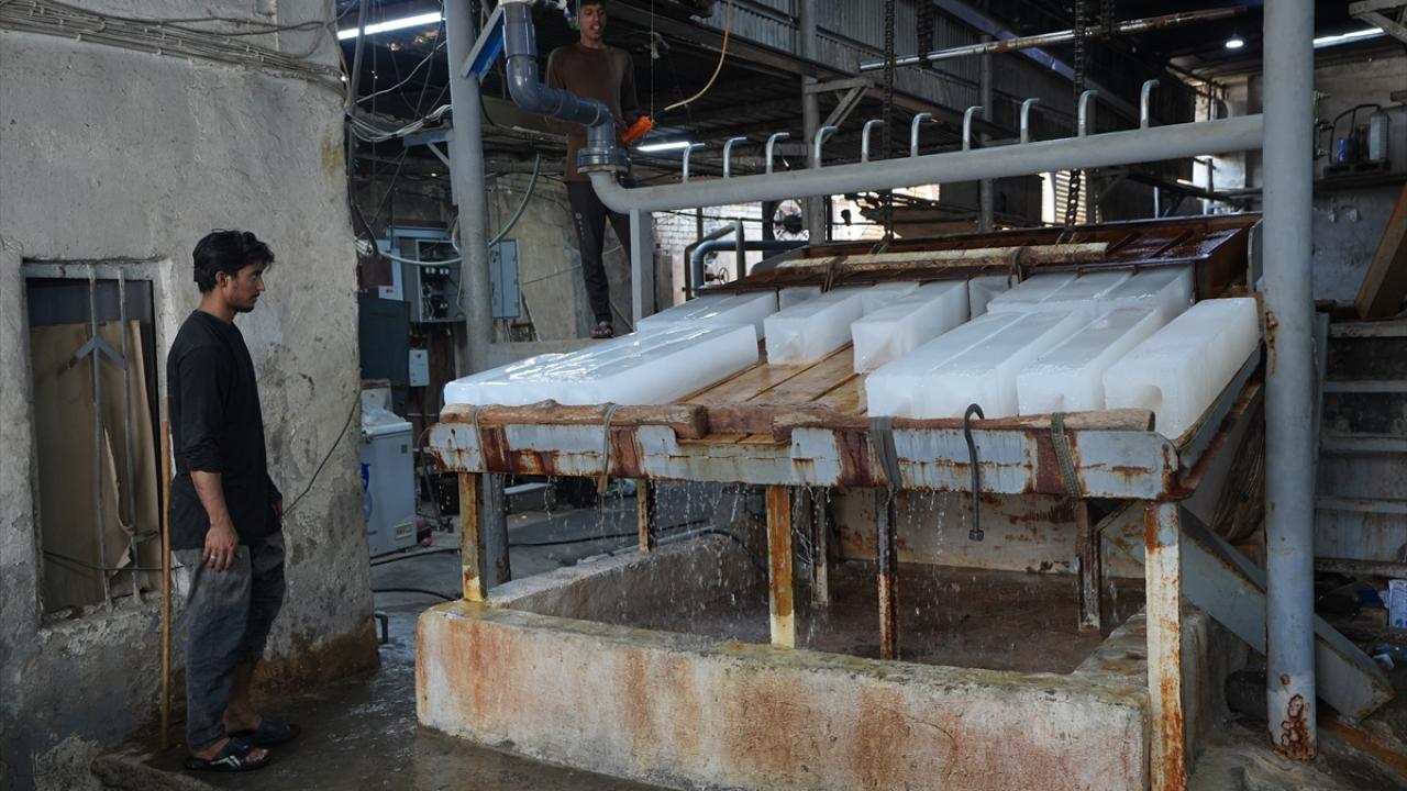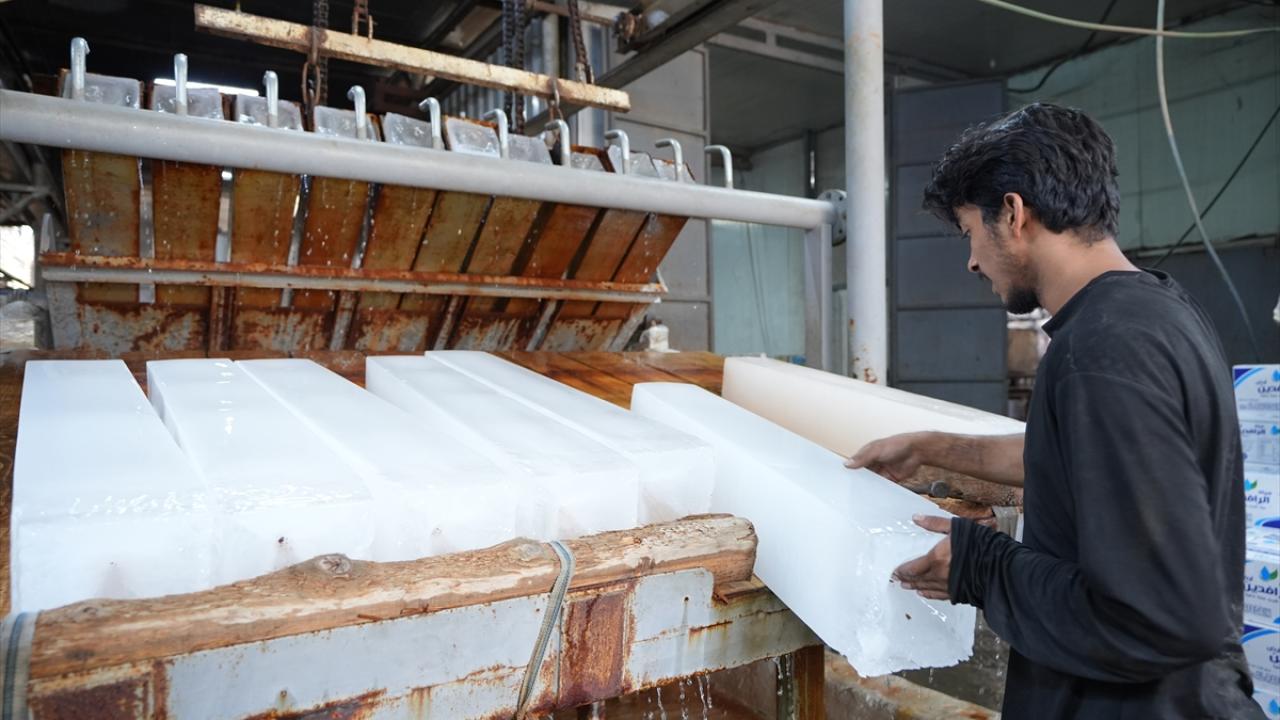 Başkent Bağdat`taki bir buz fabrikasında çalışan işçiler, artan buz talebini karşılayabilmek için yoğun mesai harcıyor.