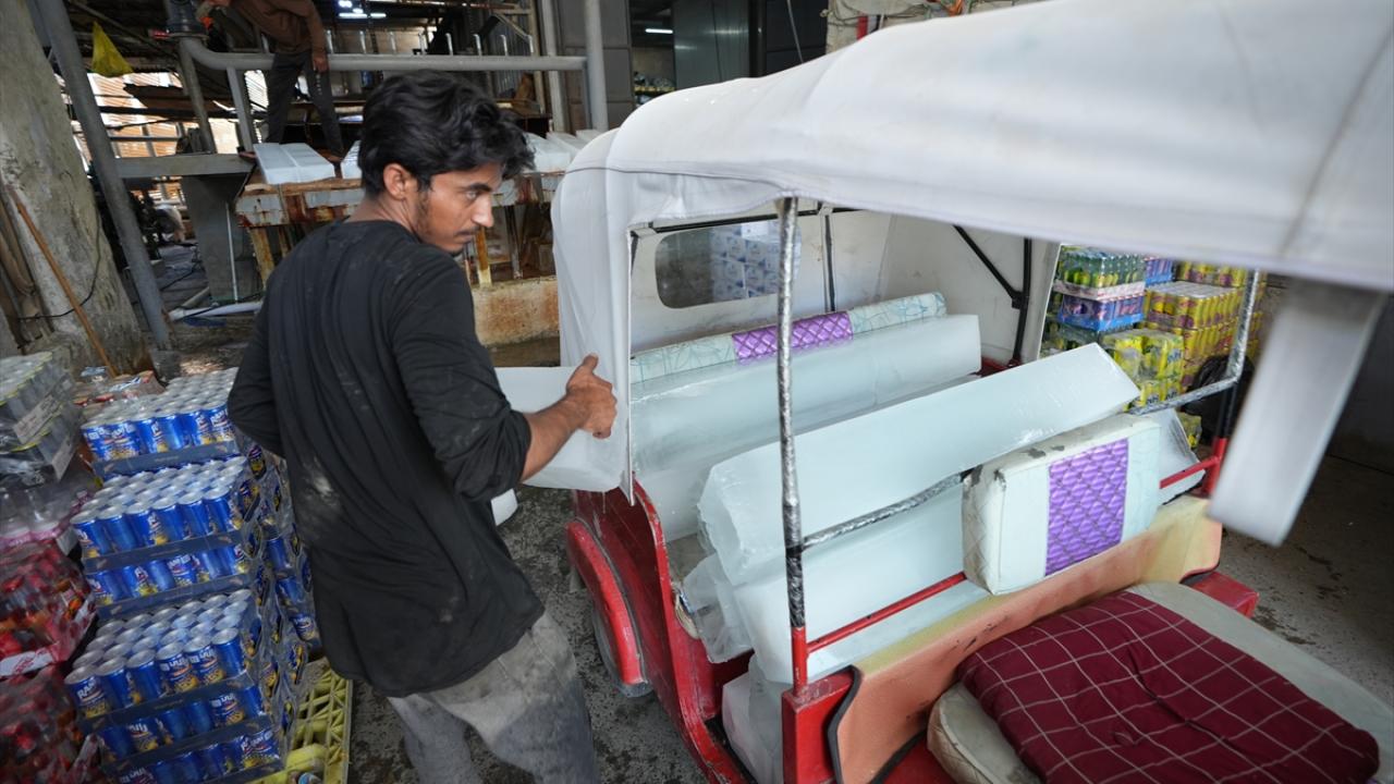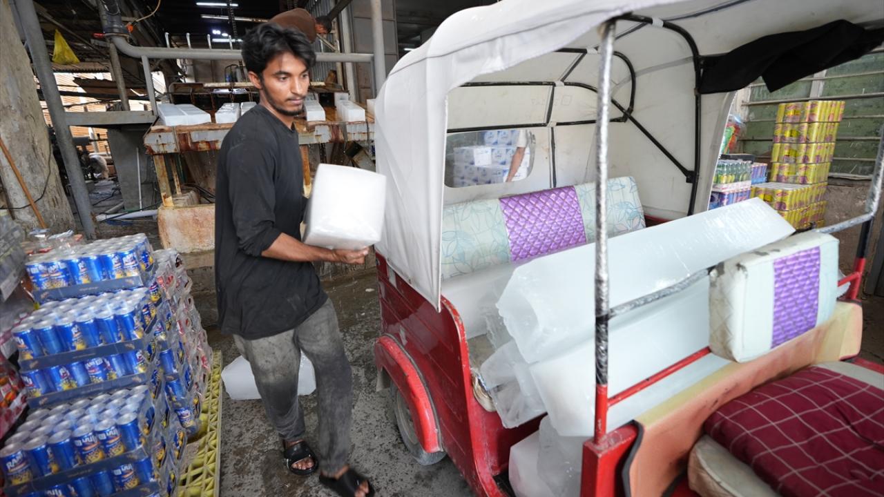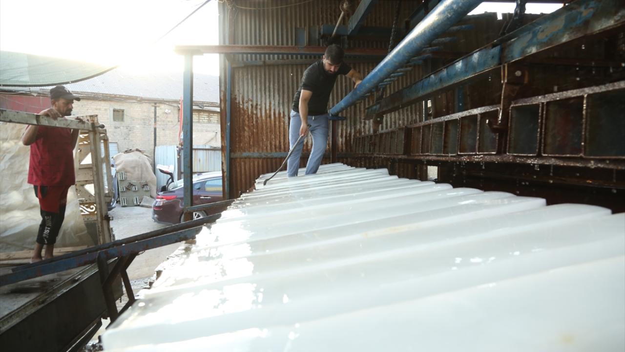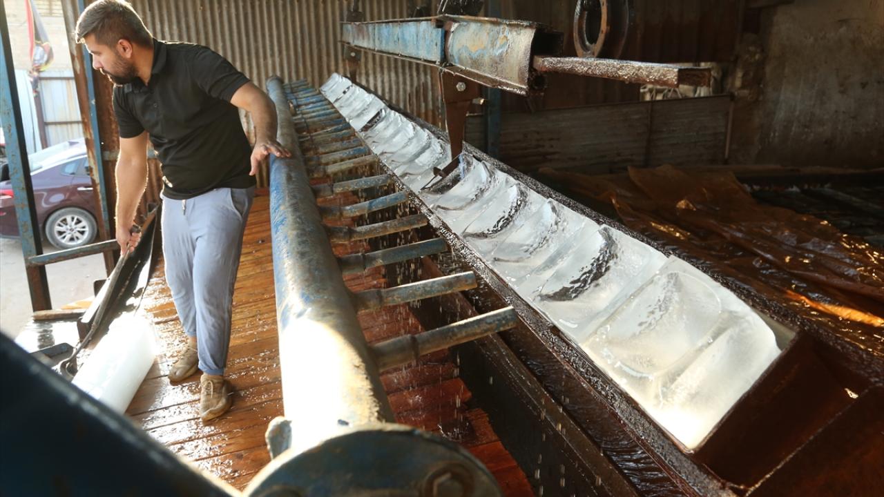 Başkent Bağdat`taki bir buz fabrikasında çalışan işçiler, artan buz talebini karşılayabilmek için yoğun mesai harcıyor.