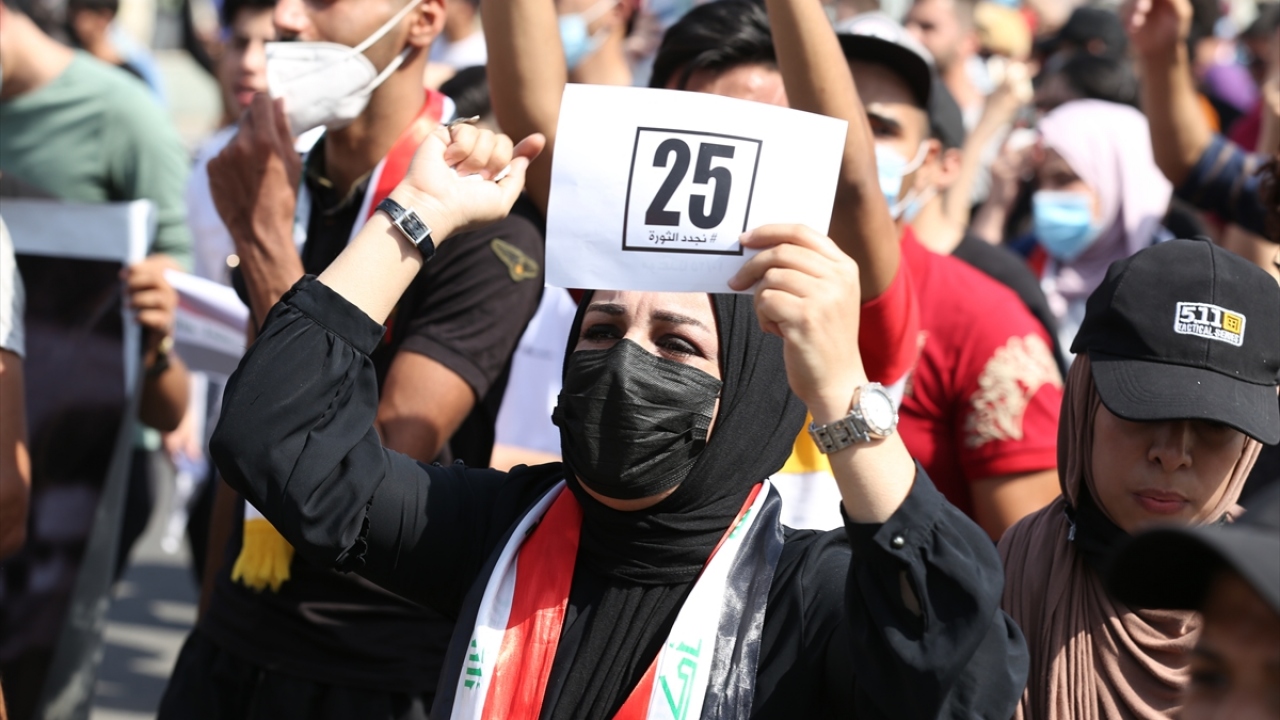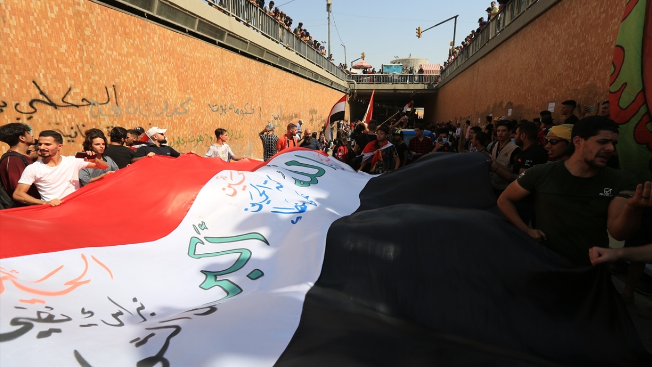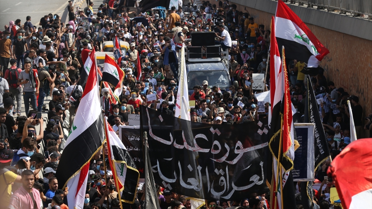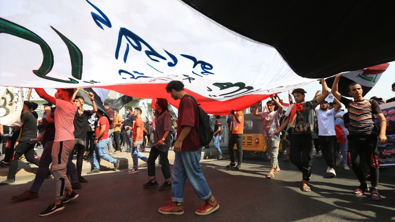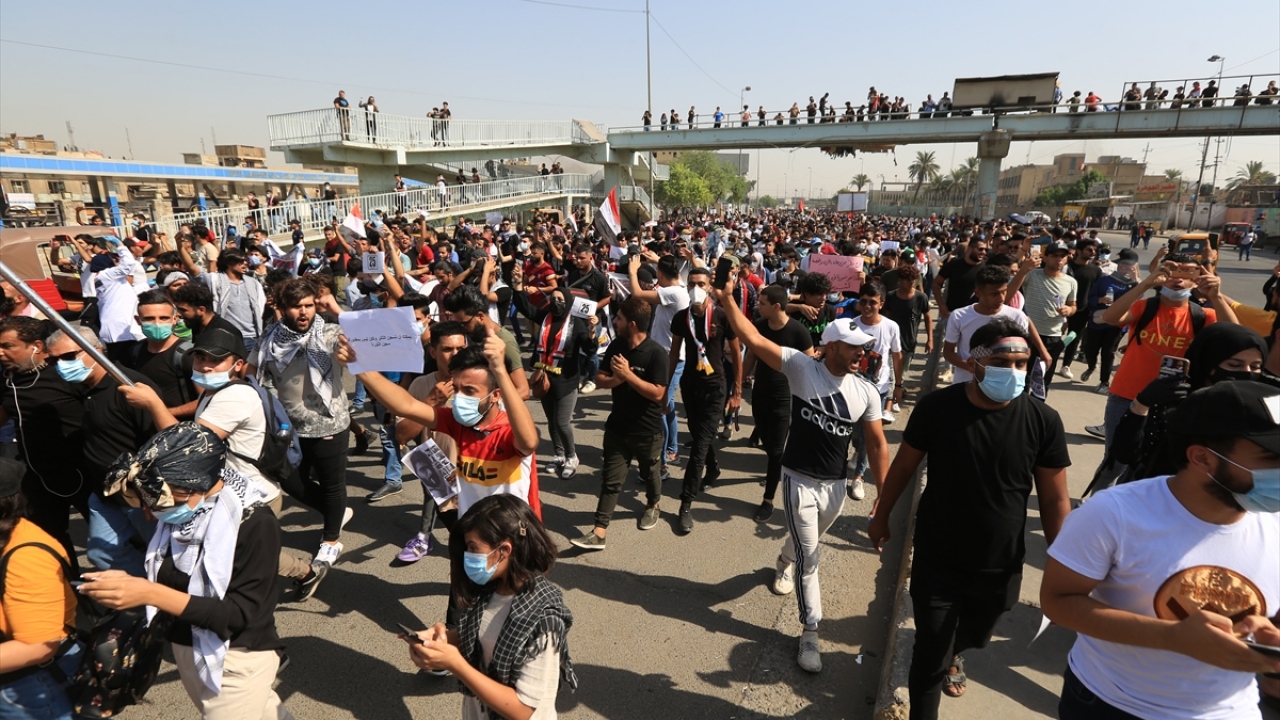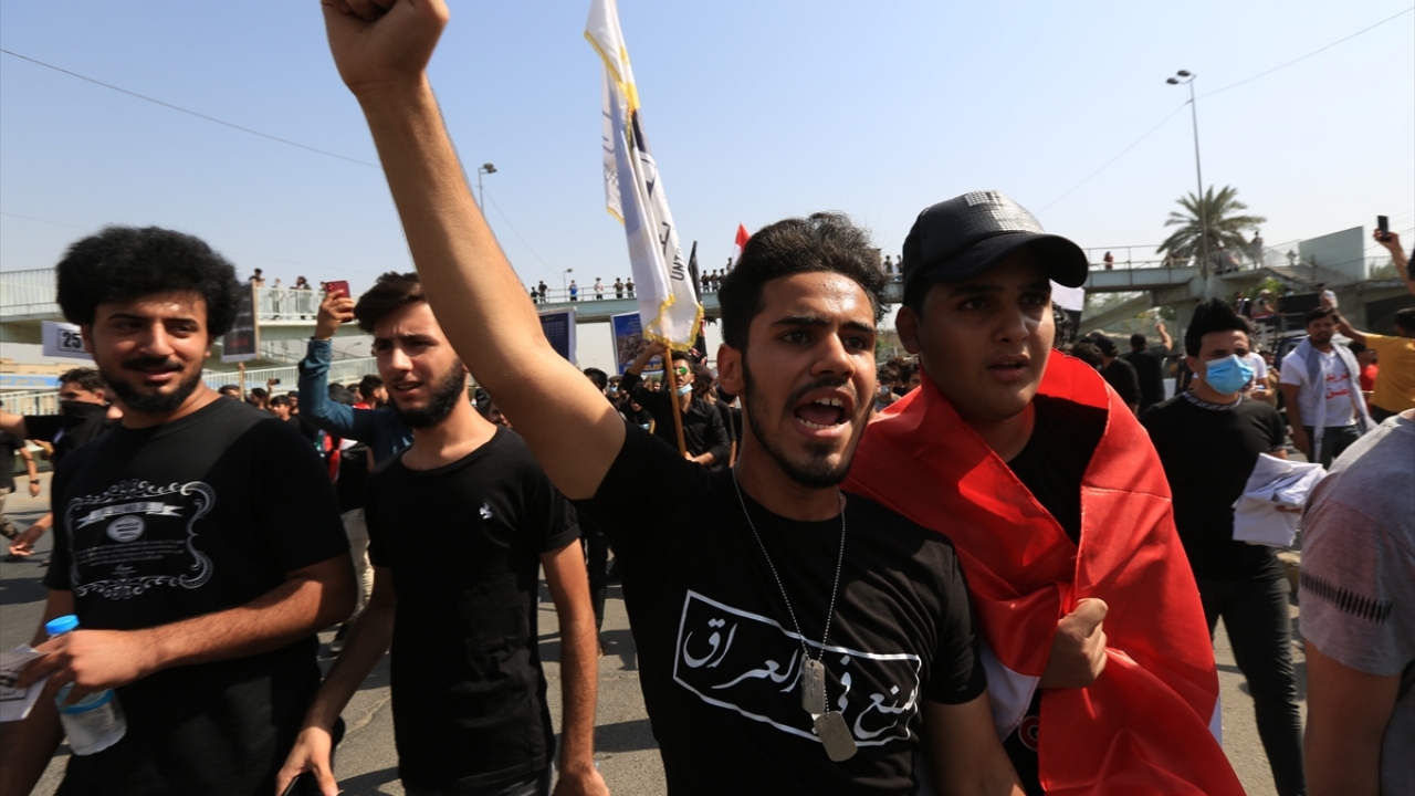 Irak'ın başkenti Bağdat'ta toplanan ve çoğunluğu öğrencilerden oluşan göstericiler, 1 Ekim 2019'da gerçekleştirilen hükümet karşıtı gösterilerin birinci yıl dönümü dolayısıyla Milli Eğitim Bakanlığı binası önünden Tahrir Meydanı'na yürüyüş düzenledi.