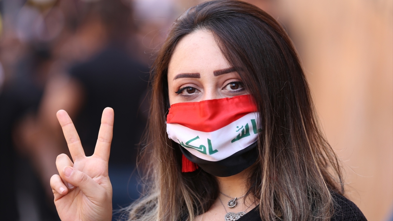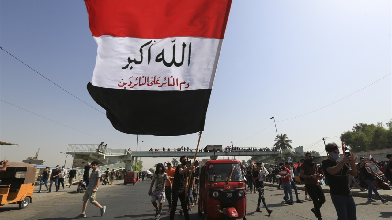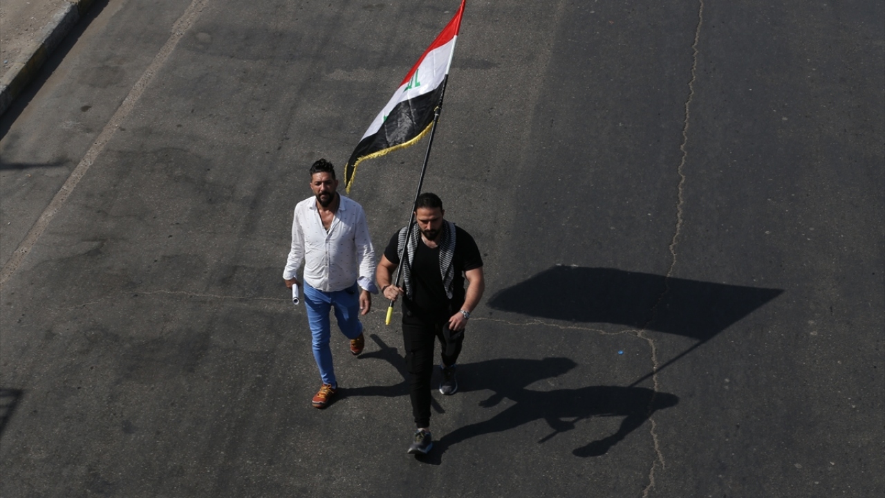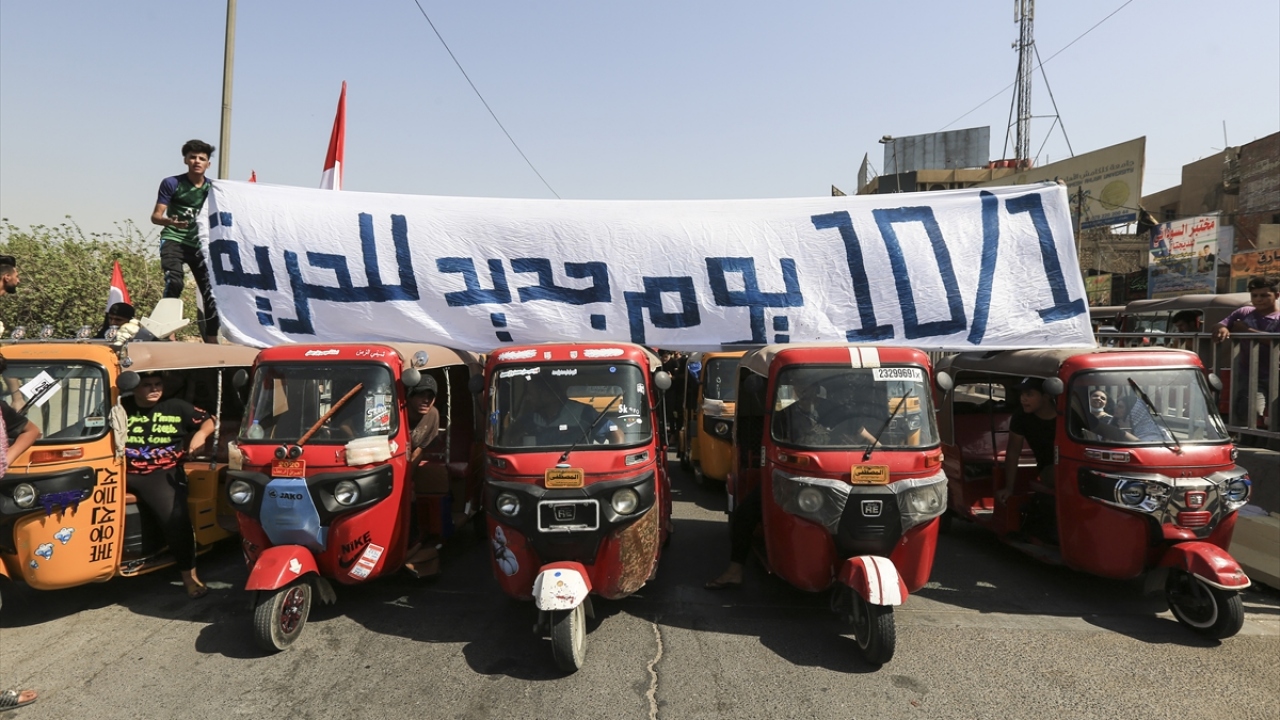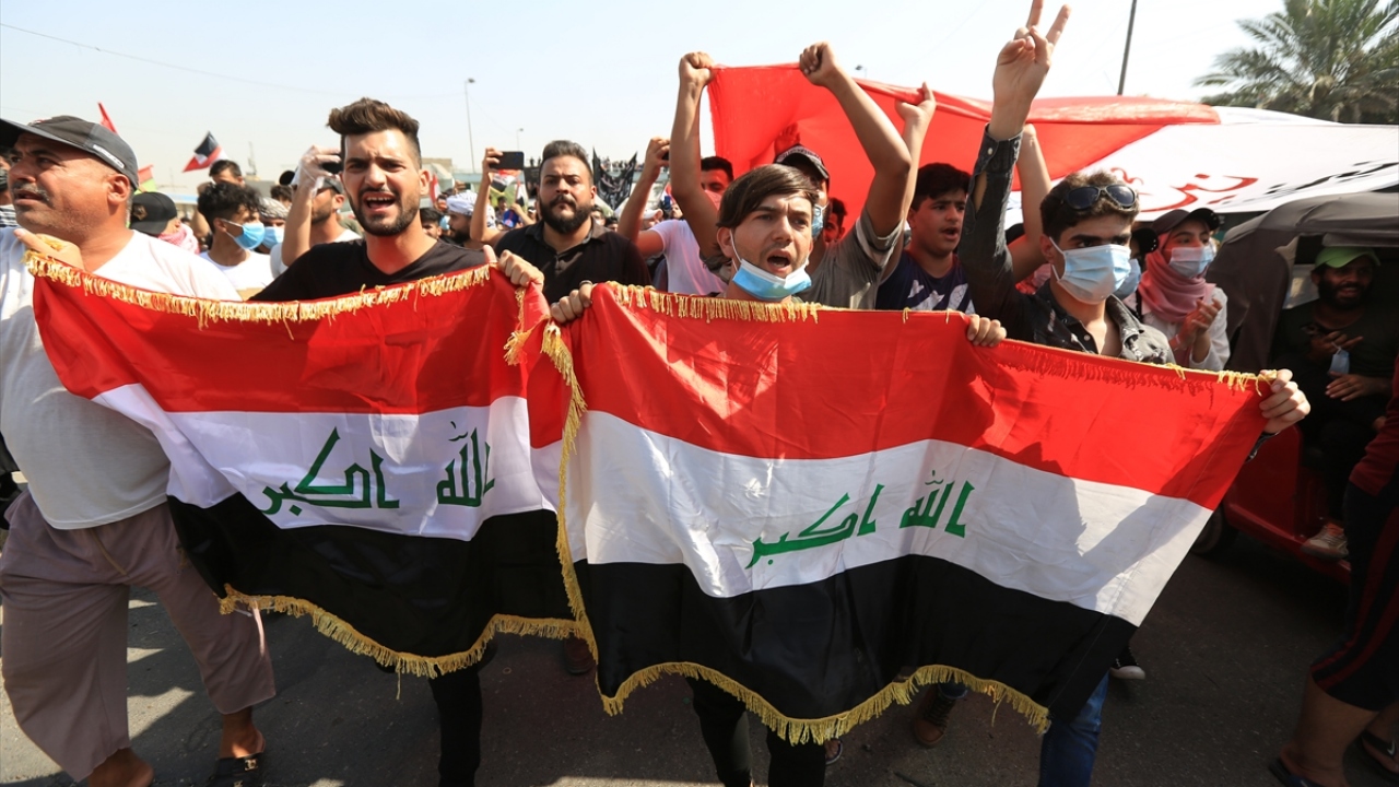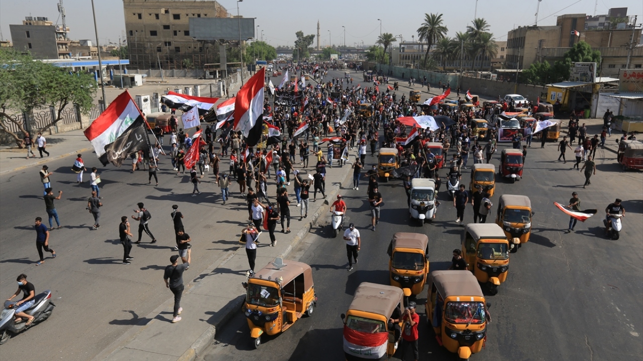 Irak'ın başkenti Bağdat'ta toplanan ve çoğunluğu öğrencilerden oluşan göstericiler, 1 Ekim 2019'da gerçekleştirilen hükümet karşıtı gösterilerin birinci yıl dönümü dolayısıyla Milli Eğitim Bakanlığı binası önünden Tahrir Meydanı'na yürüyüş düzenledi.